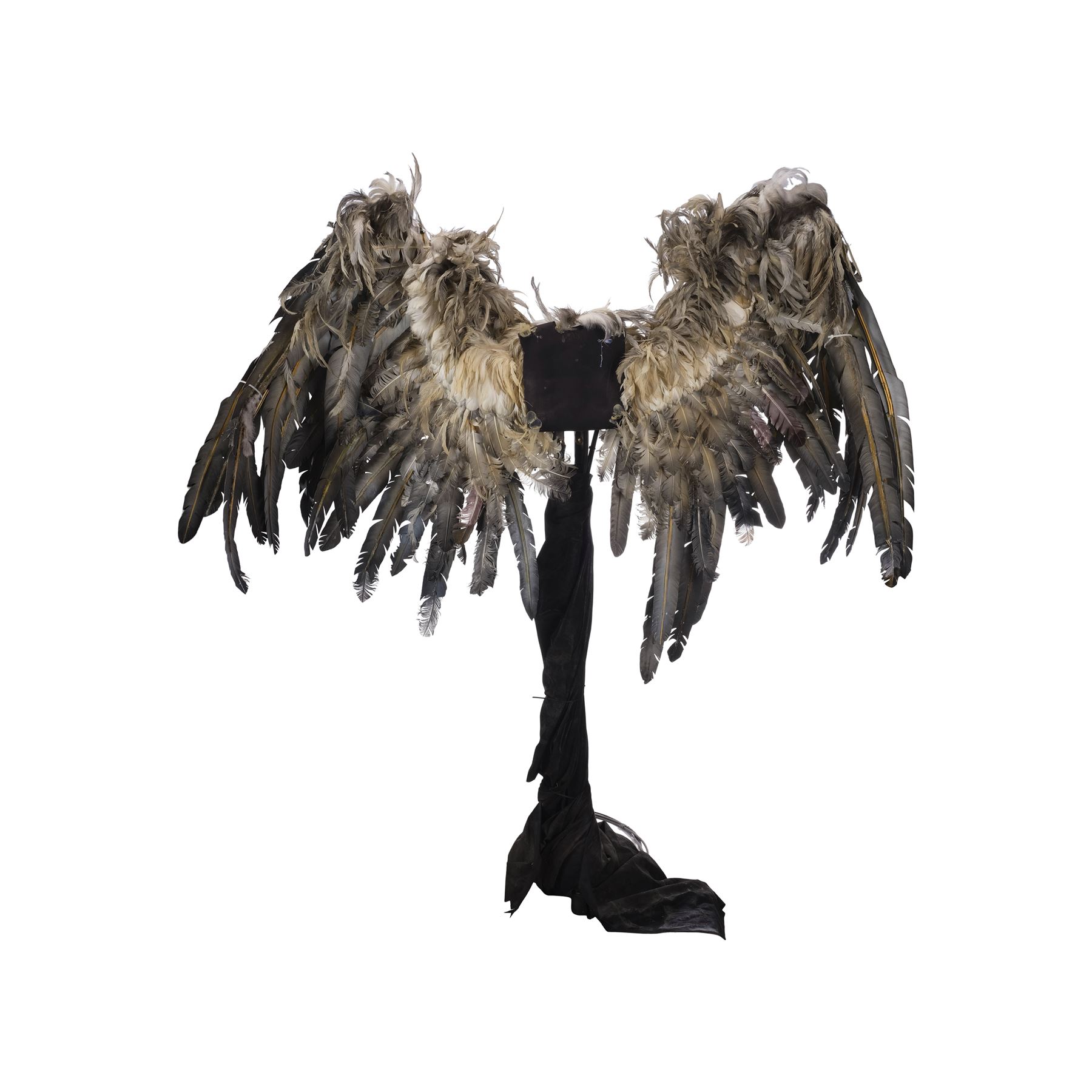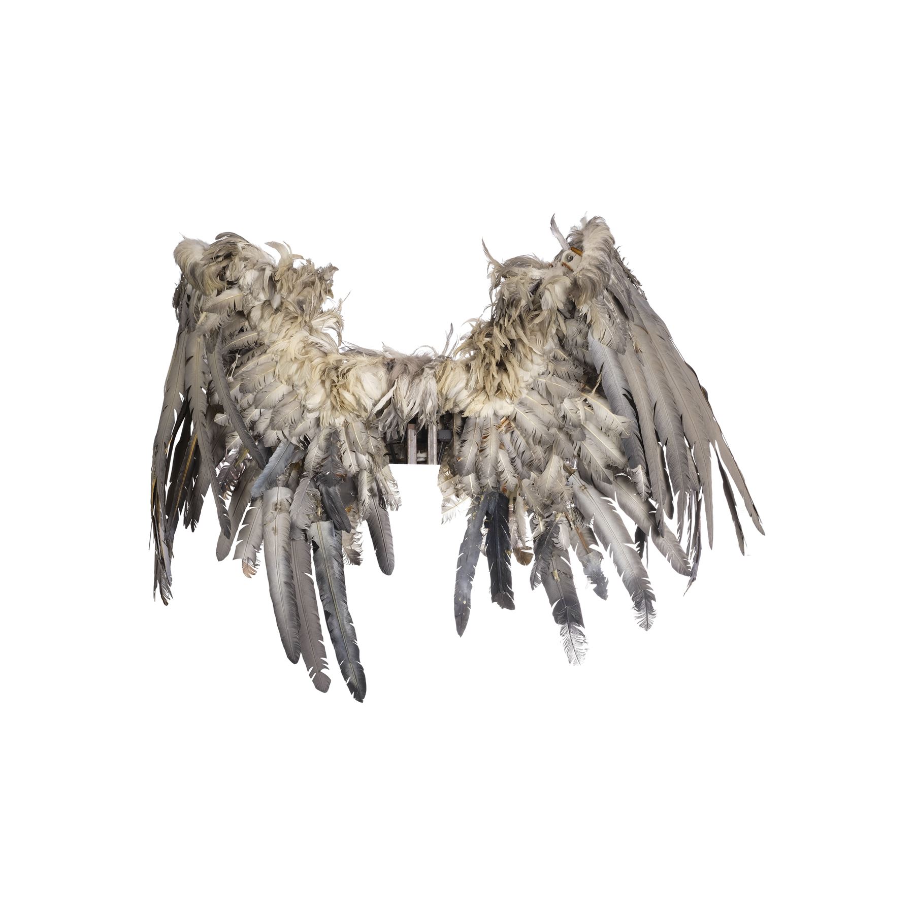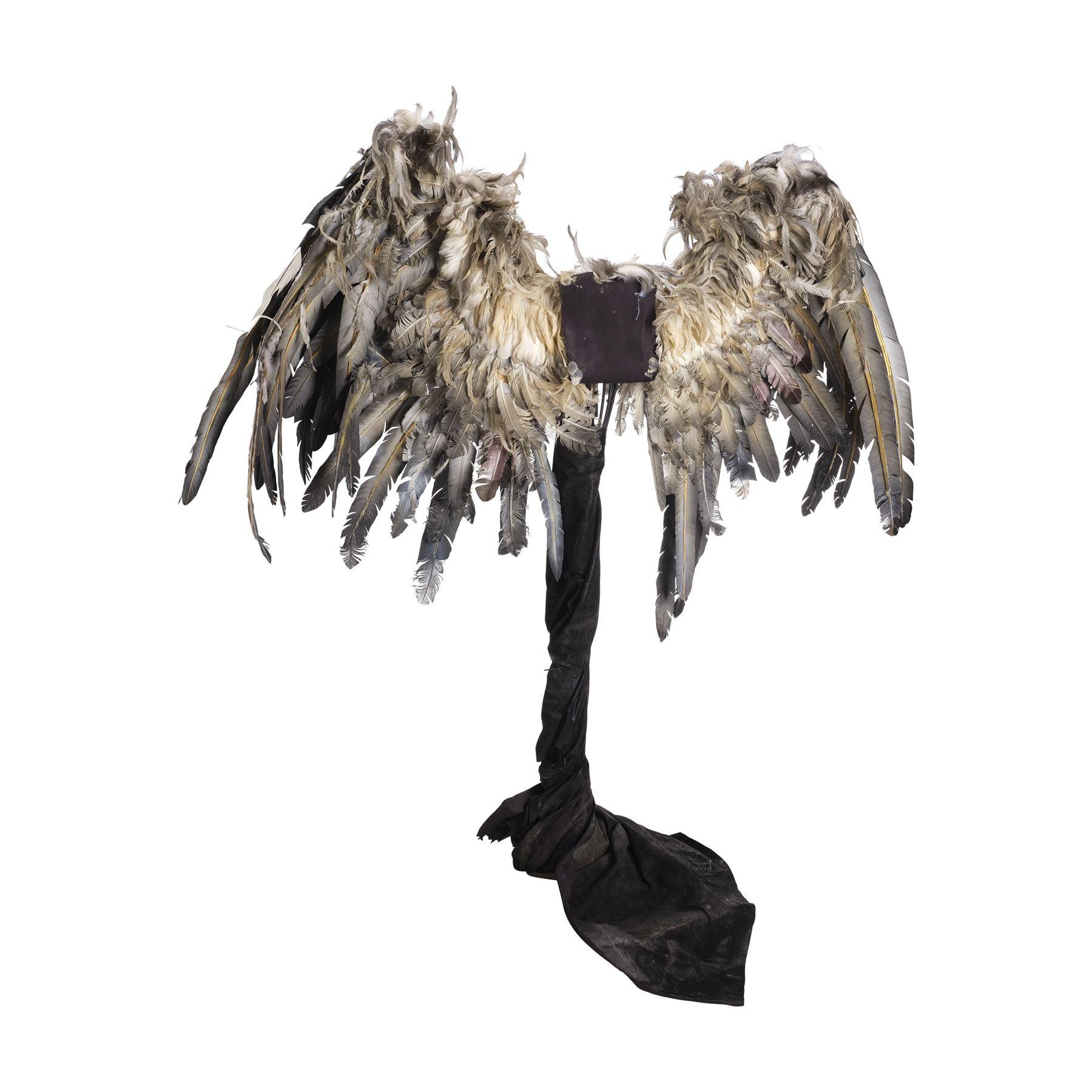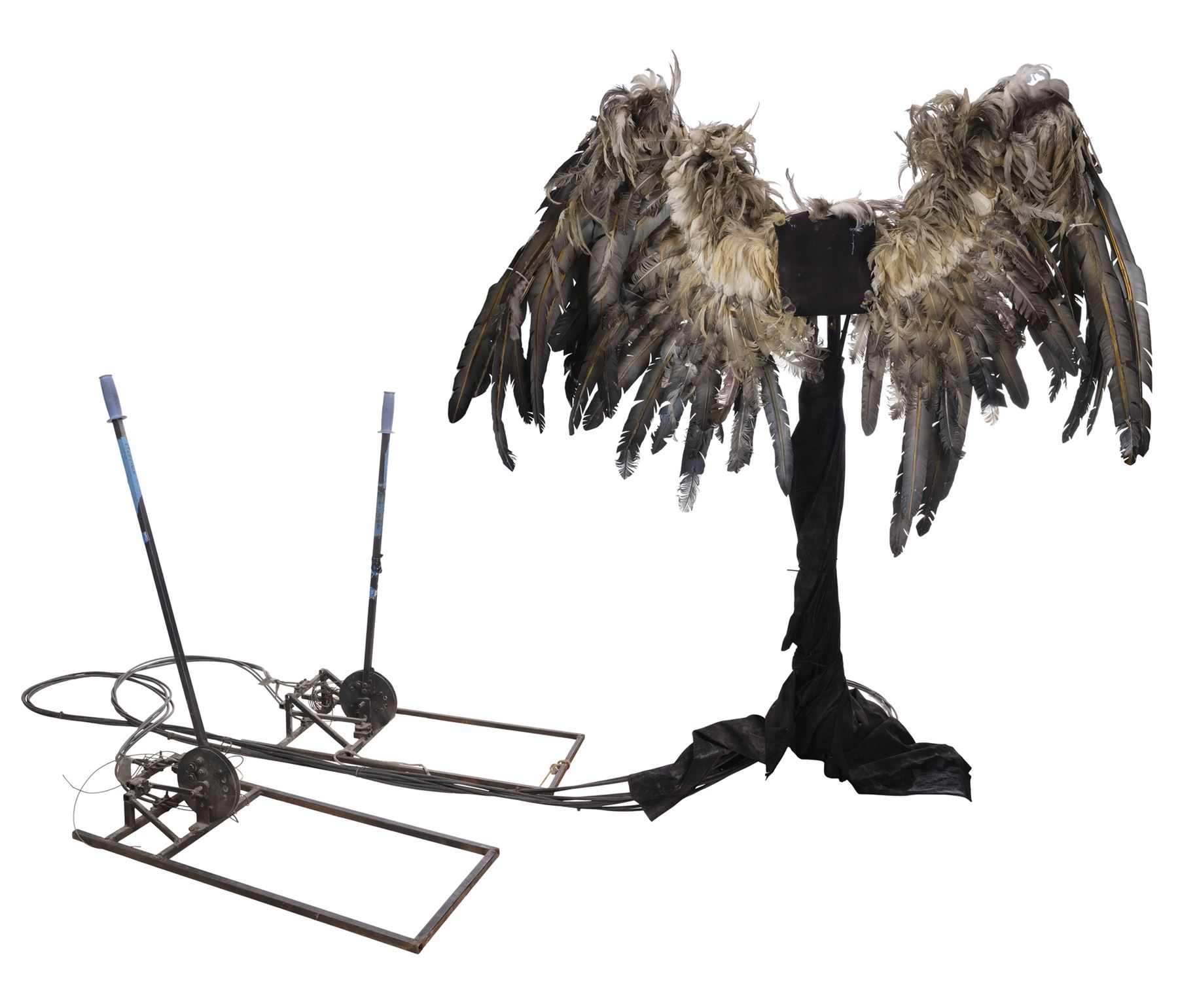 This pair of wings is made of a metal armature with over 20 different positions of movement controlled by two metal levers. These wings are attached to a foam-covered back plate and a metal stand to provide the wings stability, as well as to give the appearance that the wings are attached to the actor. The wings are covered in a combination of short keratin feathers and long thermoplastic flight feathers in various shades from white to gray. This lot exhibits frayed feathers, discoloration, and a buildup of grime. Dimensions: 70" x 18" x 83" (178 cm x 45.75 cm x 211 cm)
