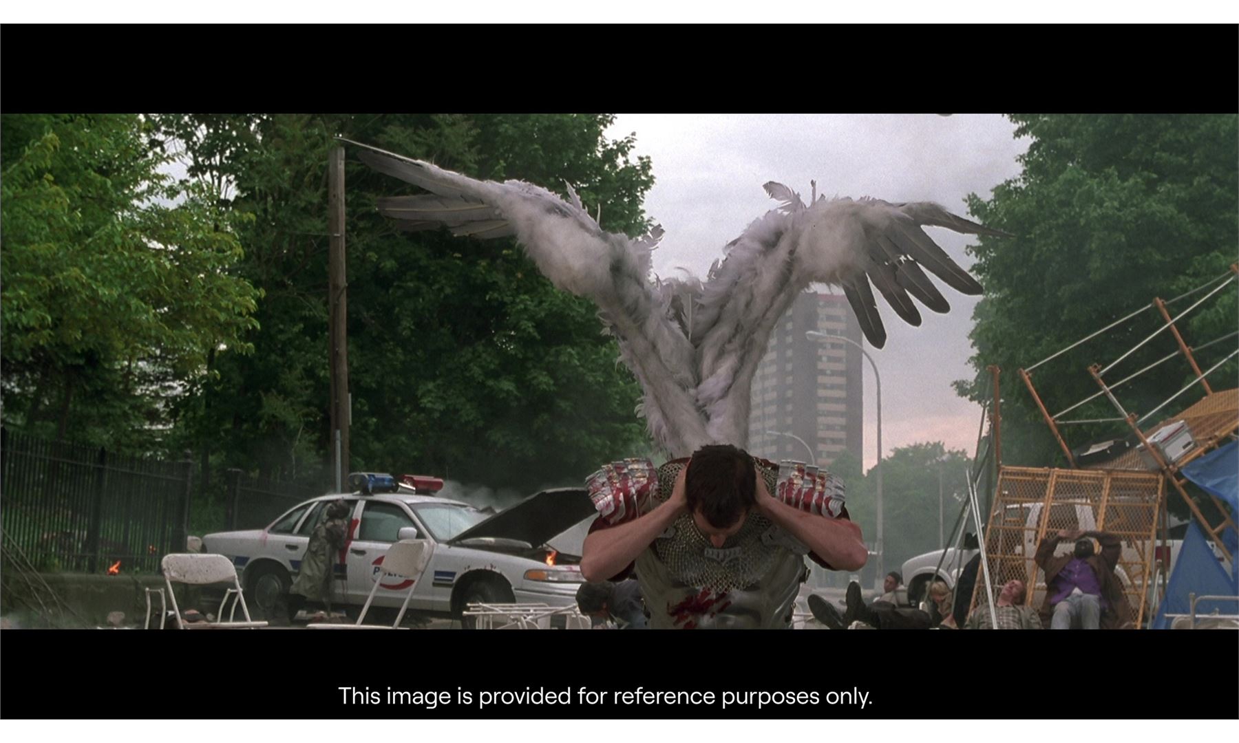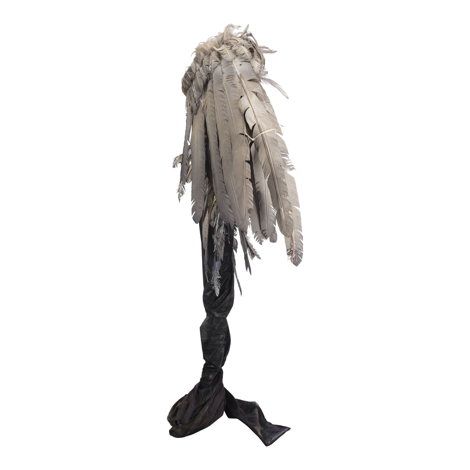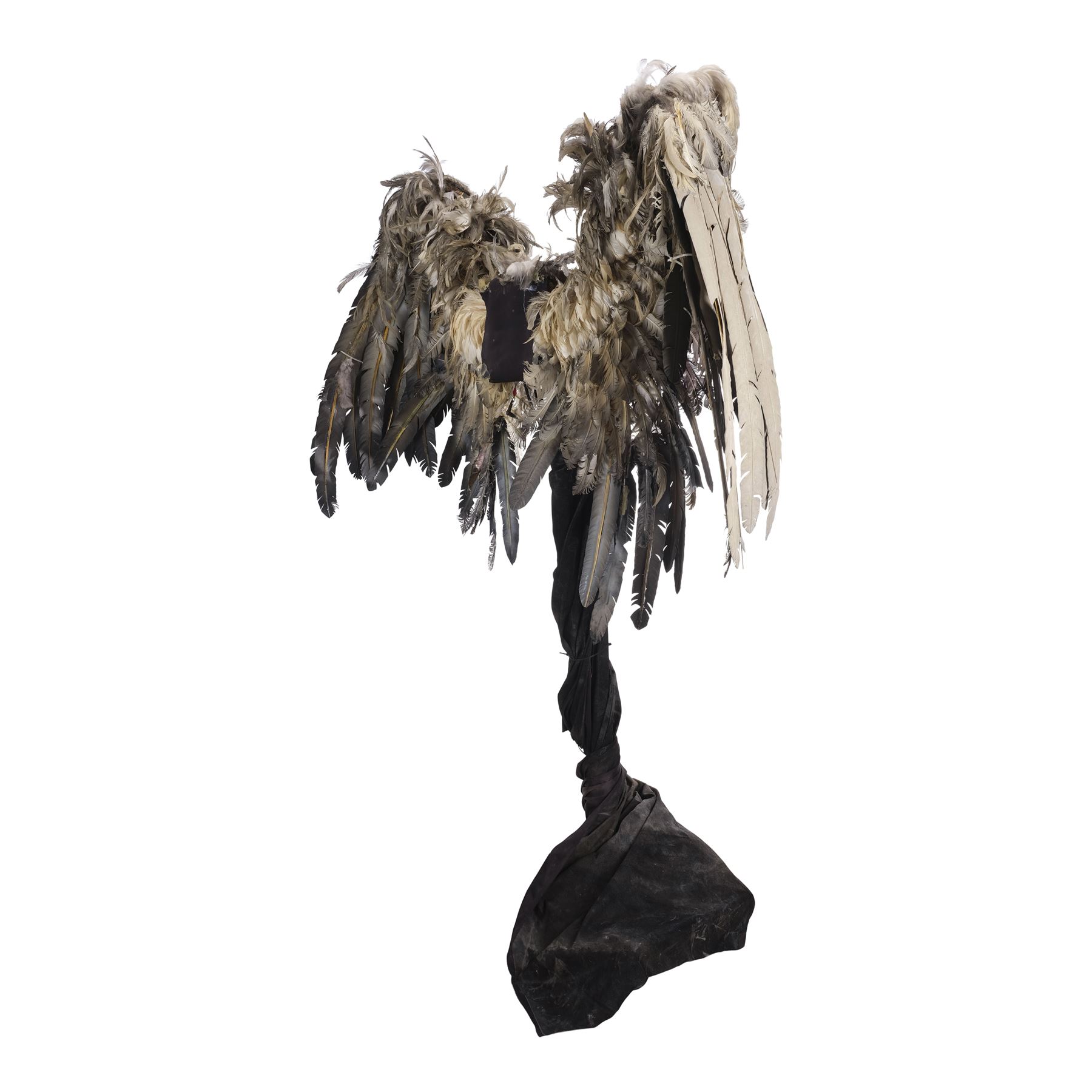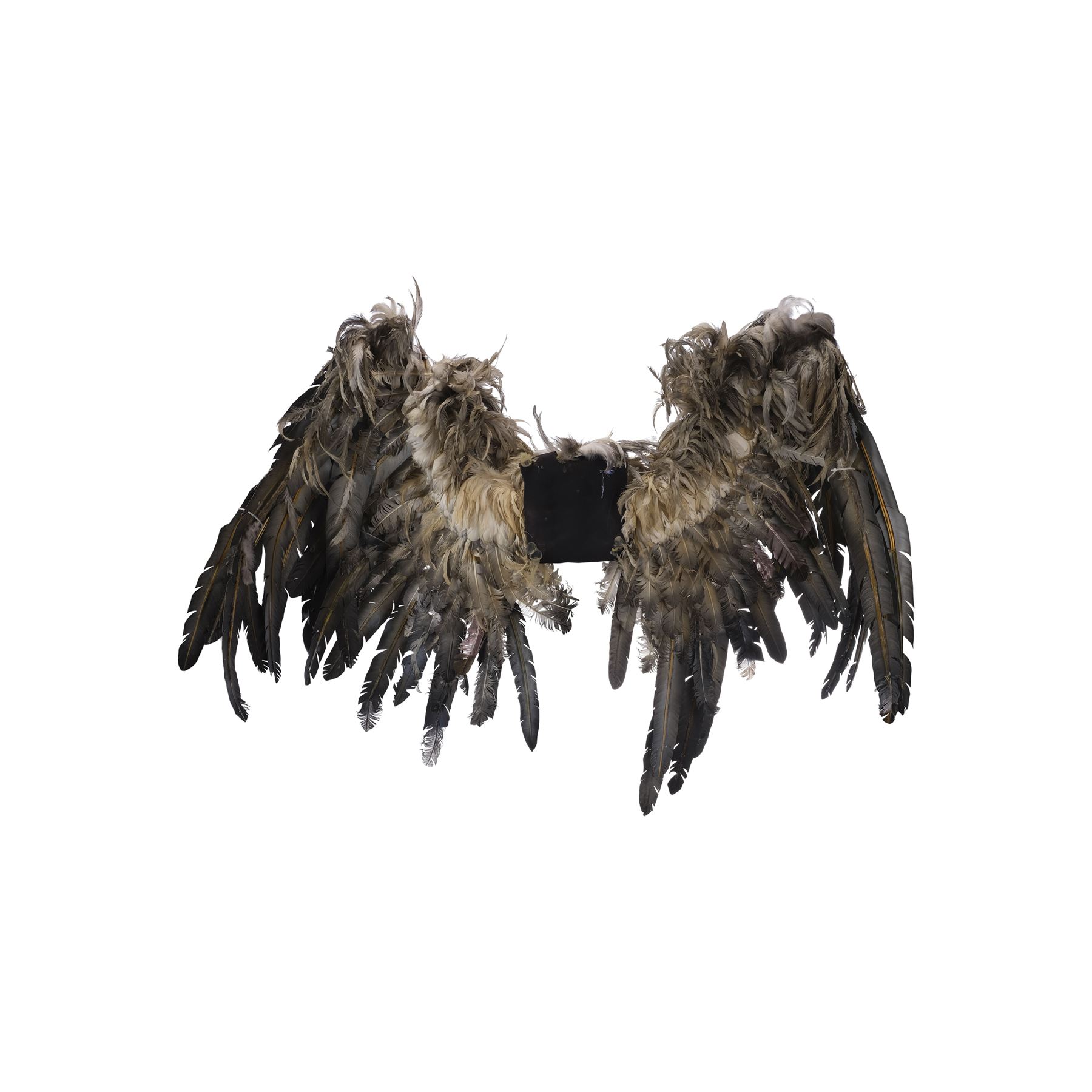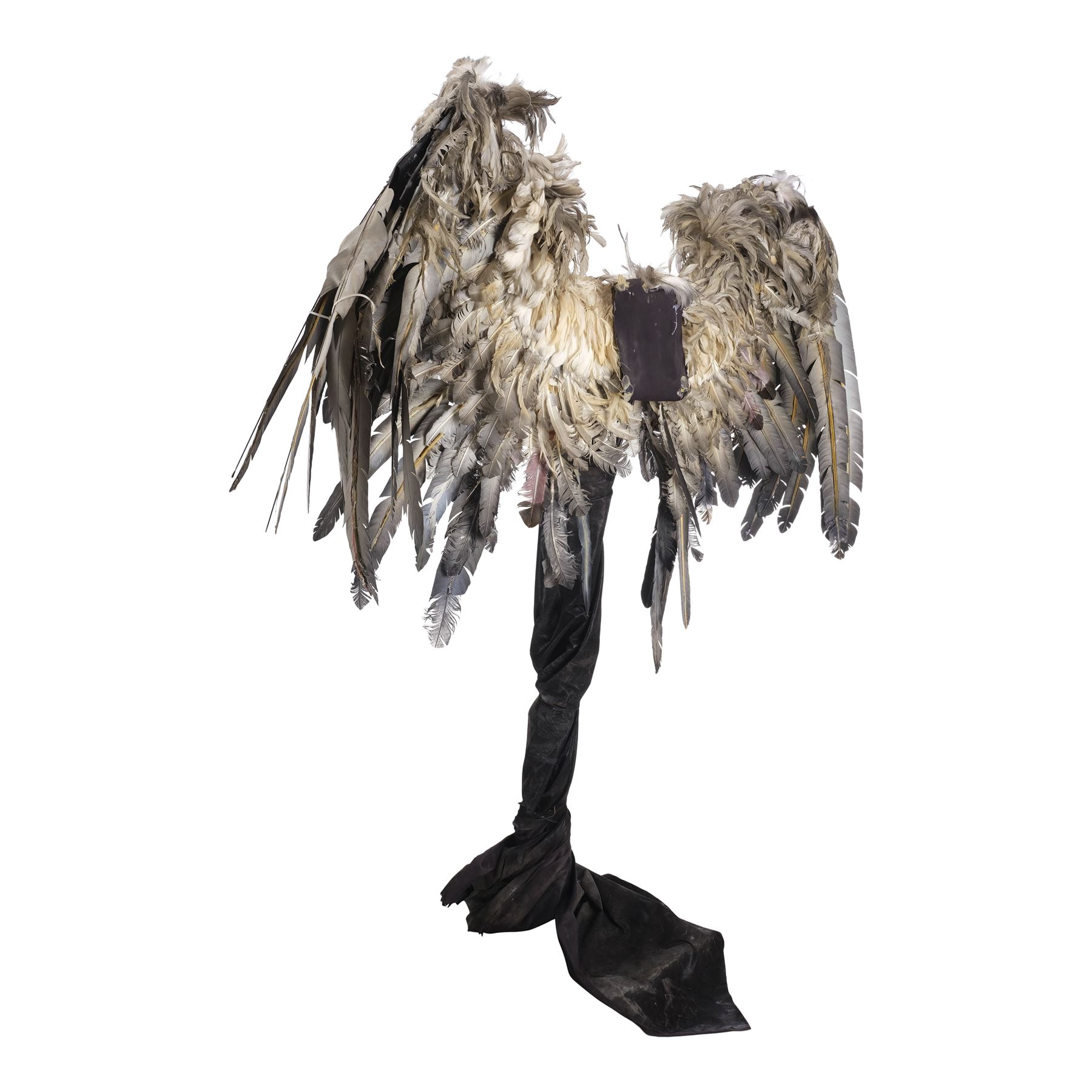 This pair of wings is made of a metal armature with over 20 different positions of movement controlled by two metal levers. These wings are attached to a foam-covered back plate and a metal stand to provide the wings stability, as well as to give the appearance that the wings are attached to the actor. The wings are covered in a combination of short keratin feathers and long thermoplastic flight feathers in various shades from white to gray. This lot exhibits frayed feathers, discoloration, and a buildup of grime. Dimensions: 70" x 18" x 83" (178 cm x 45.75 cm x 211 cm)