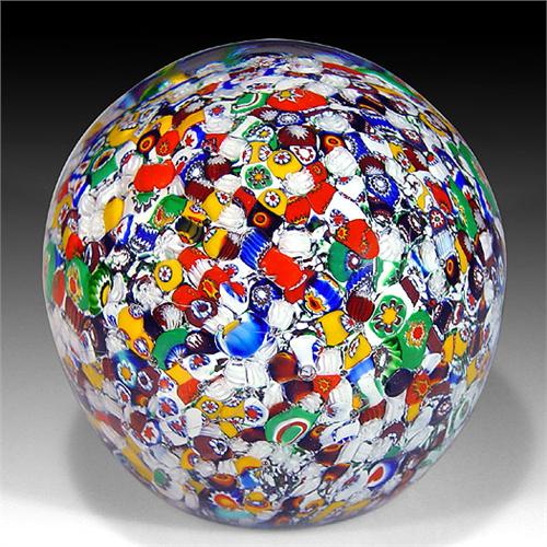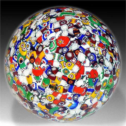 Gentile Glass high-domed close packed millefiori paperweight, with a tumbled assortment of bright-colored, white, and black canes. Stamp signed on the base, "GENTILimited edition GLASS W. VA." Diameter 3 1/4". Minor surface scratches. NO RESERVE