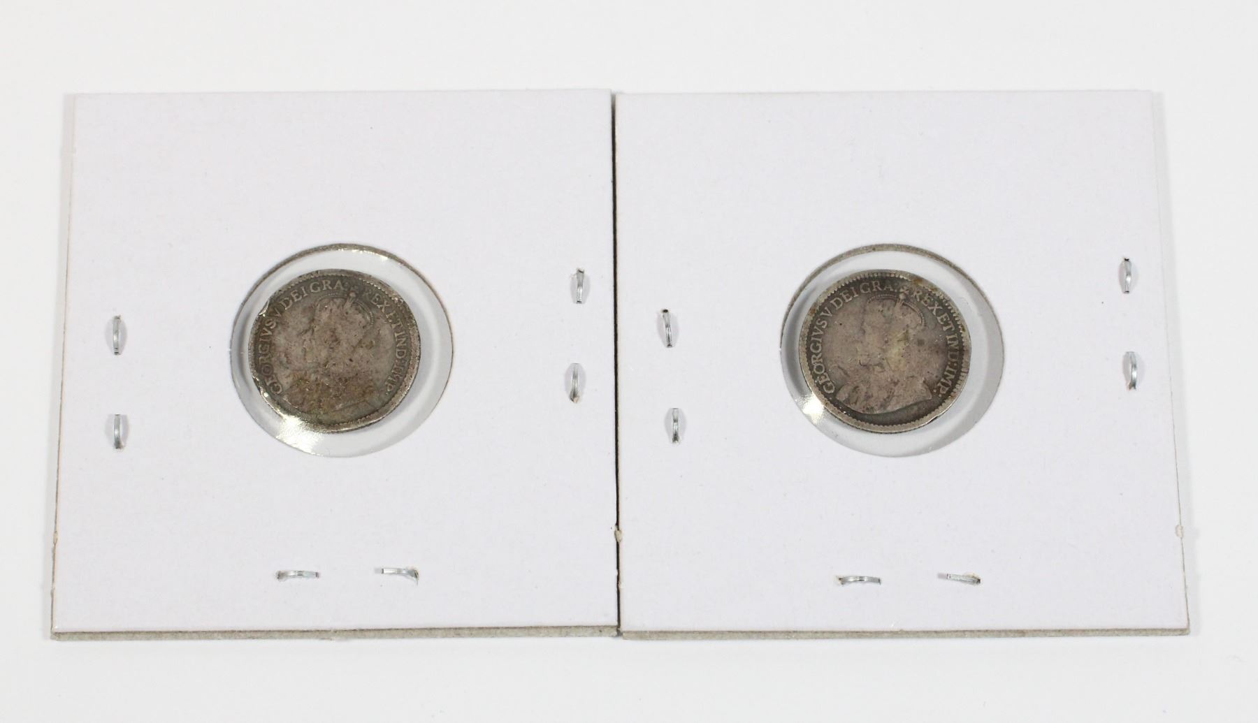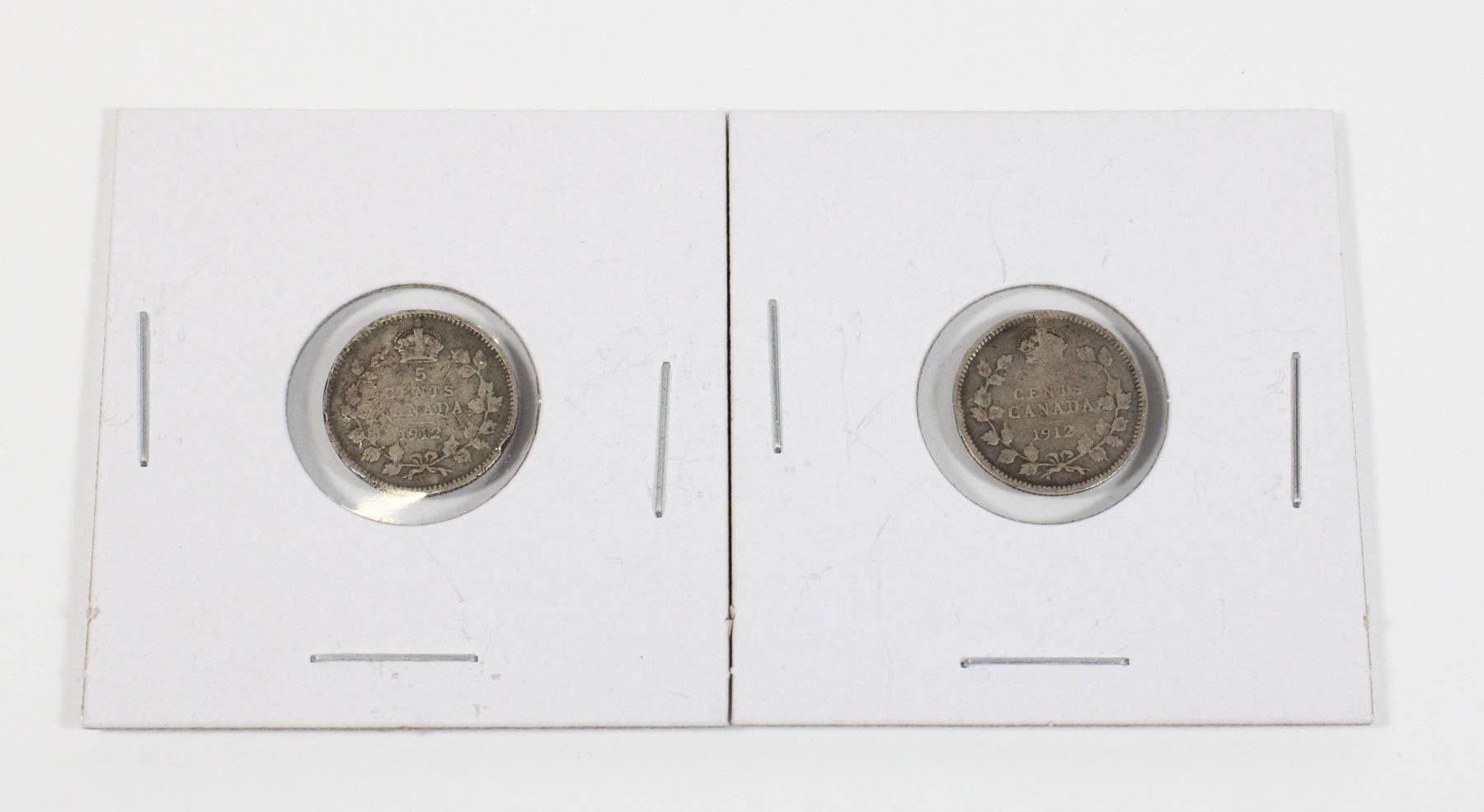 #103 LOT OF 2 1912 CANADA 5 CENTS SILVER COIN DIME