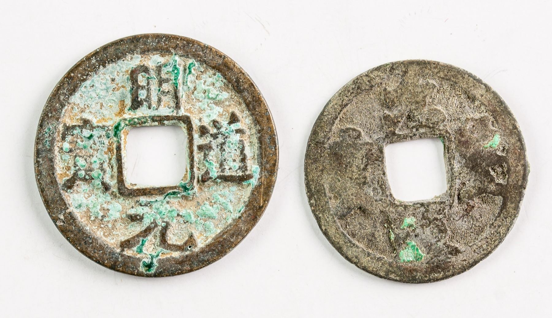 Two (2) assorted Chinese 1 Cash bronze coin, one 1032-1033 Northern Song Mingdao Tongbao, Hartill 16.84, one 1078-1075 Northern Song Yuanfeng Tongbao, Hartill 16.236, D: 23.1-25.3 mm, 6.49 grams total