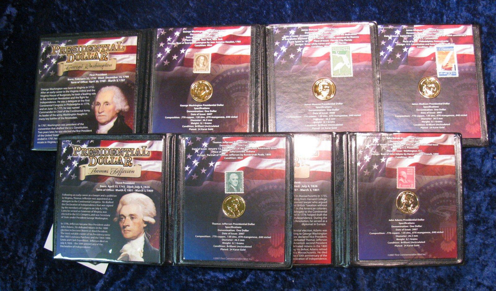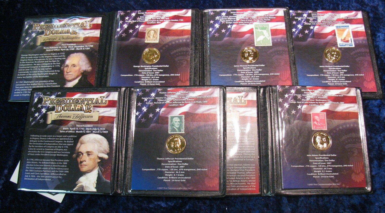 1032. First 5-Presidential Dollars 24K Gold Plated in Fancy Booklets.