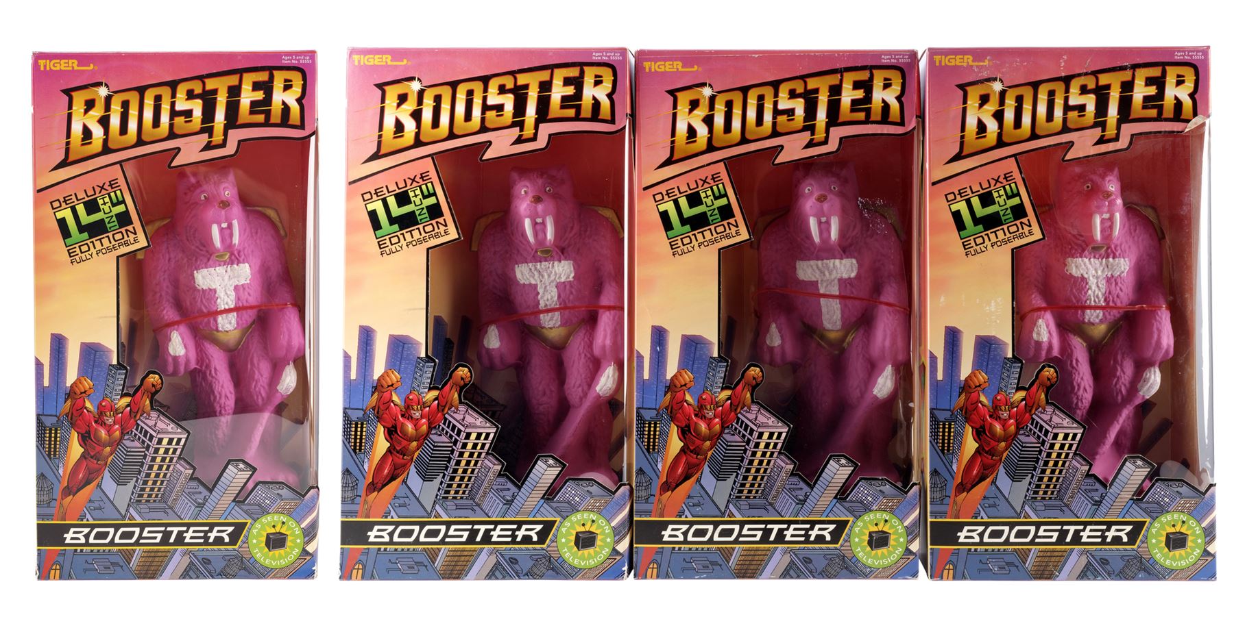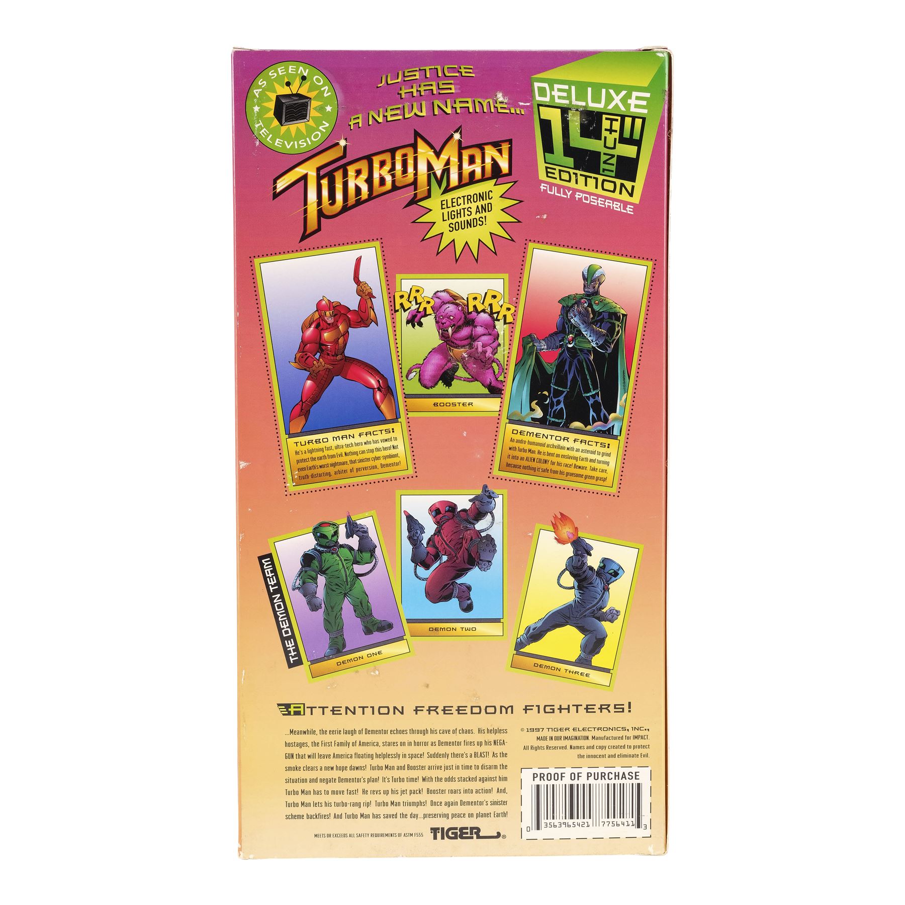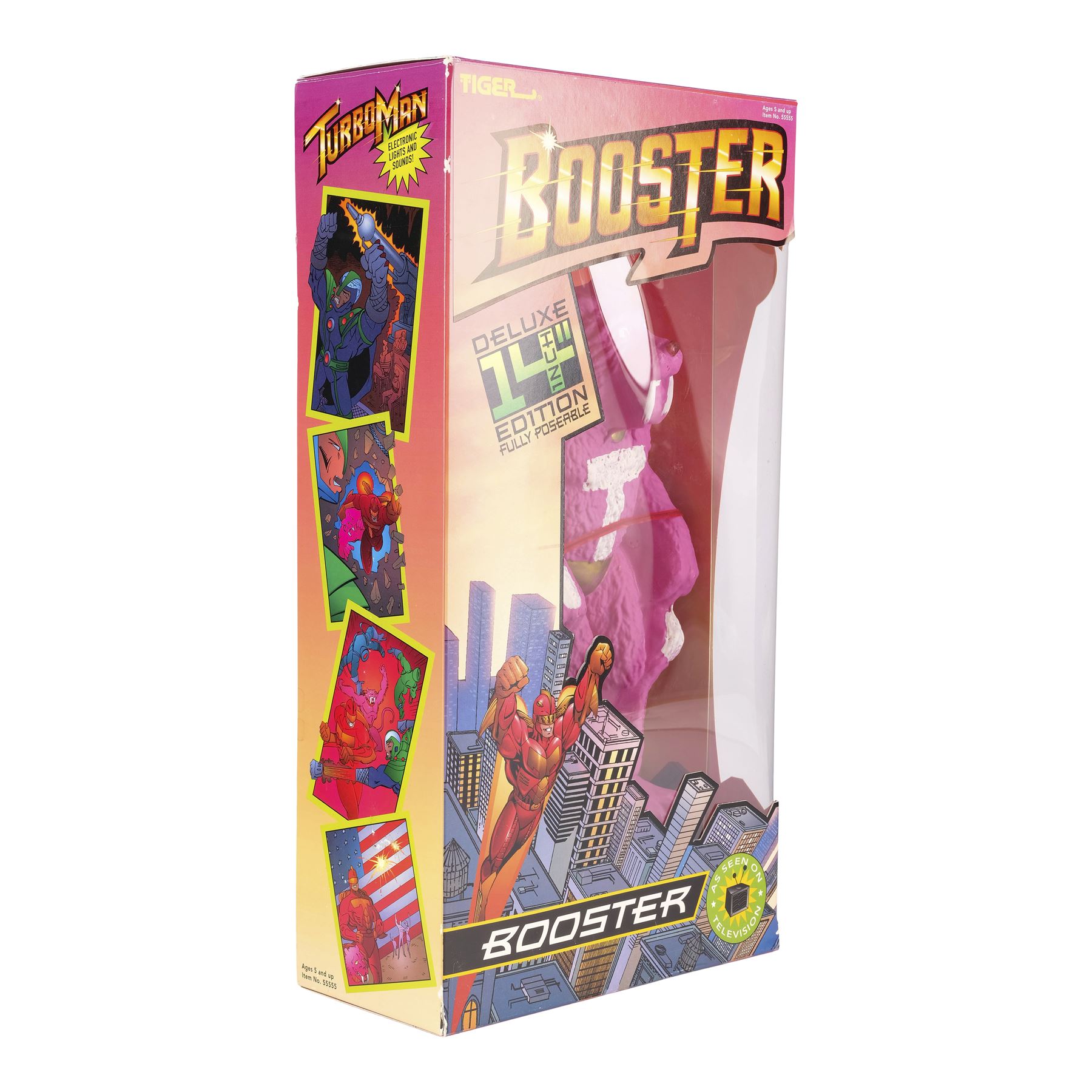 This set consists of four vacuum-formed plastic "deluxe edition" Booster action figures tied with wire into custom-made, Tiger-branded cardboard toy boxes. Each box features a plastic window on front with a "Proof of Purchase" barcode and an advertisement for the larger TurboMan toy line on the reverse. The boxes exhibit minor edge wear from production and handling. Dimensions: (each) 8.5" x 4.5" x 16" (21.75 cm x 11.5 cm x 40.75 cm)