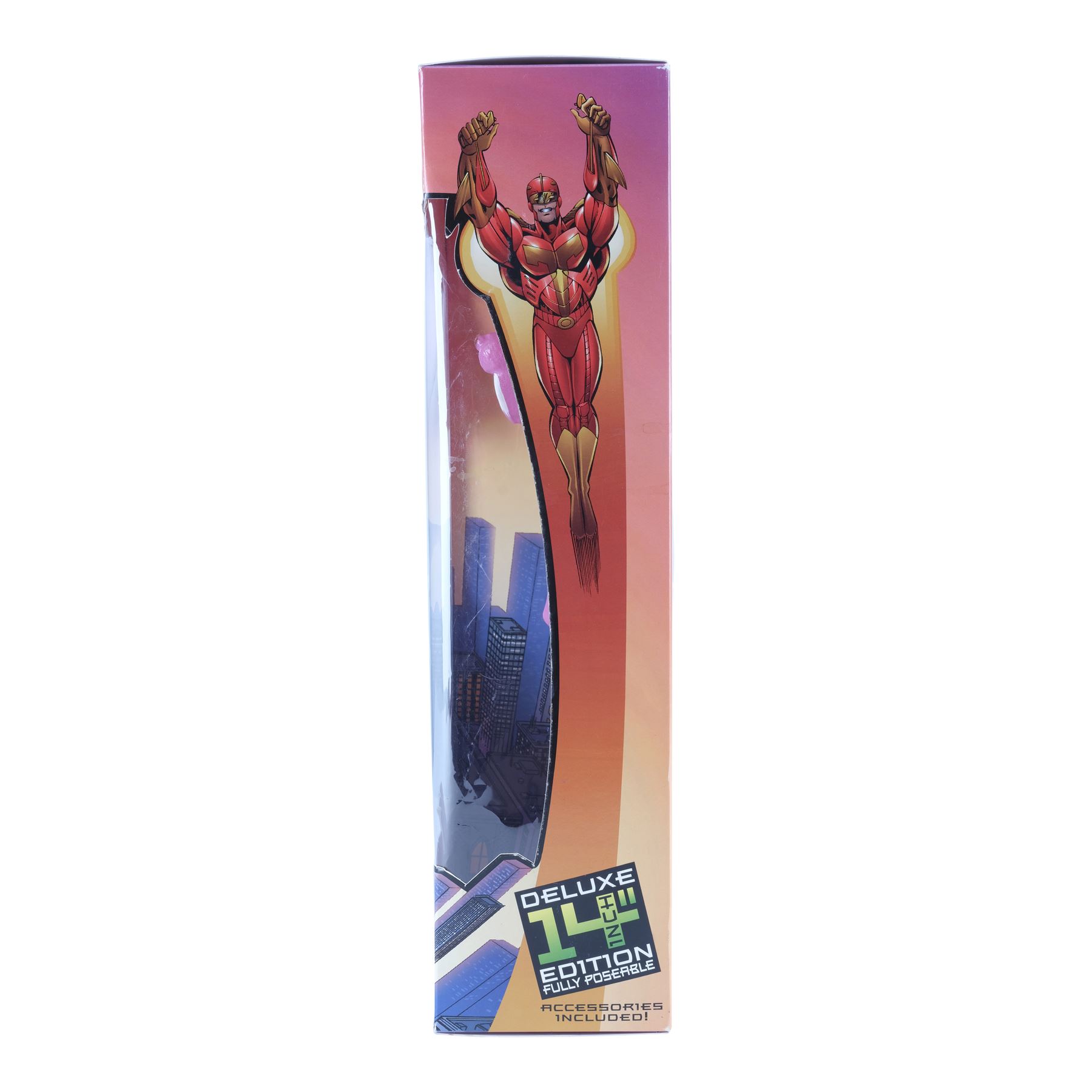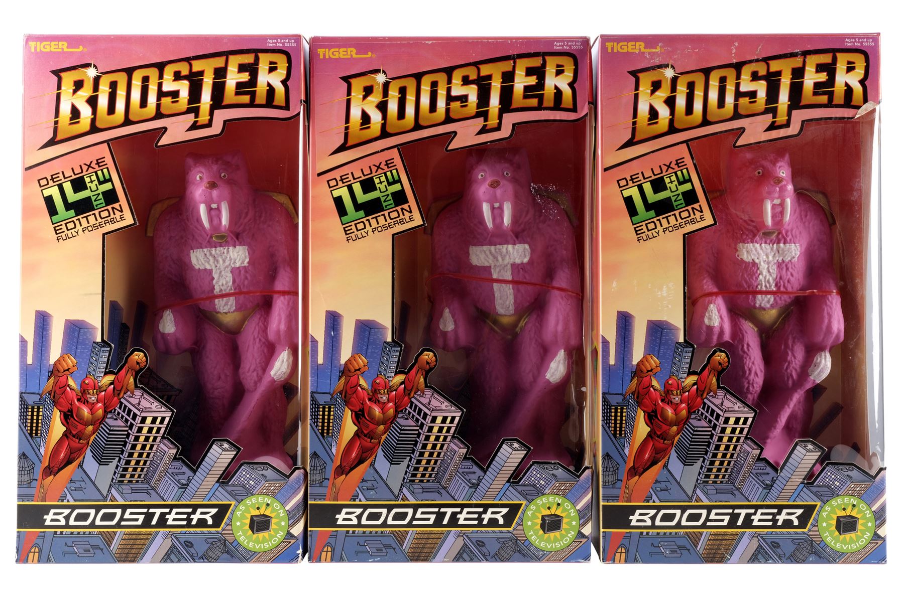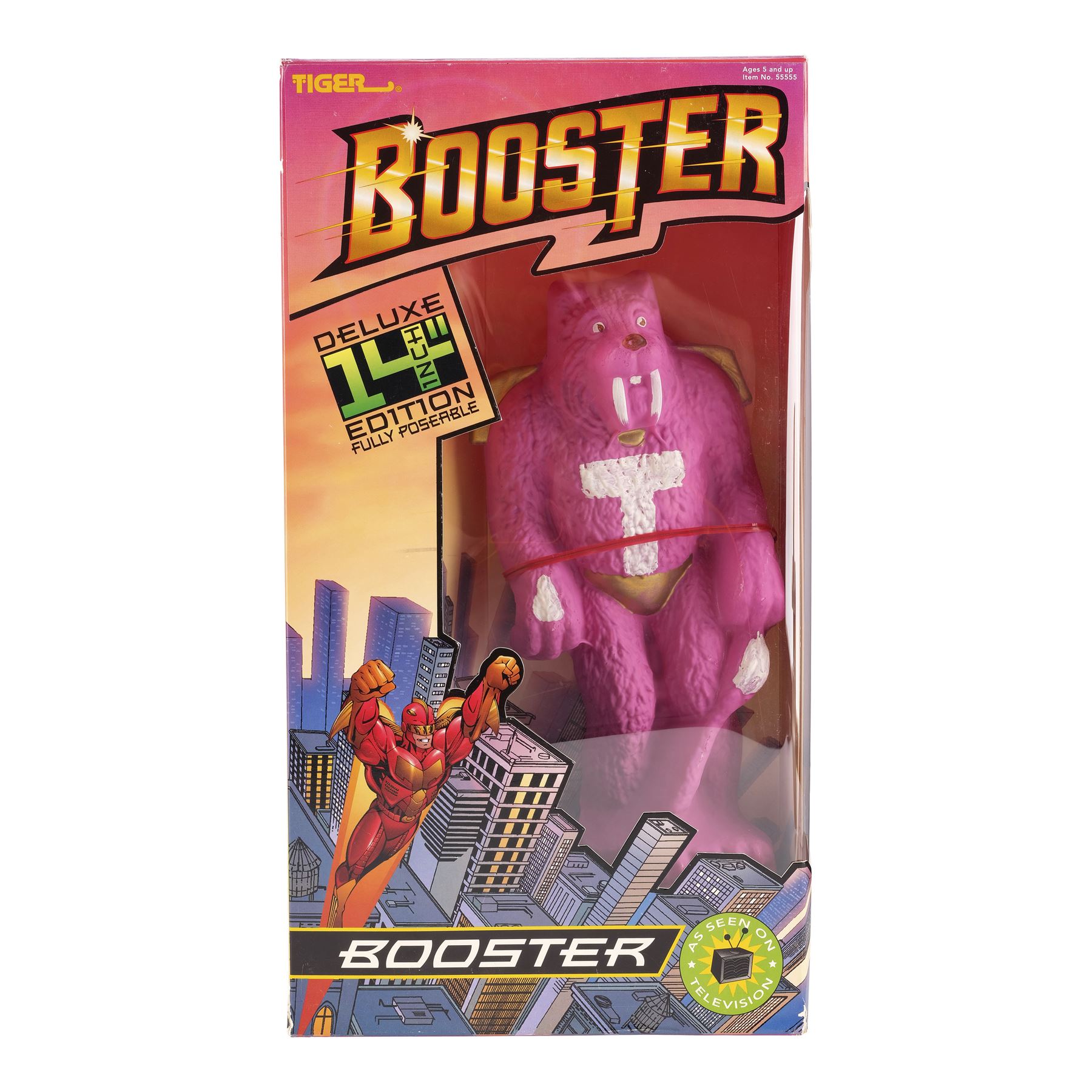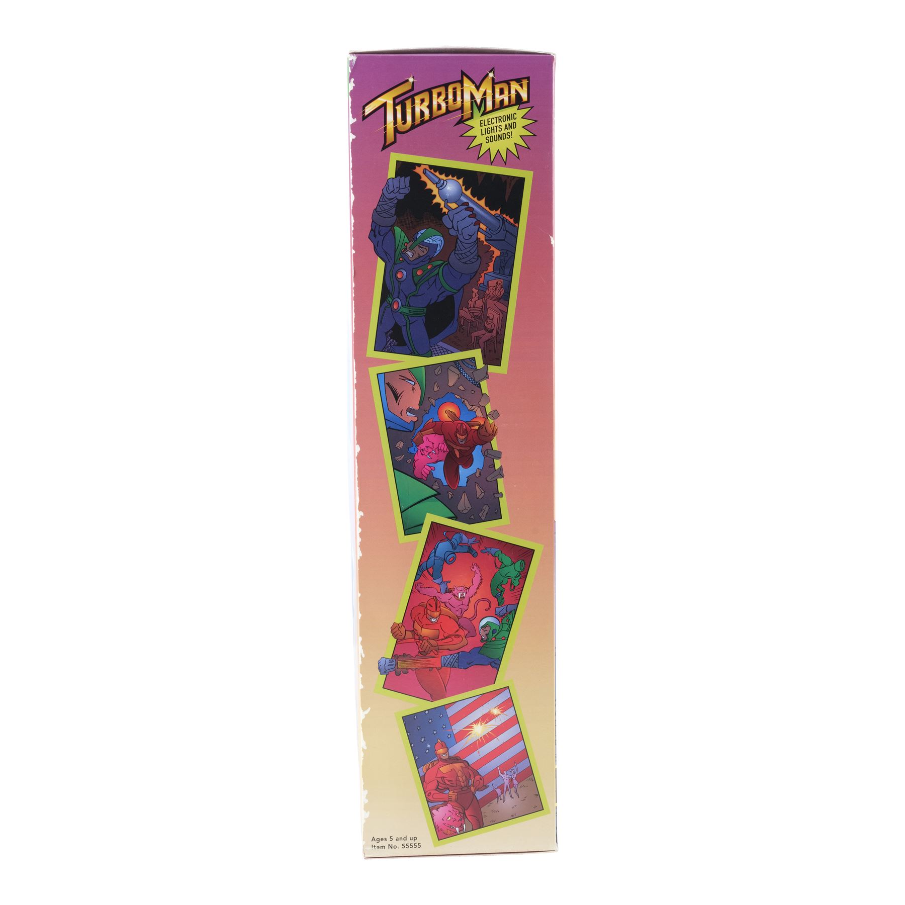 This set consists of four vacuum-formed plastic "deluxe edition" Booster action figures tied with wire into custom-made, Tiger-branded cardboard toy boxes. Each box features a plastic window on front with a "Proof of Purchase" barcode and an advertisement for the larger TurboMan toy line on the reverse. The boxes exhibit minor edge wear from production and handling. Dimensions: (each) 8.5" x 4.5" x 16" (21.75 cm x 11.5 cm x 40.75 cm)