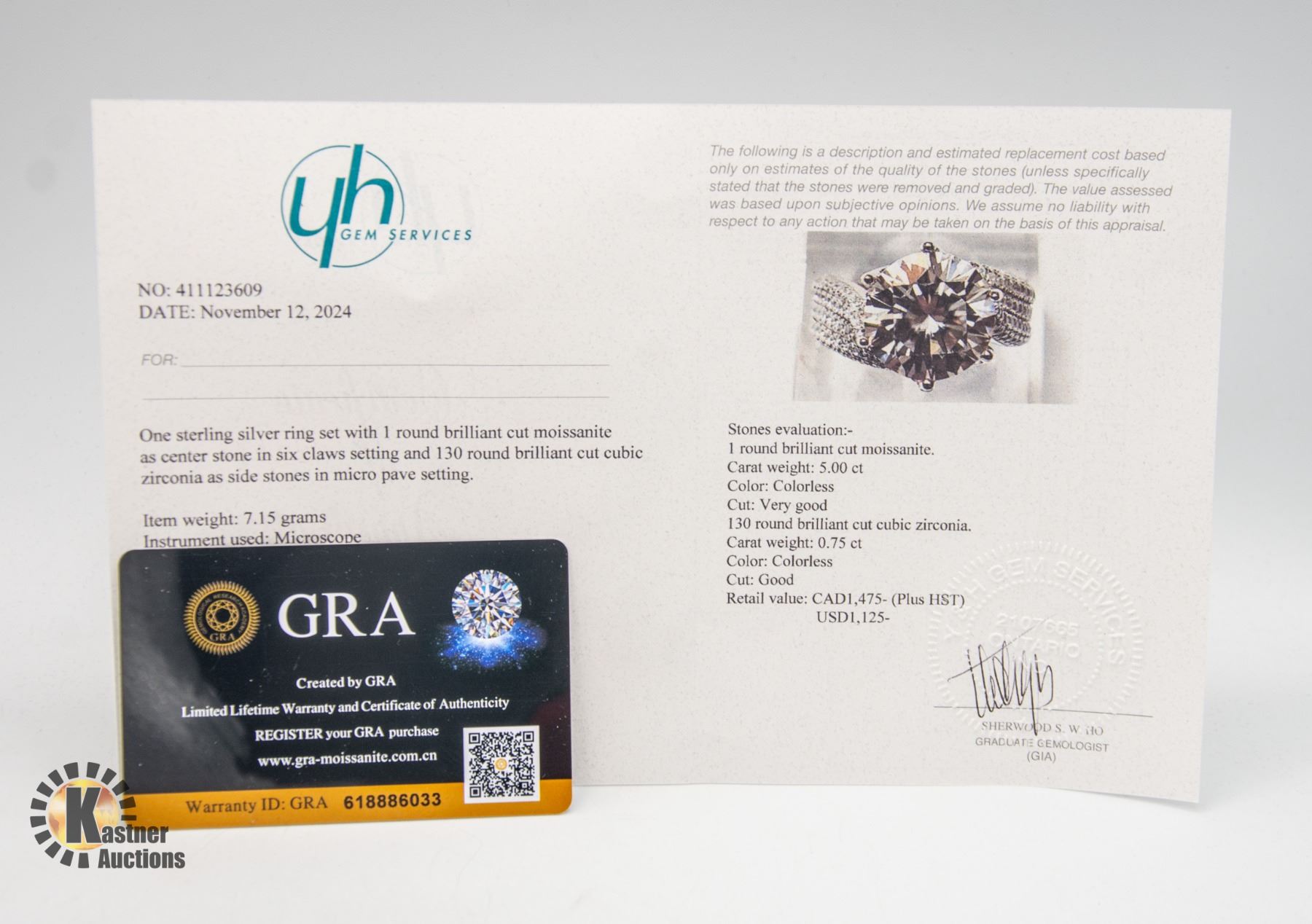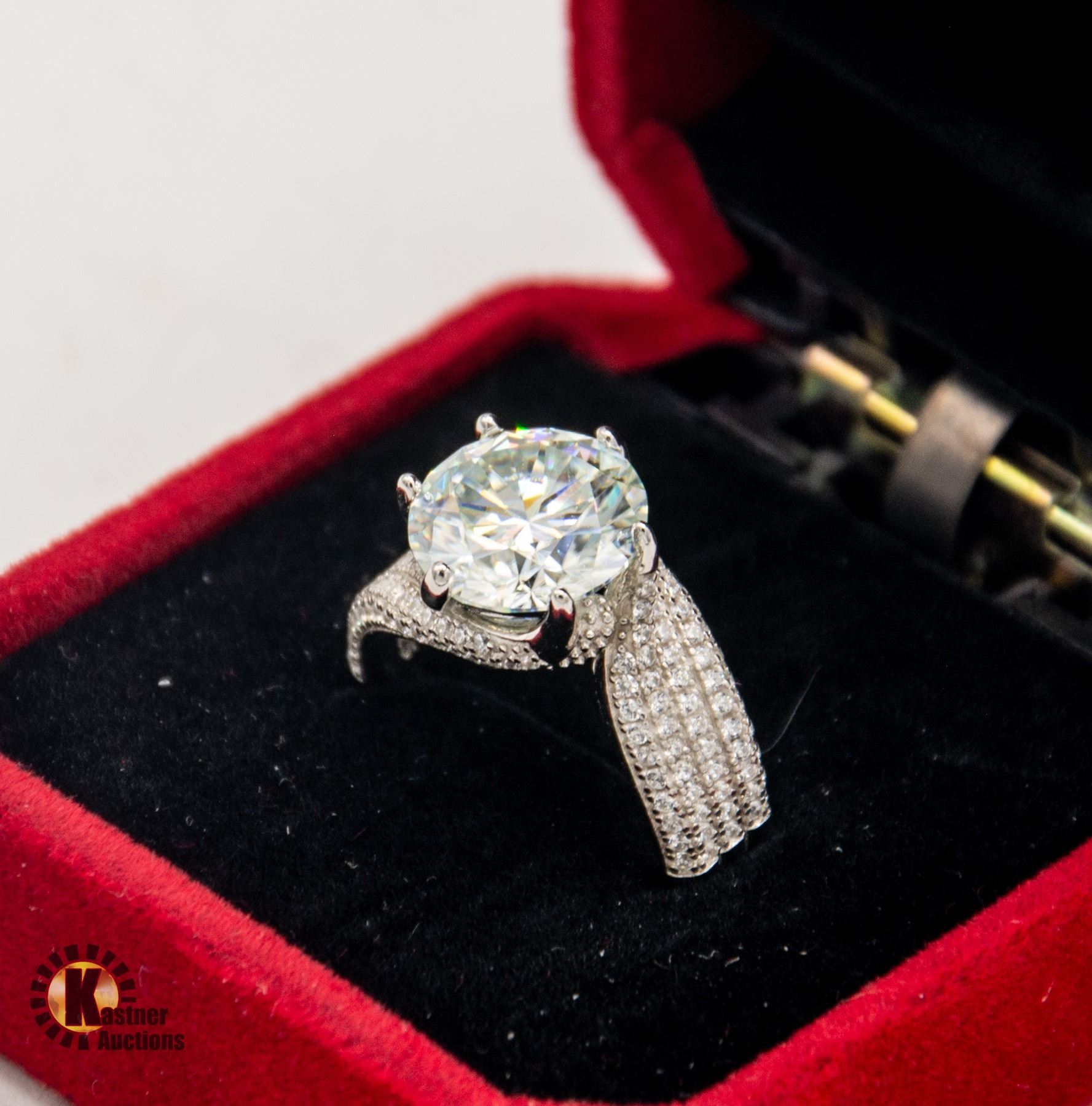 MOISSANITE STONE VVS D COLOR SET IN CENTER WITH 130 ROUND BRILLIANT CUT CUBIC ZIRCONIUM SET IN 925 SILVER RING SIZE 8 RETAIL VALUE $1,475.00 **ALL ITEMS MUST BE REMOVED BY 5PM SATURDAY, DECEMBER 7TH 2024. ALL REMAINING ITEMS WILL BE SUBJECT TO A $6.00 PER DAY STORAGE CHARGE. ANY ITEMS REMAINING AFTER MONDAY, DECEMBER 23RD 2024 WILL BE CONSIDERED FORFEITED. NO REFUNDS WILL BE ISSUED FOR FORFEITED ITEMS. TO SCHEDULE A PICK UP APPOINTMENT CLICK HERE