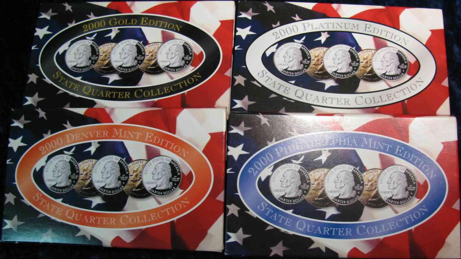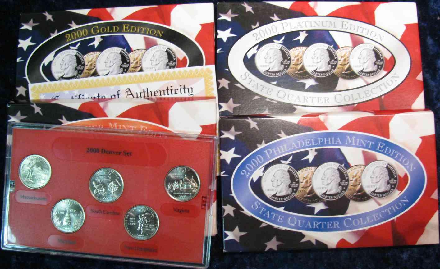 1035. 2000P, D, Gold & Platinum Statehood Quarter Sets. In Plastic Holders and Boxes.