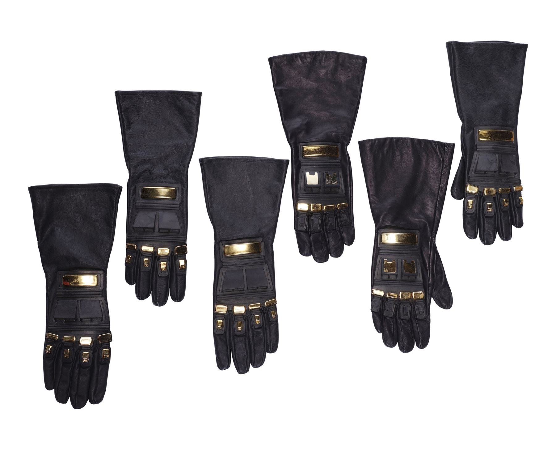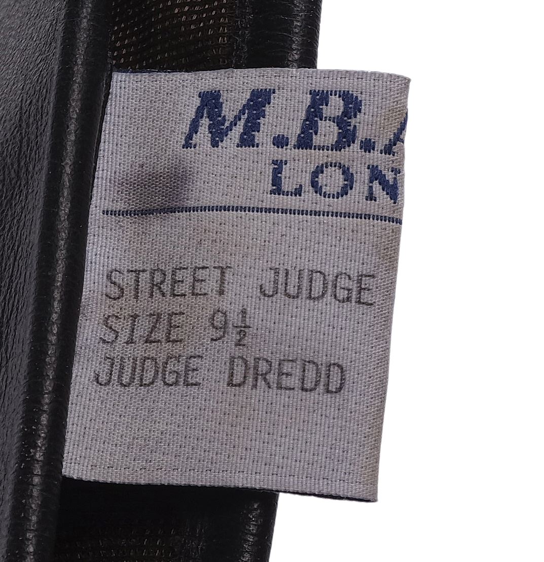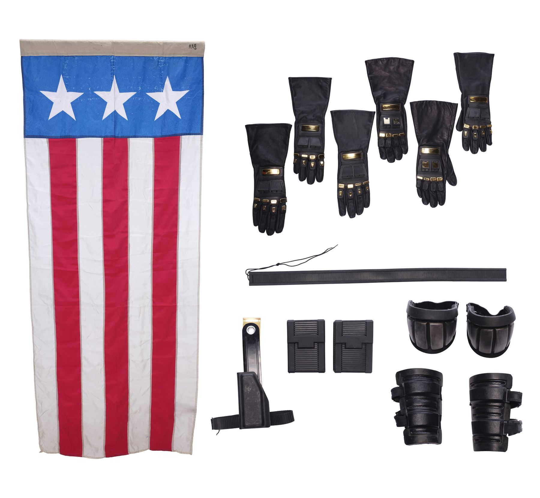 This lot consists of a pair of black foam rubber gauntlets; six pairs of black leather gloves with foam rubber and resin black and gold-color appliances; a black rubber belt; a plastic gun holster with two ammo storage clips; and black foam rubber knee pads. The gloves and knee pads feature a "M.B.A. Ltd." wardrobe label reading "Street Judge'' with the numbers "06027" and "06032." Also included are two red, white, and blue polyester flags, with one hand-labeled "BVH." This lot exhibits a buildup of grime and flaking paint. Dimensions: (flags) 90" x 45" (228.75 cm x 114.5 cm)