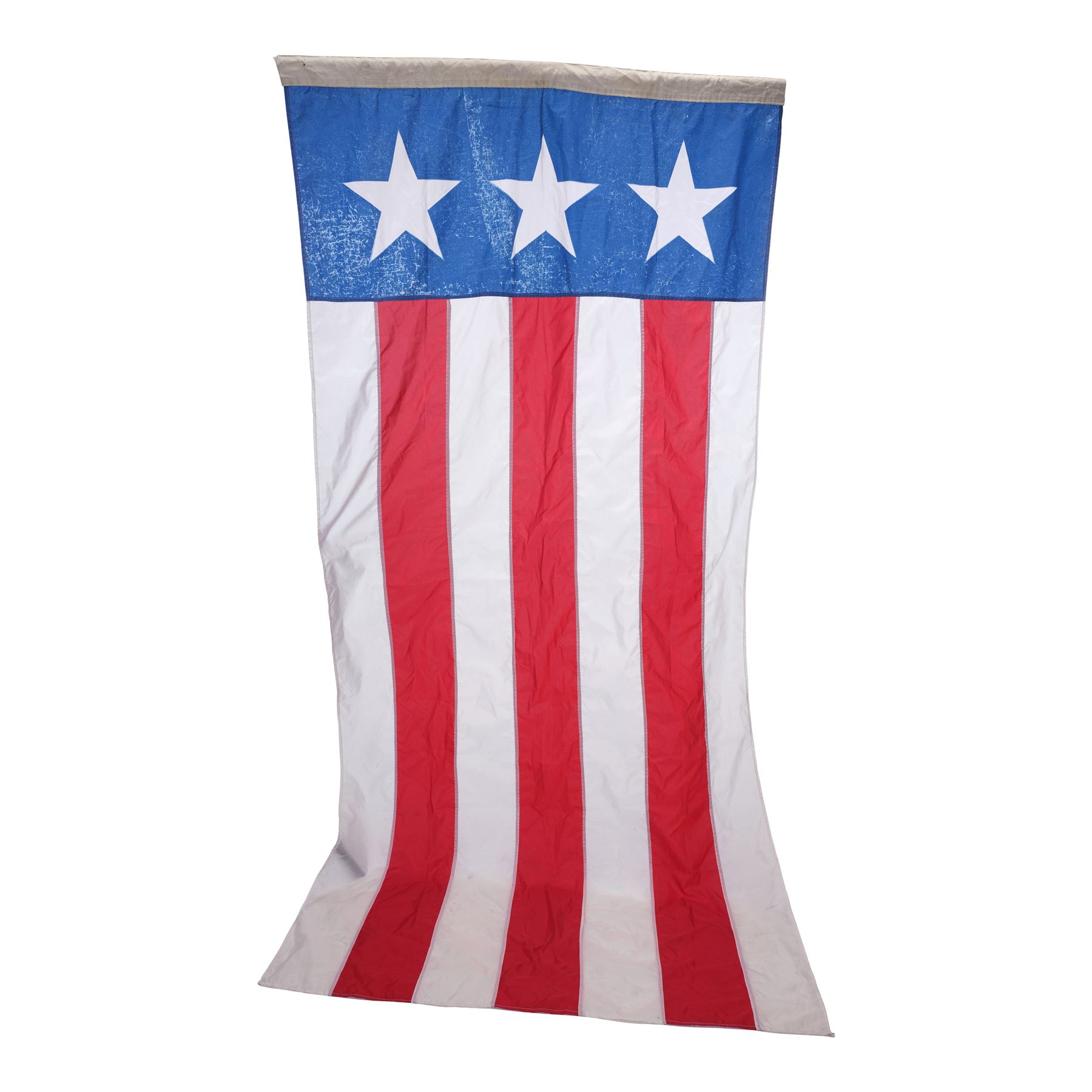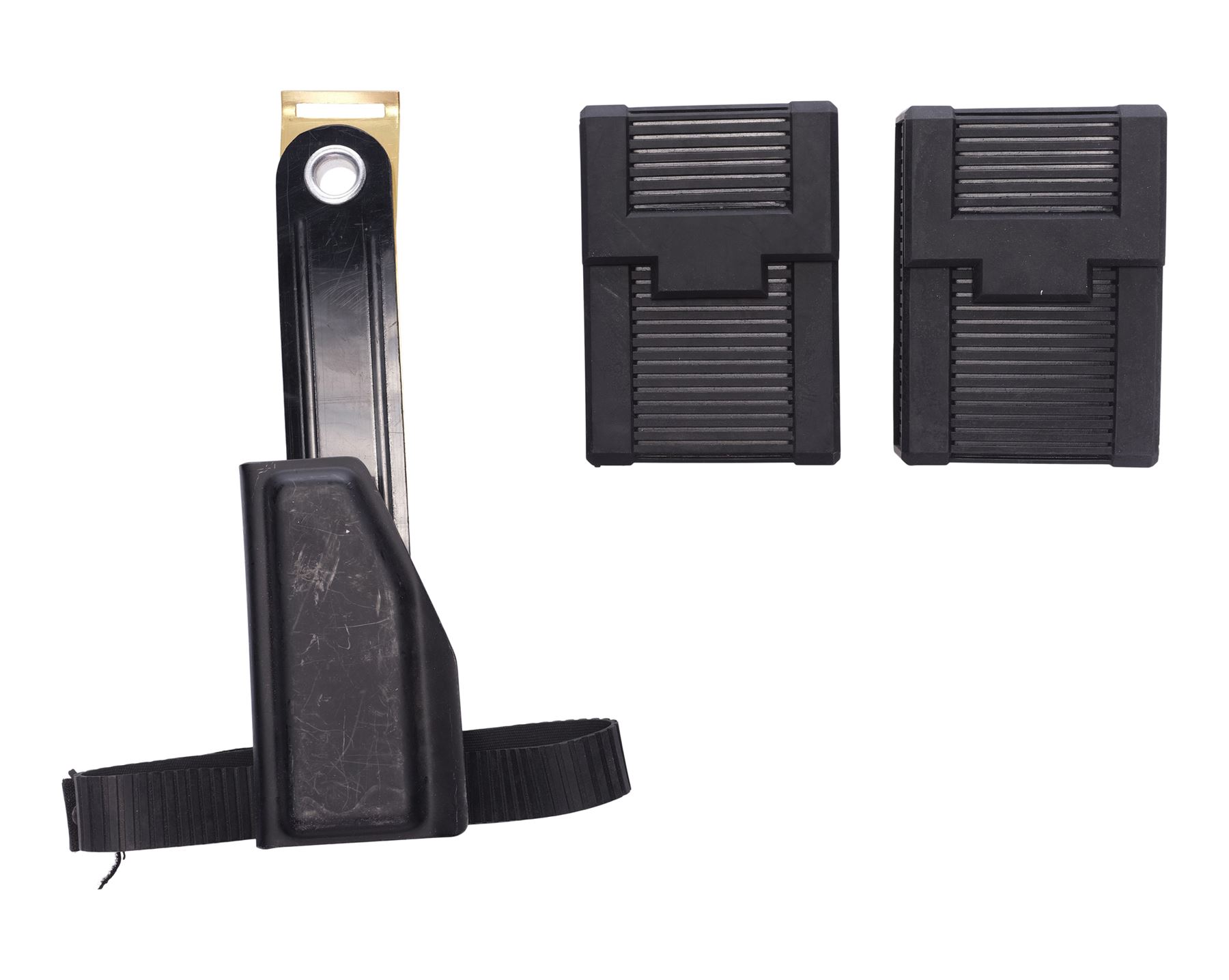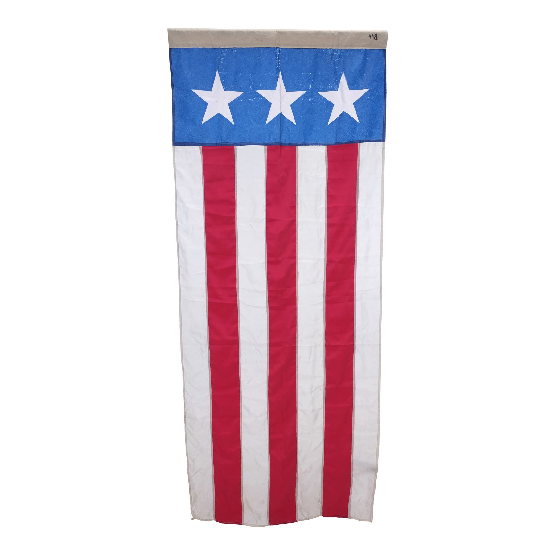This lot consists of a pair of black foam rubber gauntlets; six pairs of black leather gloves with foam rubber and resin black and gold-color appliances; a black rubber belt; a plastic gun holster with two ammo storage clips; and black foam rubber knee pads. The gloves and knee pads feature a "M.B.A. Ltd." wardrobe label reading "Street Judge'' with the numbers "06027" and "06032." Also included are two red, white, and blue polyester flags, with one hand-labeled "BVH." This lot exhibits a buildup of grime and flaking paint. Dimensions: (flags) 90" x 45" (228.75 cm x 114.5 cm)