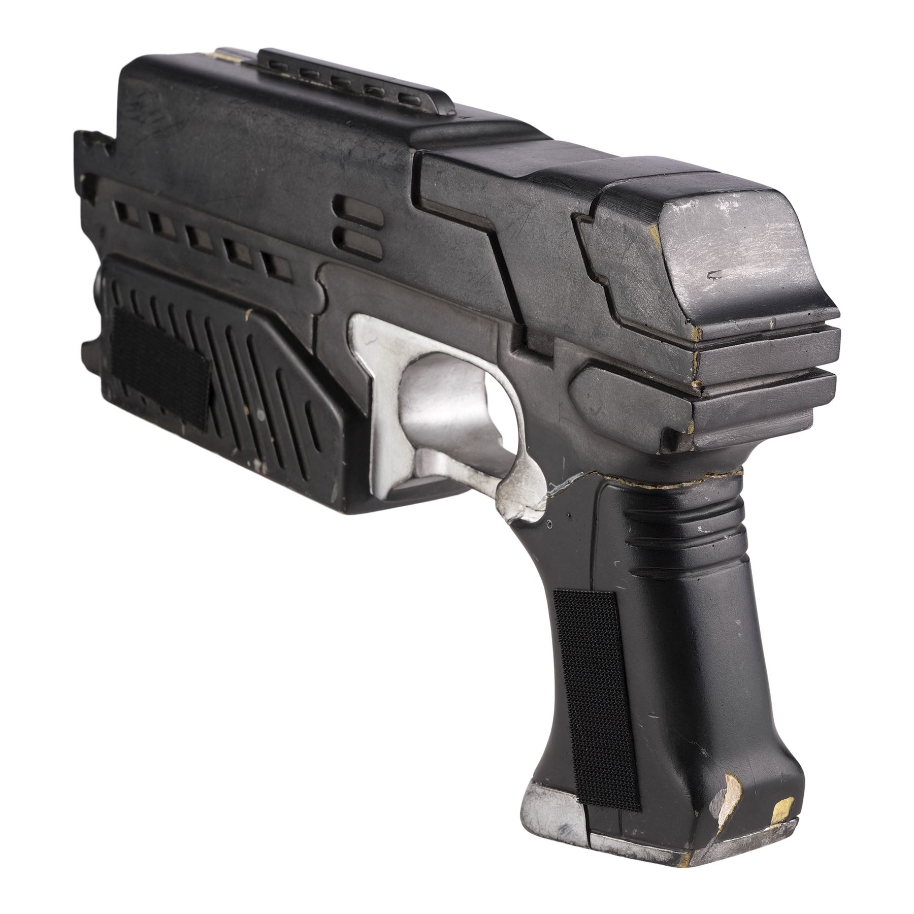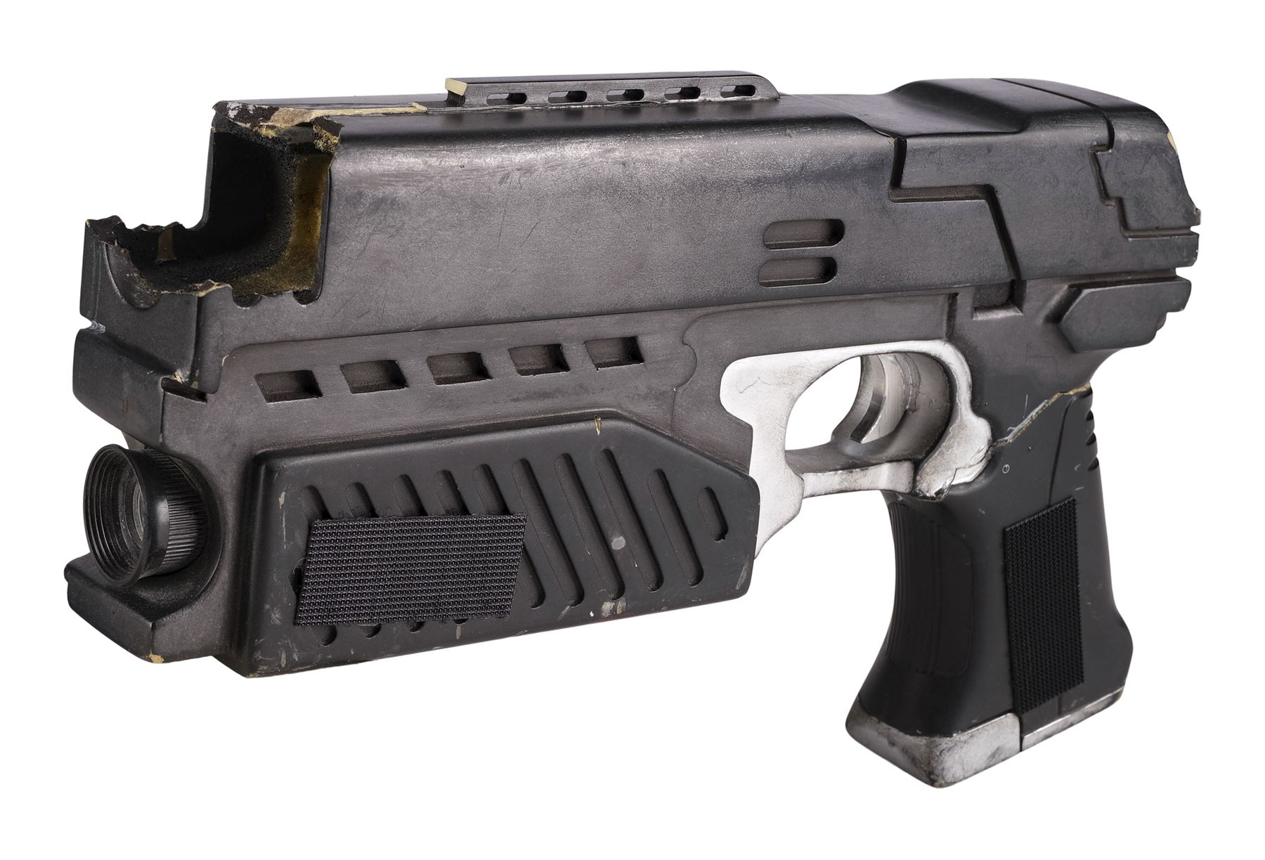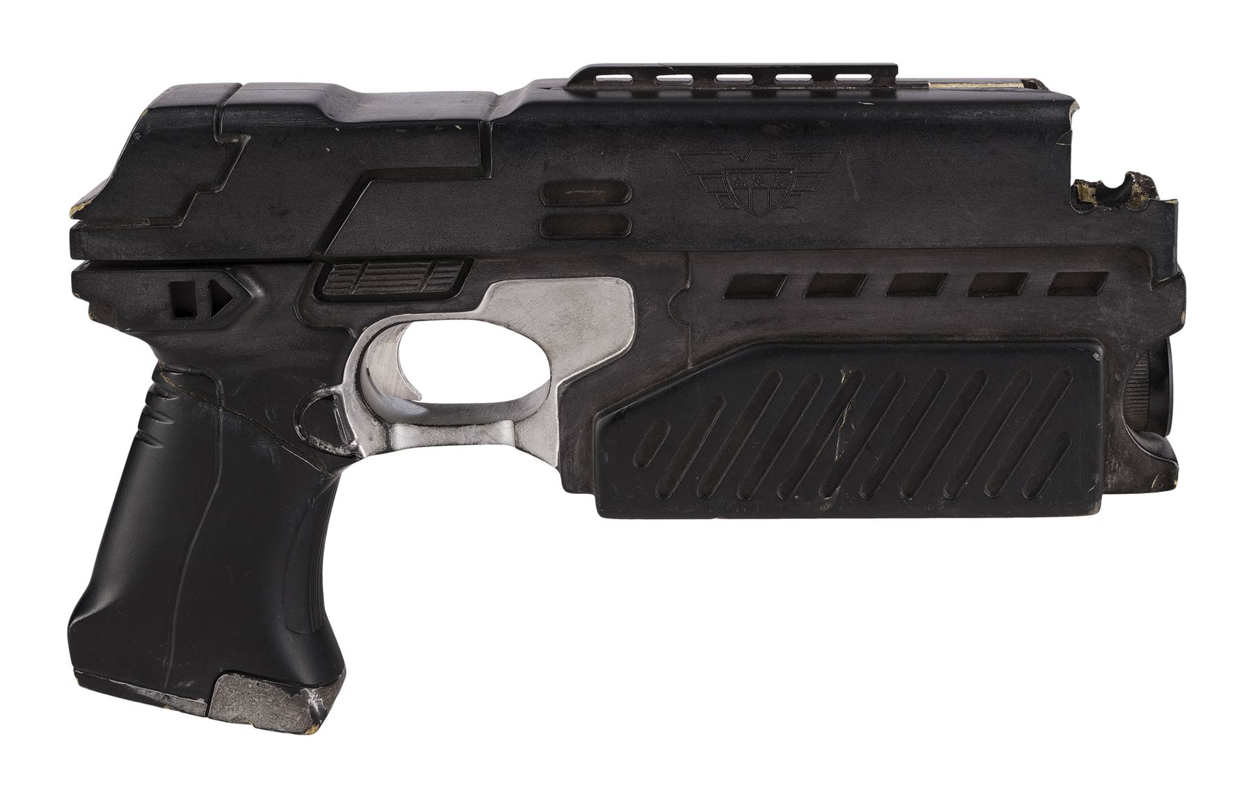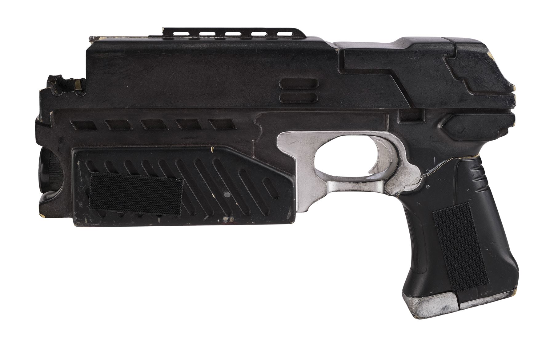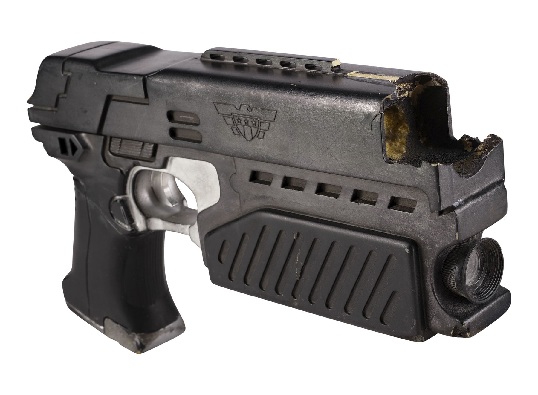 This futuristic weapon with vented details along the barrel, a sight rail, and a plastic targeting sensor lens under the barrel is cast from resin and painted black with metallized details on the trigger and magazine. Fastening strips for strapping the pistol to a Judge's uniform are affixed on the side of the body and grip. A Judges' Hall of Justice eagle insignia is engraved on its right side. The Lawgiver's barrel has broken off since production, exposing the interior, and the resin exhibits additional fractures and chipping throughout the body. Dimensions: 11" x 6.5" x 2" (28 cm x 16.5 cm x 5 cm)