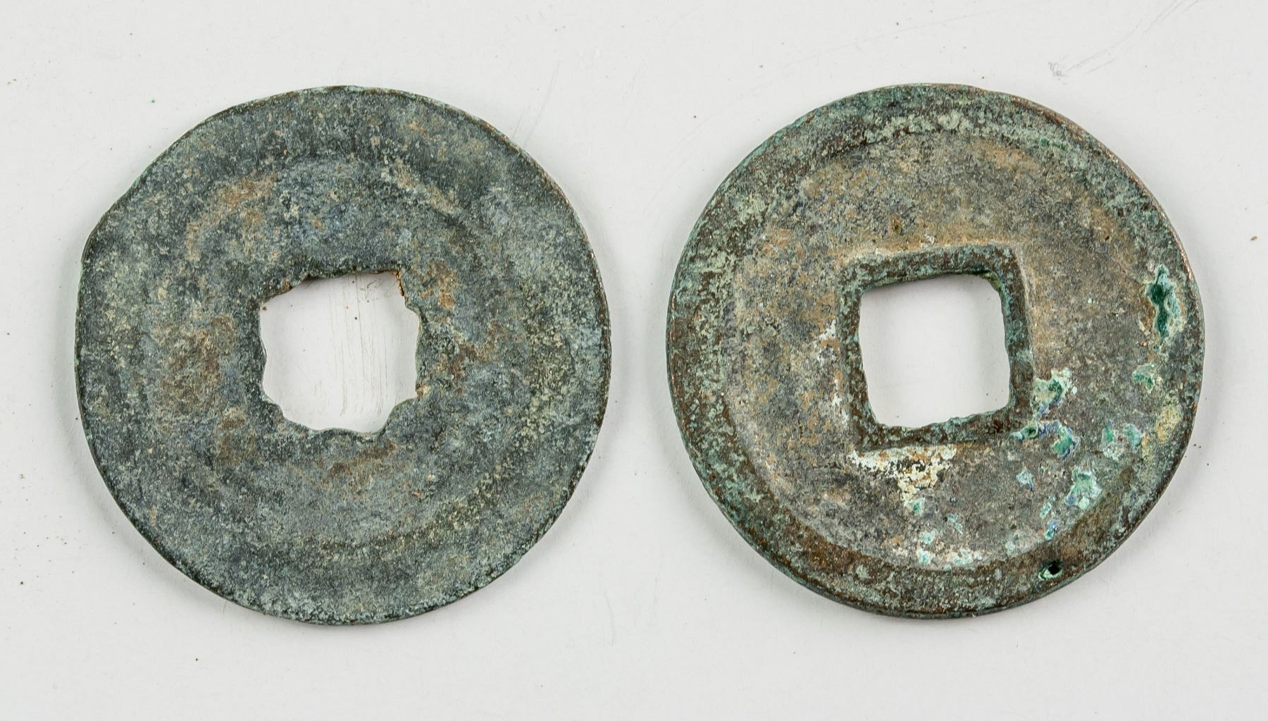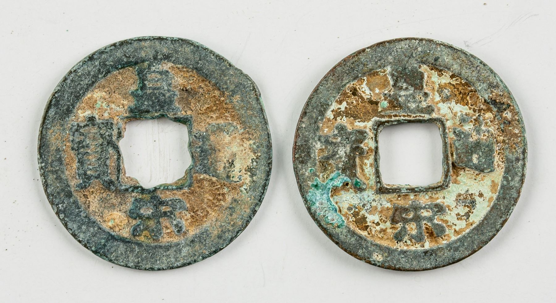 Two (2) assorted 1039-1054 Chinese Northern Song dynasty bronze coins, obverse lettering Huang Song Tong Bao in regular script, D: 25.2 mm, 6.6 grams total