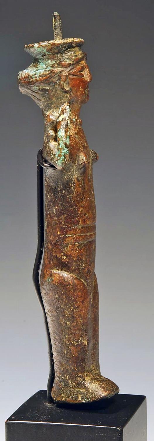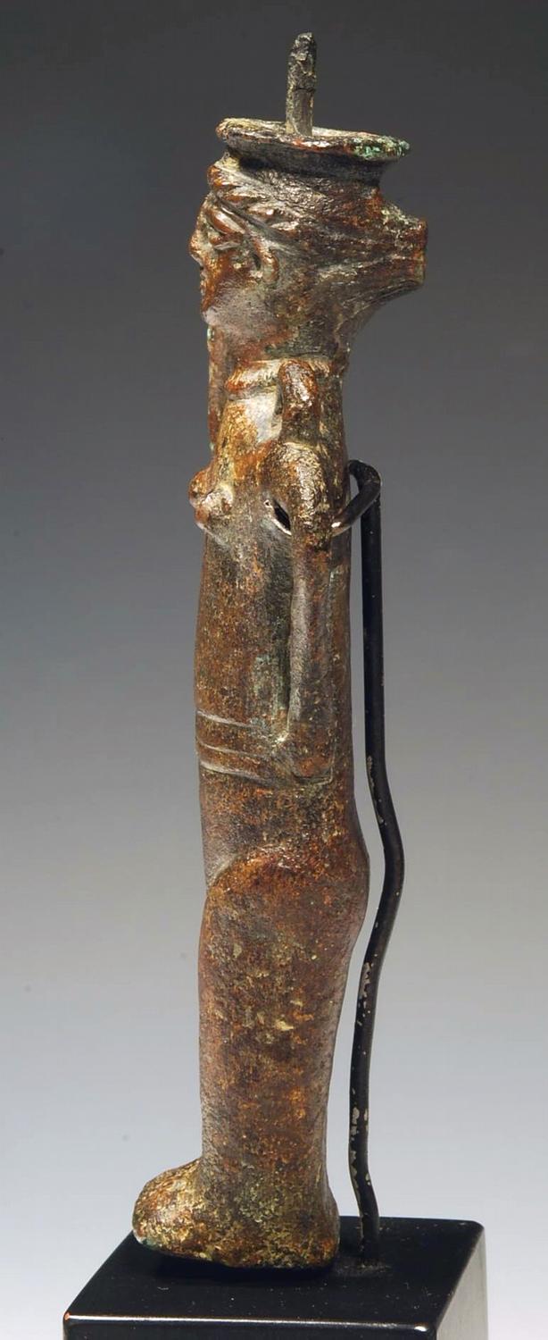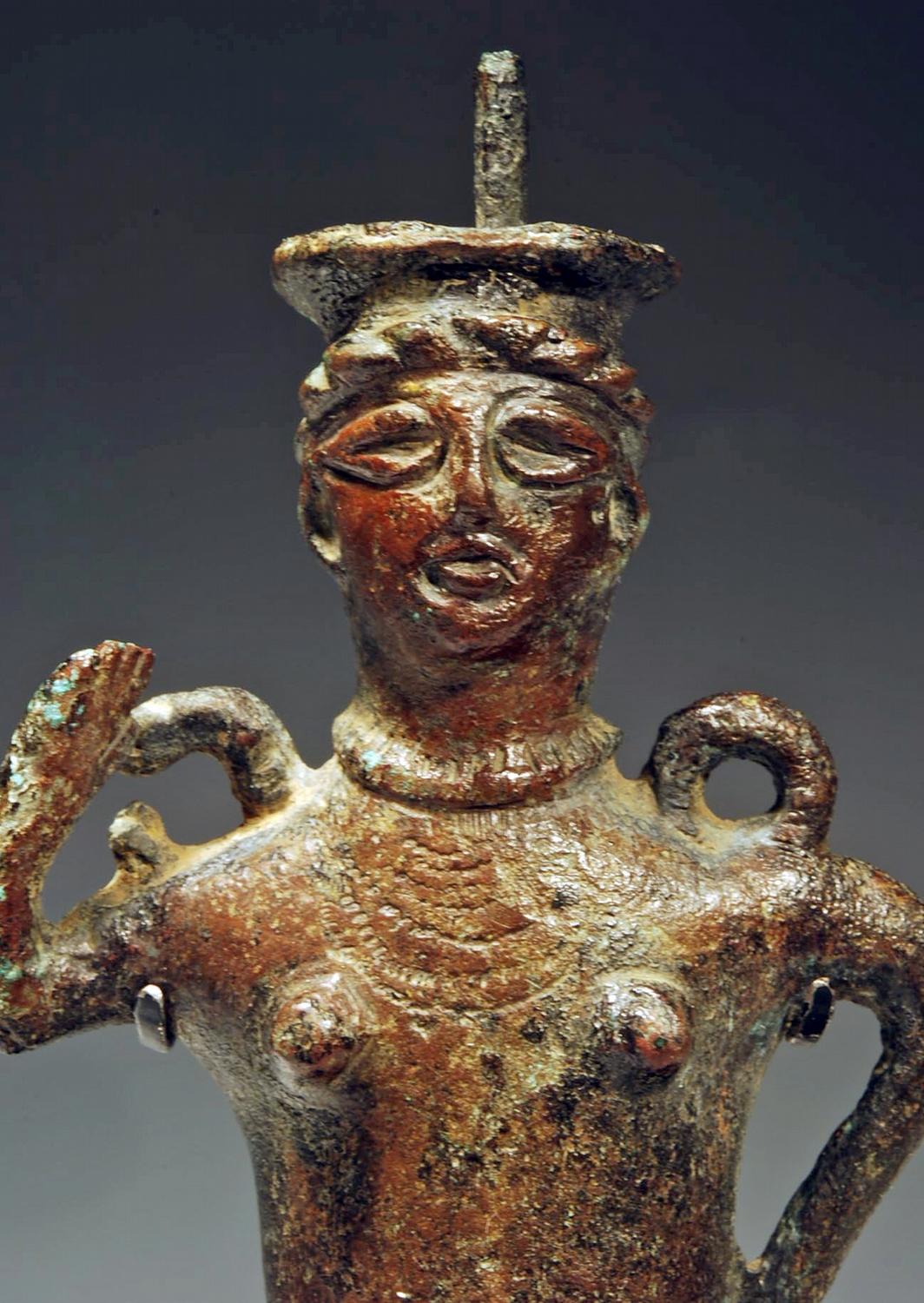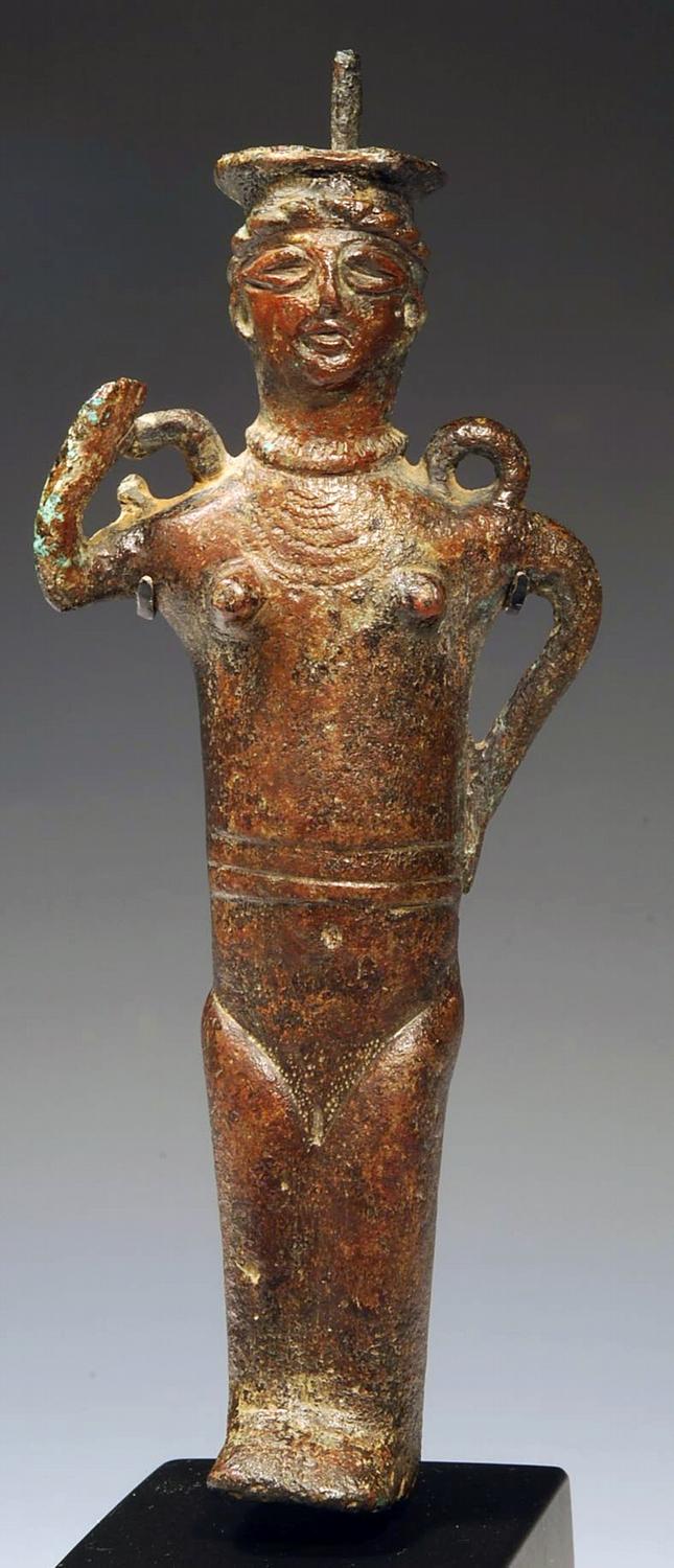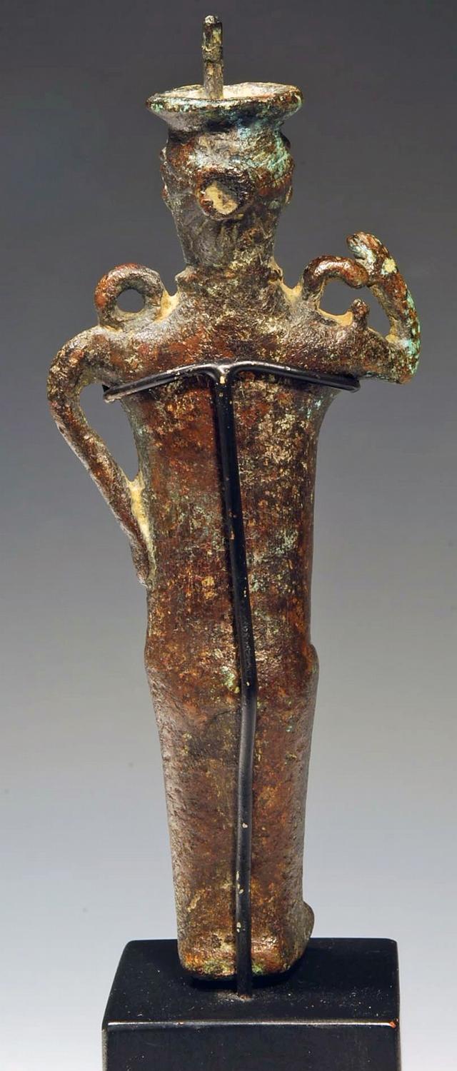 Iran, Ca 1000 BC. In the form of a naked female figure with prominent pointed breasts, her short right arm raised, her left hand on hip, with incised bands around her waist and she wears a necklace, her hair drawn back in a conical bun, the top of her head forming the mouth of the vessel, containing a kohn stick, loops on each shoulder for suspension, with conjoint legs and incised public region 5-1/2"T(14cm) Private US Collection. Cf. the Adam Collection, no. 121, which may be related to this example.
