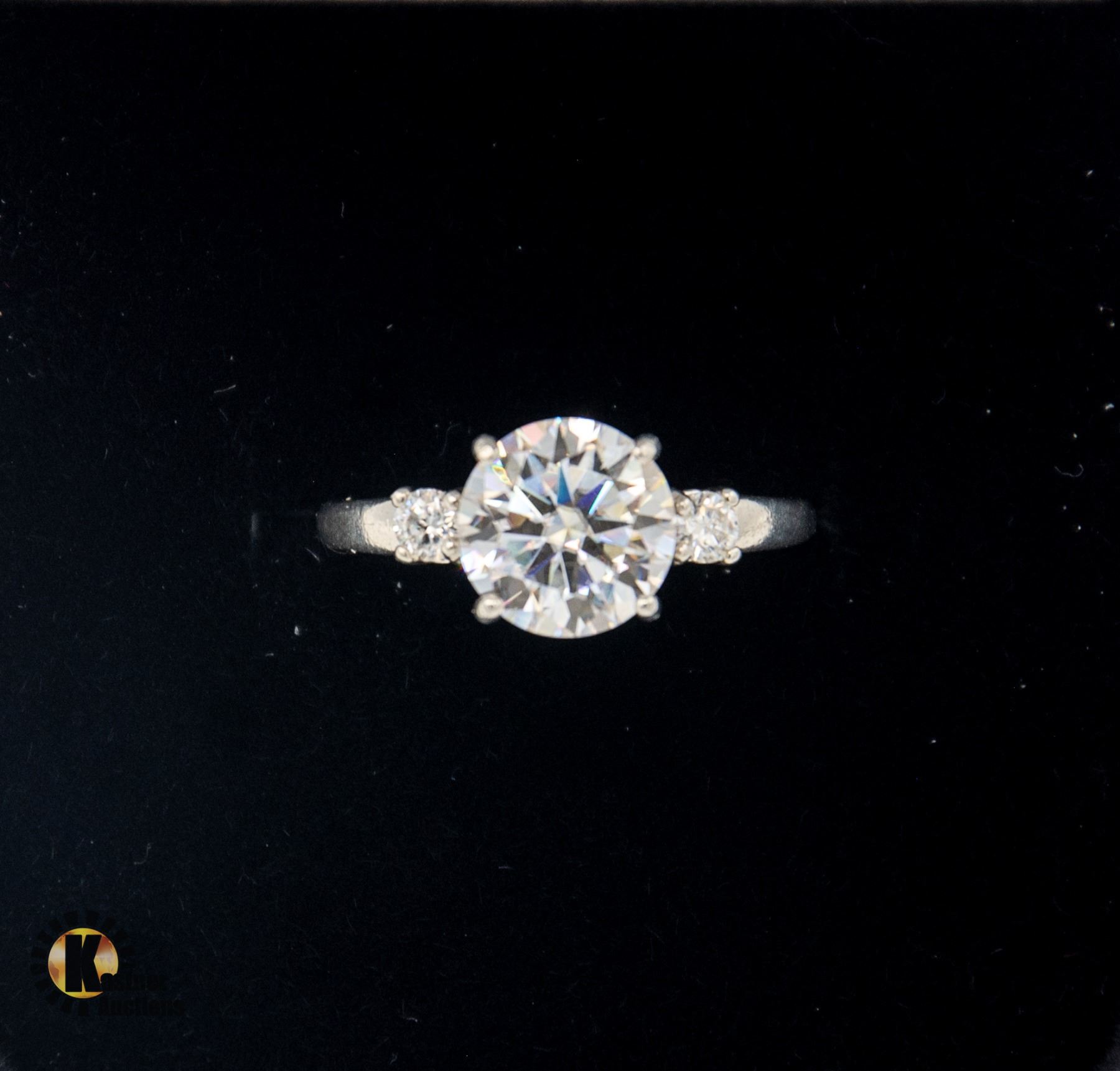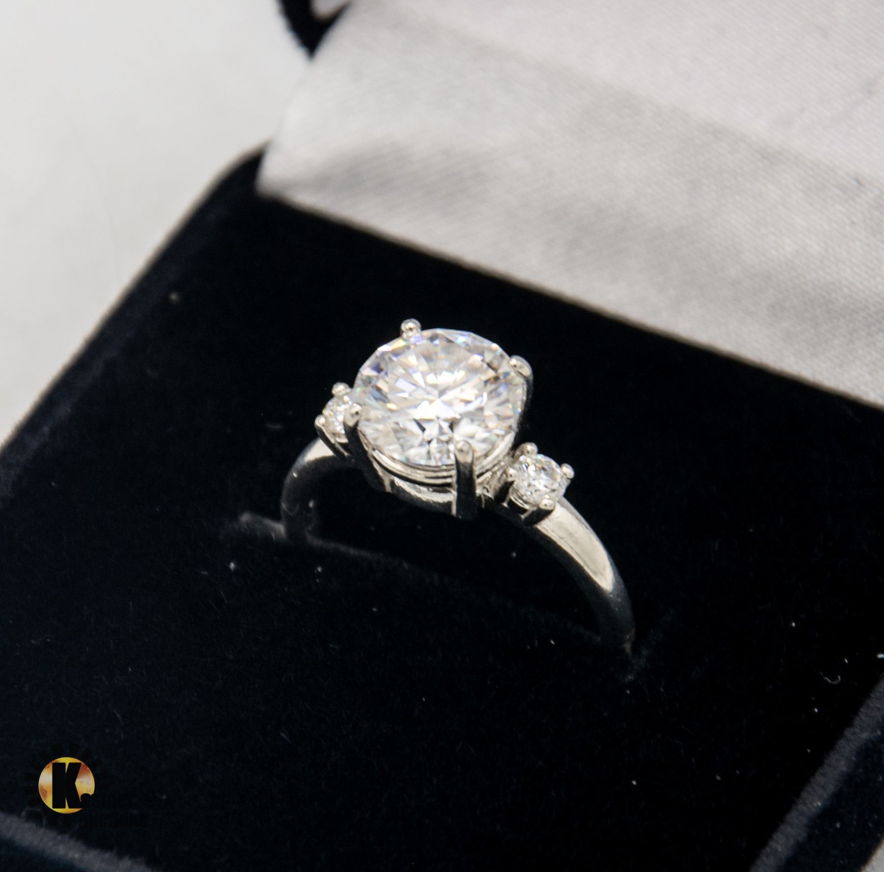 BRILLIANT CUT MOISSANITE STONE VVS D COLOR SET IN CENTER WITH 0.10 CT SET ON EITHER SIDE. RING SIZE 8 **ALL ITEMS MUST BE REMOVED BY 5PM SATURDAY, DECEMBER 7TH 2024. ALL REMAINING ITEMS WILL BE SUBJECT TO A $6.00 PER DAY STORAGE CHARGE. ANY ITEMS REMAINING AFTER MONDAY, DECEMBER 23RD 2024 WILL BE CONSIDERED FORFEITED. NO REFUNDS WILL BE ISSUED FOR FORFEITED ITEMS. TO SCHEDULE A PICK UP APPOINTMENT CLICK HERE