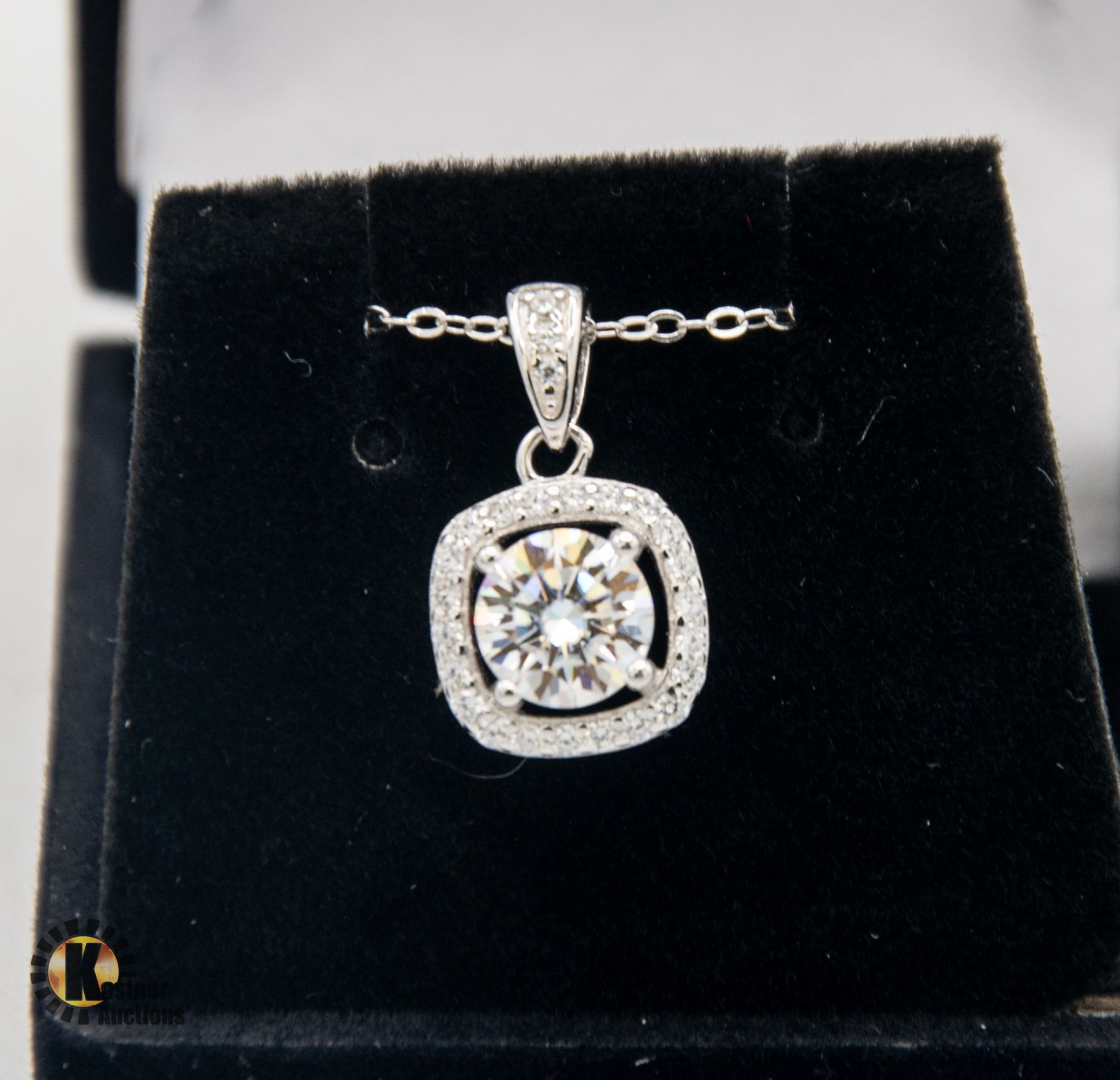 MOISSANITE STONE VVS D COLOR WITH 25 ROUND BRILLIANT CUT CUBIC ZIRCONIA SET IN SQUARE HALO SET IN 925 SILVER PENDANT RETAIL VALUE $775.00