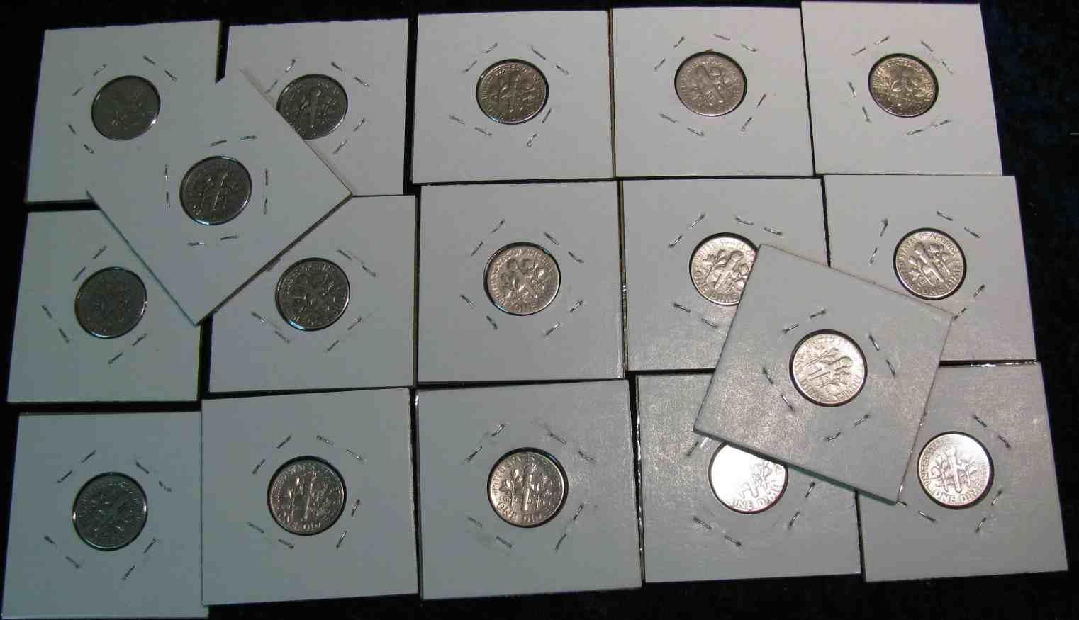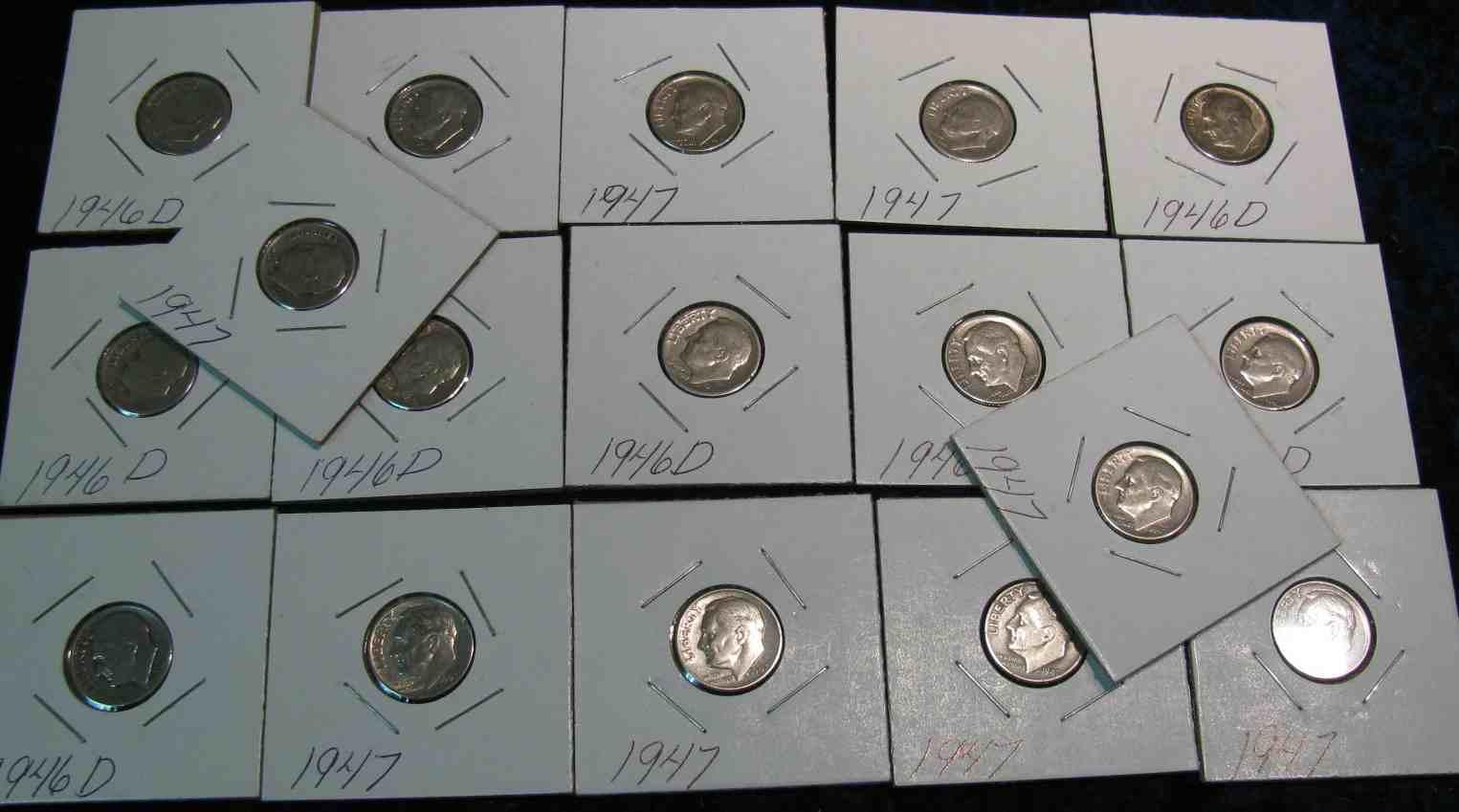 1041. 1946P, (8) 46D, & (8) 47P Roosevelt Dimes. VG-VF.