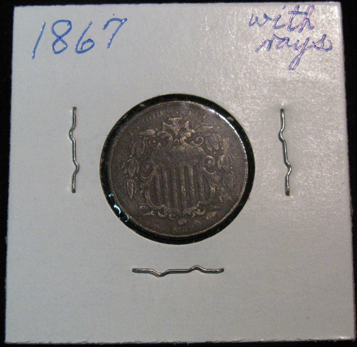 1045. 1867 Rays Shield Nickel. VG Dark.