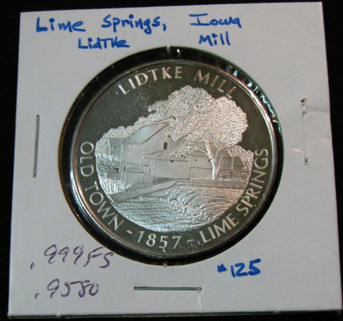 1048. Lidtke Mill Old Town-1857-Lime Springs (Ia.) Proof .999 FS Medal. Weighs .9580 oz. Serial no. 125. Population: 1,192