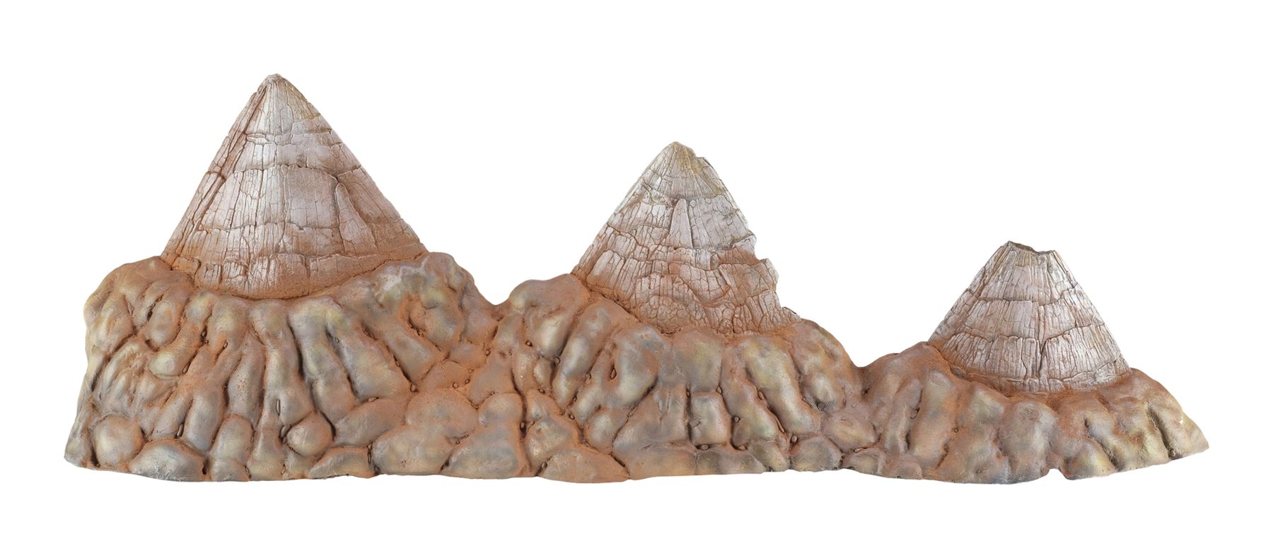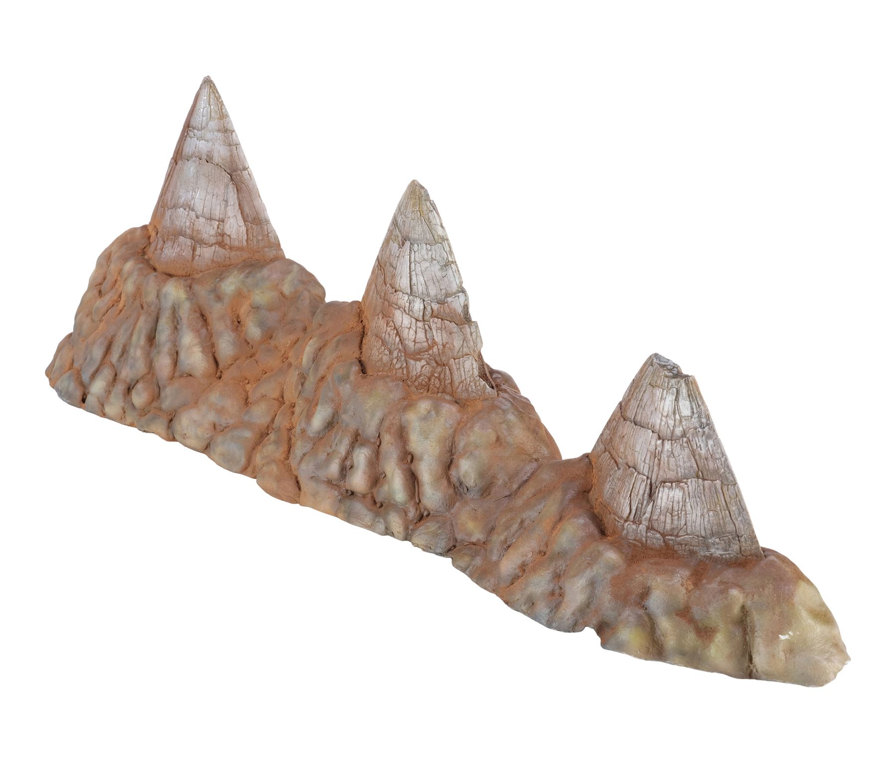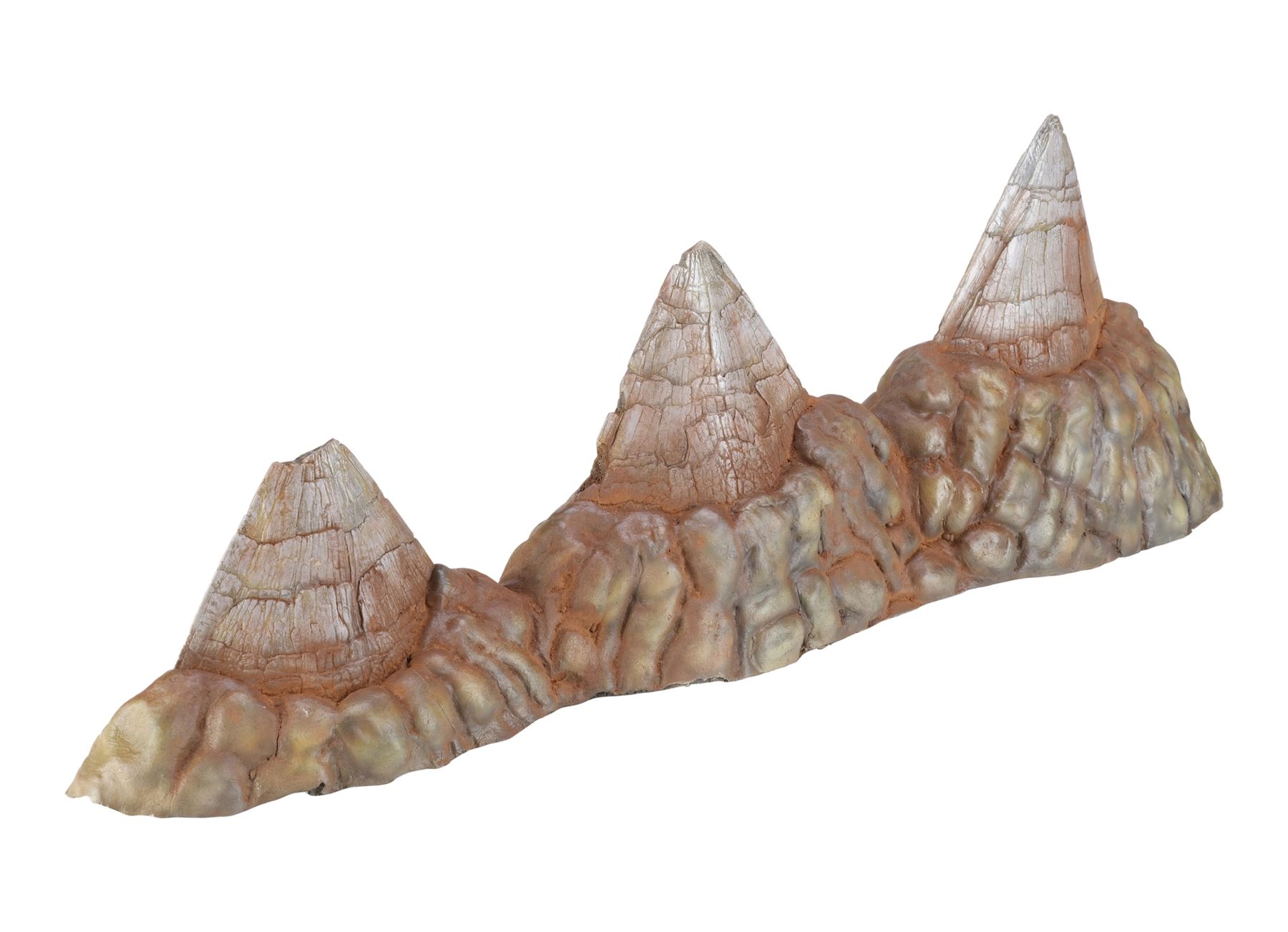 Created by key artist Rob Hinderstein from Stan Winston Studios, these three brown and gray toned spikes are made of resin designed and sculpted to appear with organic texture. These spikes were permanently installed in an orange, brown and green fiberglass display base made to resemble the frill on a Triceratops. This lot exhibits a buildup of grime, flaked paint, and mild cracking on the frill. Dimensions: 28" x 7.5" x 11" (71.25 cm x 19 cm x 28 cm)