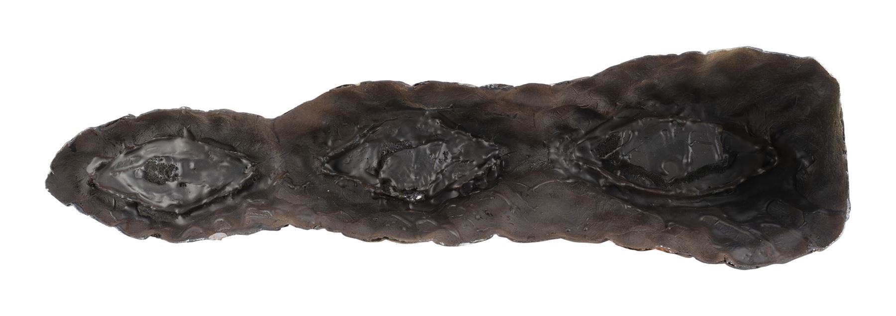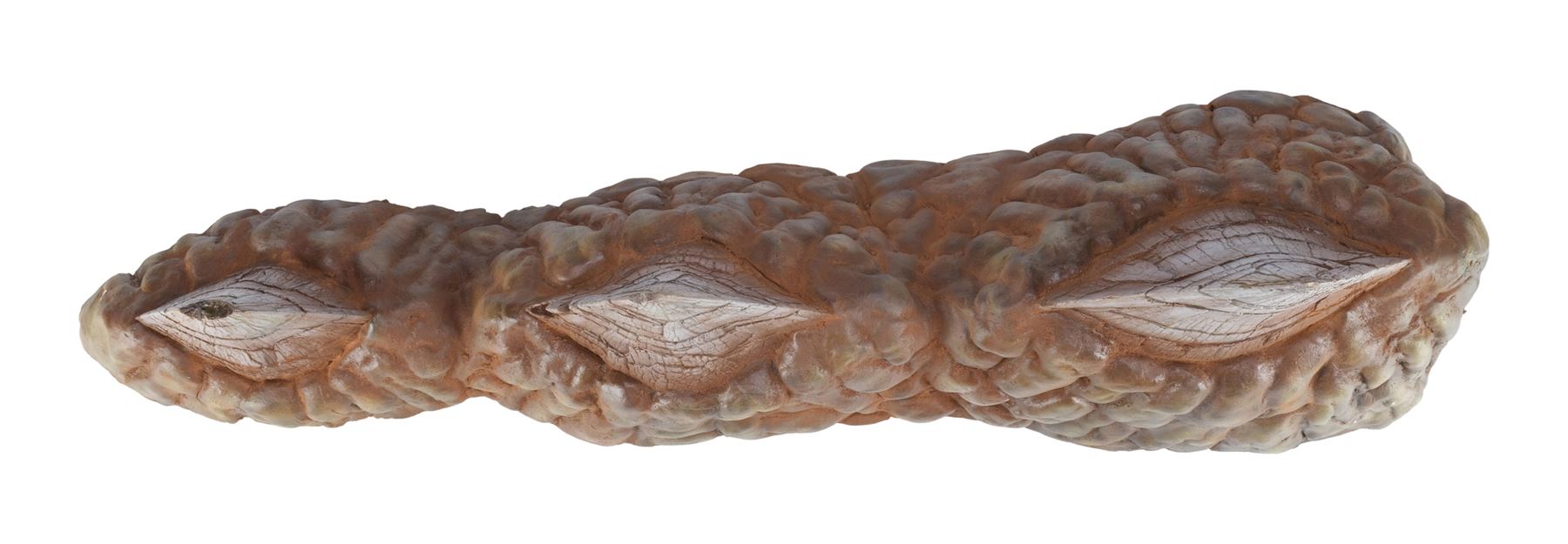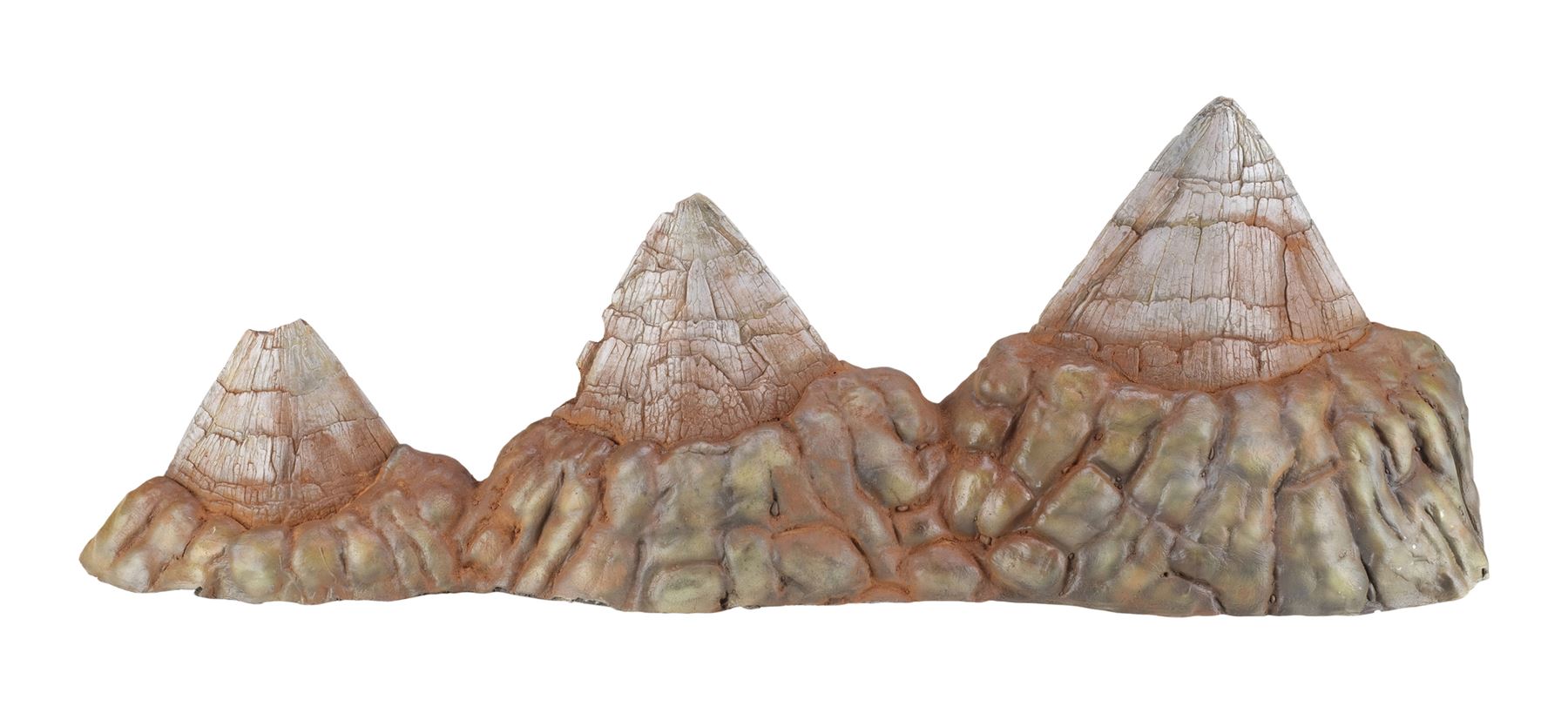 Created by key artist Rob Hinderstein from Stan Winston Studios, these three brown and gray toned spikes are made of resin designed and sculpted to appear with organic texture. These spikes were permanently installed in an orange, brown and green fiberglass display base made to resemble the frill on a Triceratops. This lot exhibits a buildup of grime, flaked paint, and mild cracking on the frill. Dimensions: 28" x 7.5" x 11" (71.25 cm x 19 cm x 28 cm)