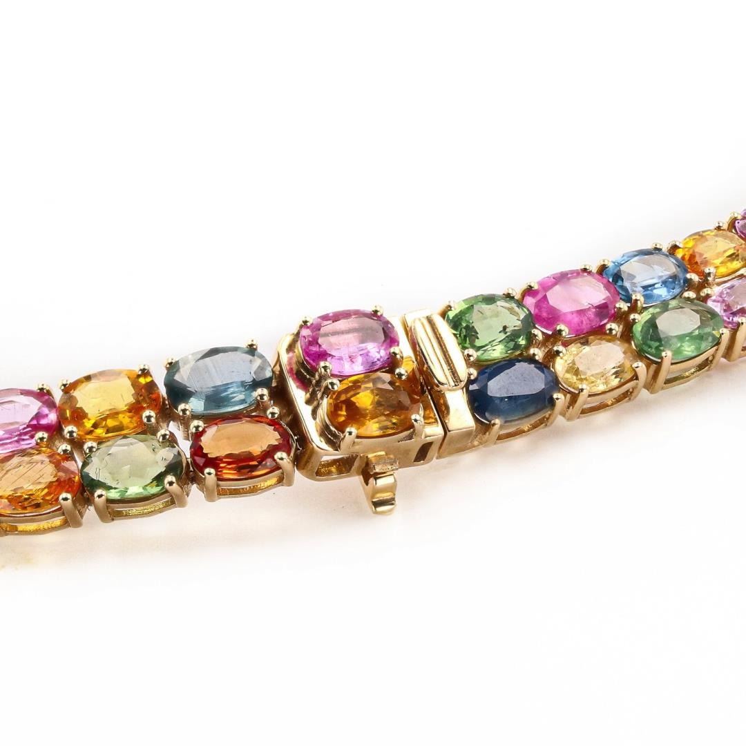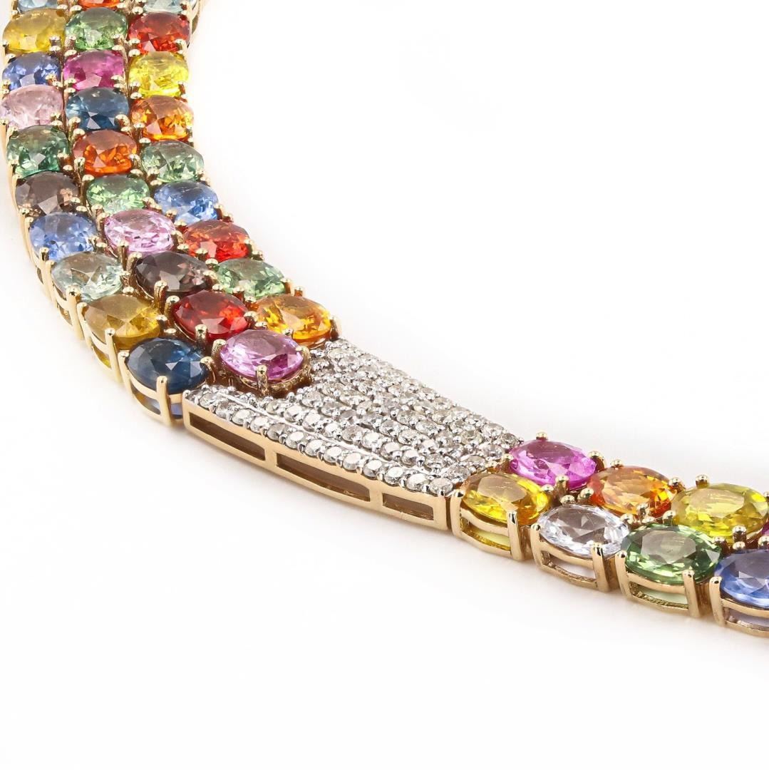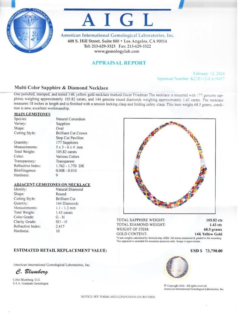 One polished. stamped. and tested 14K yellow gold necklace marked Oscar Friedman The necklace is mounted with 177 genuine sapphires weighing approximately 105.82 carats, and 144 genuine round diamonds weighing approximately 1.43 carats. The necklace measures 18 inches in length and is finished with a tension locking clasp and folding safety clasp. This item weighs 68.5 grams, condition is new. excellent workmanship. #MAIN GEMSTONES# Species: Natural Corundum Variety: Sapphire Shape: Oval Cutting Style: Brilliant Cut Crown, Step Cut Pavilion Quantity: 177 Sapphires Measurements: 5 x 3 - 6 x 4mm Total Weight: 105.82 carats Color: Various Colors Transparency: Transparent Refractive Index: 1.762 - 1.770 DR Birefringence: 0.008 - 0.010 Hardness: 9 #ADJACENT GEMSTONES ON NECKLACE# Identity: Natural Diamond Shape: Round Cutting Style: Brilliant Cut Quantity: 144 Diamonds Measurements: 1.1 - 1.3mm Total Weight: 1.43 carats Color Grade: G-H Clarity Grade: SI1-I1 Refractive Index: 2.417 Hardness: 10 TOTAL SAPPHIRE WEIGHT: 105.82 ctw TOTAL DIAMOND WEIGHT: 1.43 ctw WEIGHT OF ITEM: 68.5 grams GOLD CONTENT: 14K Yellow Gold