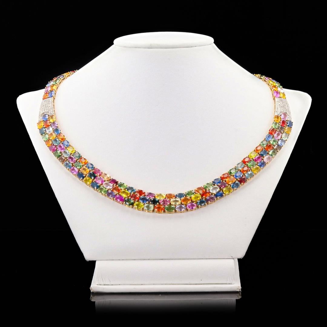 One polished. stamped. and tested 14K yellow gold necklace marked Oscar Friedman The necklace is mounted with 177 genuine sapphires weighing approximately 105.82 carats, and 144 genuine round diamonds weighing approximately 1.43 carats. The necklace measures 18 inches in length and is finished with a tension locking clasp and folding safety clasp. This item weighs 68.5 grams, condition is new. excellent workmanship. #MAIN GEMSTONES# Species: Natural Corundum Variety: Sapphire Shape: Oval Cutting Style: Brilliant Cut Crown, Step Cut Pavilion Quantity: 177 Sapphires Measurements: 5 x 3 - 6 x 4mm Total Weight: 105.82 carats Color: Various Colors Transparency: Transparent Refractive Index: 1.762 - 1.770 DR Birefringence: 0.008 - 0.010 Hardness: 9 #ADJACENT GEMSTONES ON NECKLACE# Identity: Natural Diamond Shape: Round Cutting Style: Brilliant Cut Quantity: 144 Diamonds Measurements: 1.1 - 1.3mm Total Weight: 1.43 carats Color Grade: G-H Clarity Grade: SI1-I1 Refractive Index: 2.417 Hardness: 10 TOTAL SAPPHIRE WEIGHT: 105.82 ctw TOTAL DIAMOND WEIGHT: 1.43 ctw WEIGHT OF ITEM: 68.5 grams GOLD CONTENT: 14K Yellow Gold