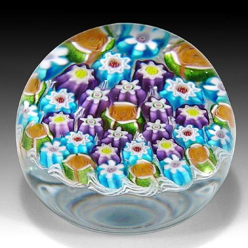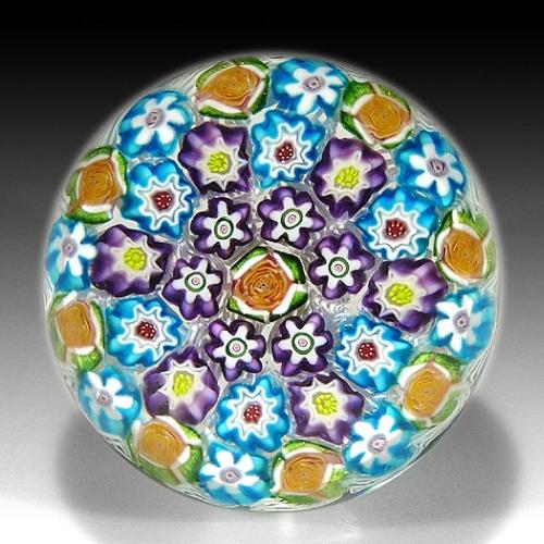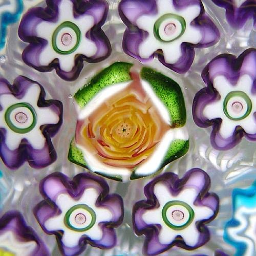 Julie Scrutton Lewis 1999 concentric millefiori paperweight, including pastry mold, edelweiss, and rose canes, around a butterscotch rose cane center, on white upset muslin. Signed/dated. Limited edition #2 of 10. Diameter 2 1/4". NO RESERVE
