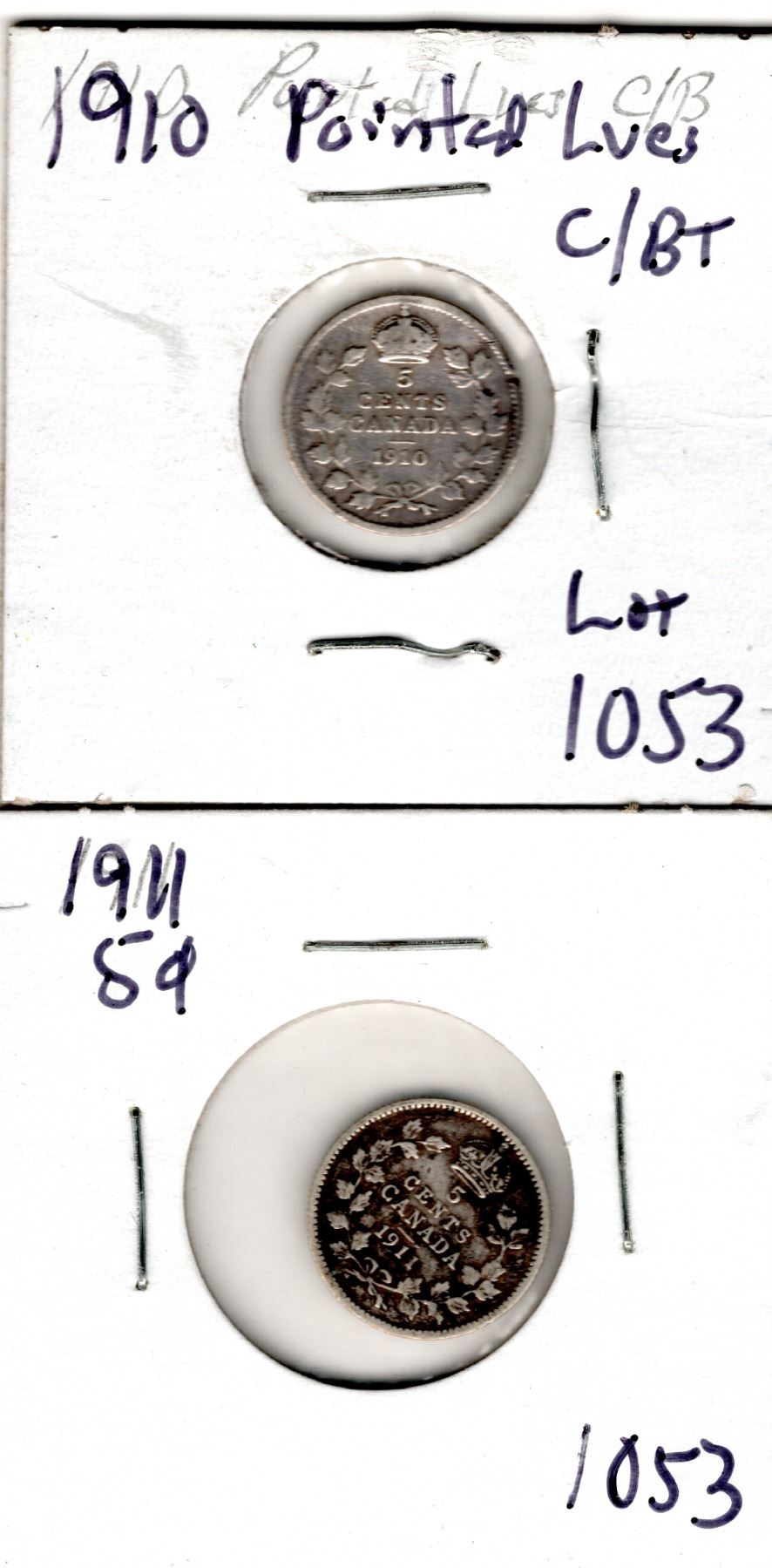 1053. 1910 5 CENT POINTED LEAVES AND 1911 FIVE CENT SILVER