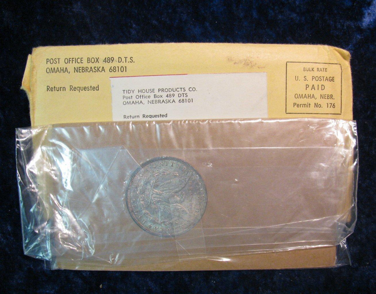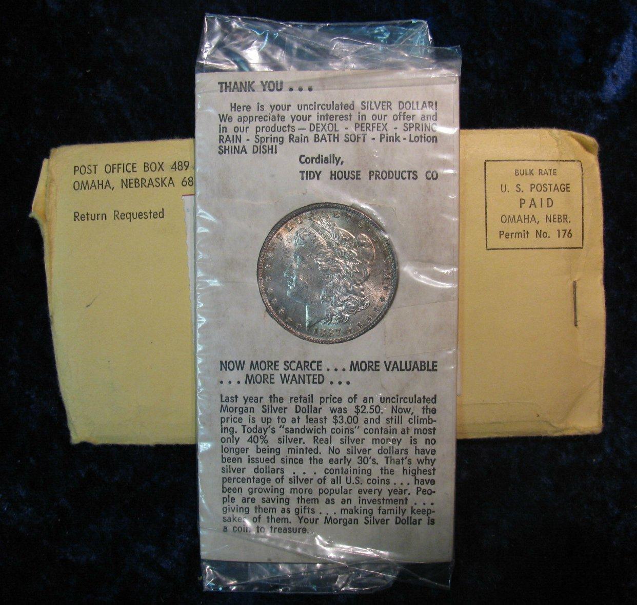 1054. 1887P Morgan Dollar. BU in Tidy House Holder and Envelope.