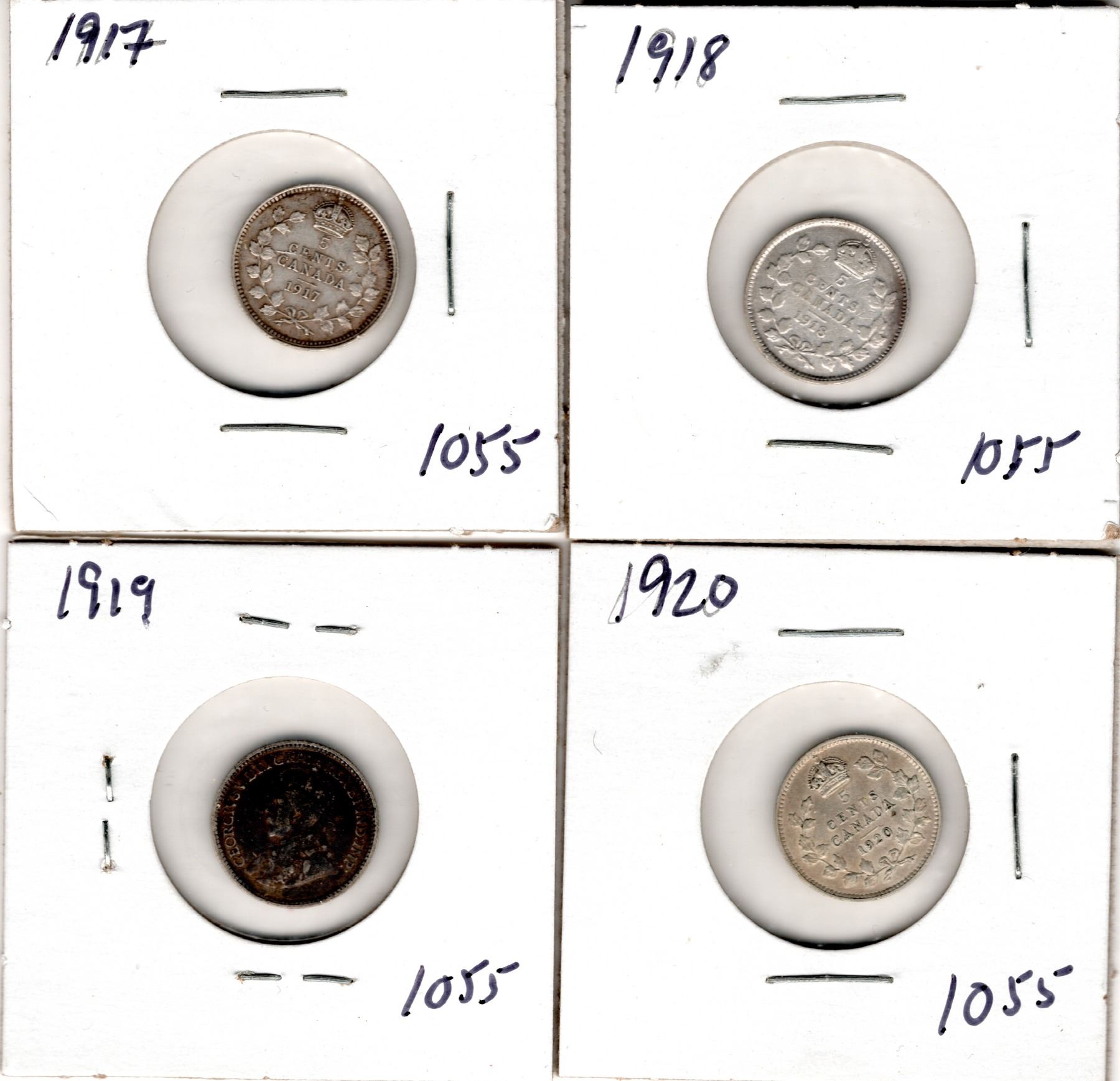 1055. 1917, 1918, 1919 AND 1920 FIVE CENT SILVER