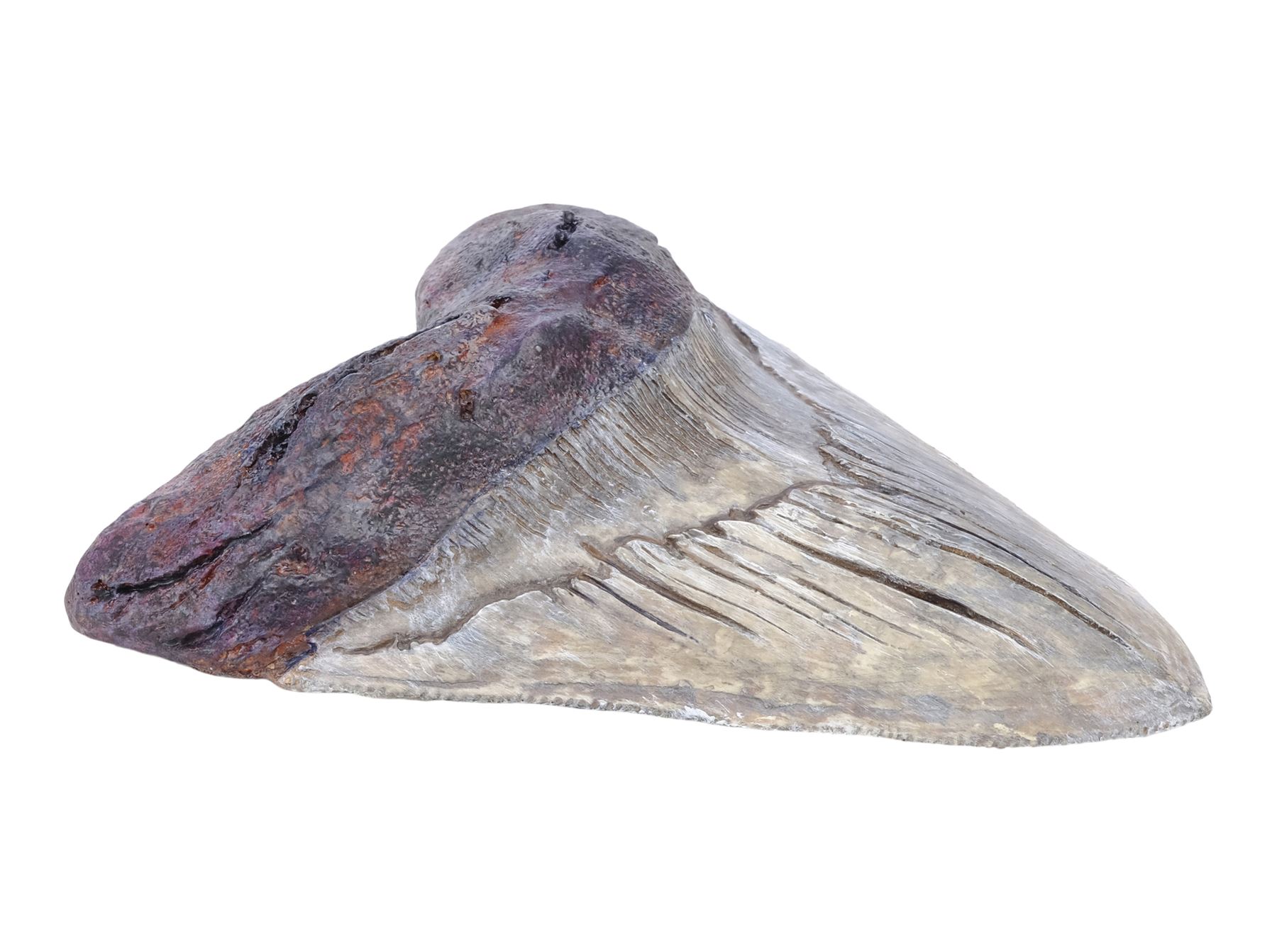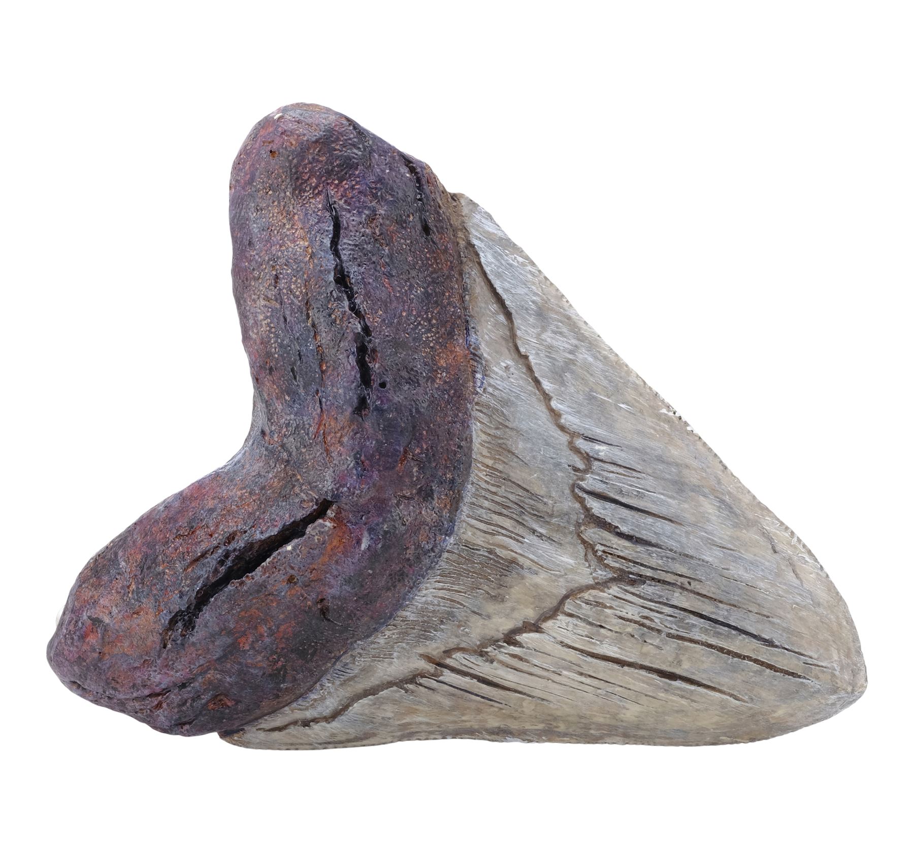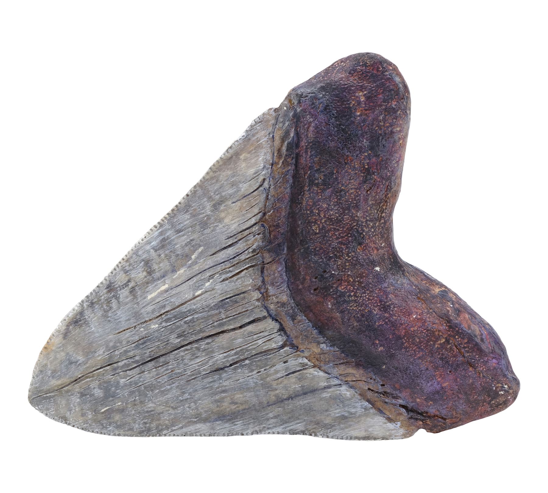 This lot consists of a single tooth made of polyurethane foam. It features small serrations along the tooth's edges, and a textured crown like wood. It exhibits some cracking on the front of the root. Dimensions: 1.5" x 4.5" x 5.5" (4 cm x 11.5 cm x 15 cm)
