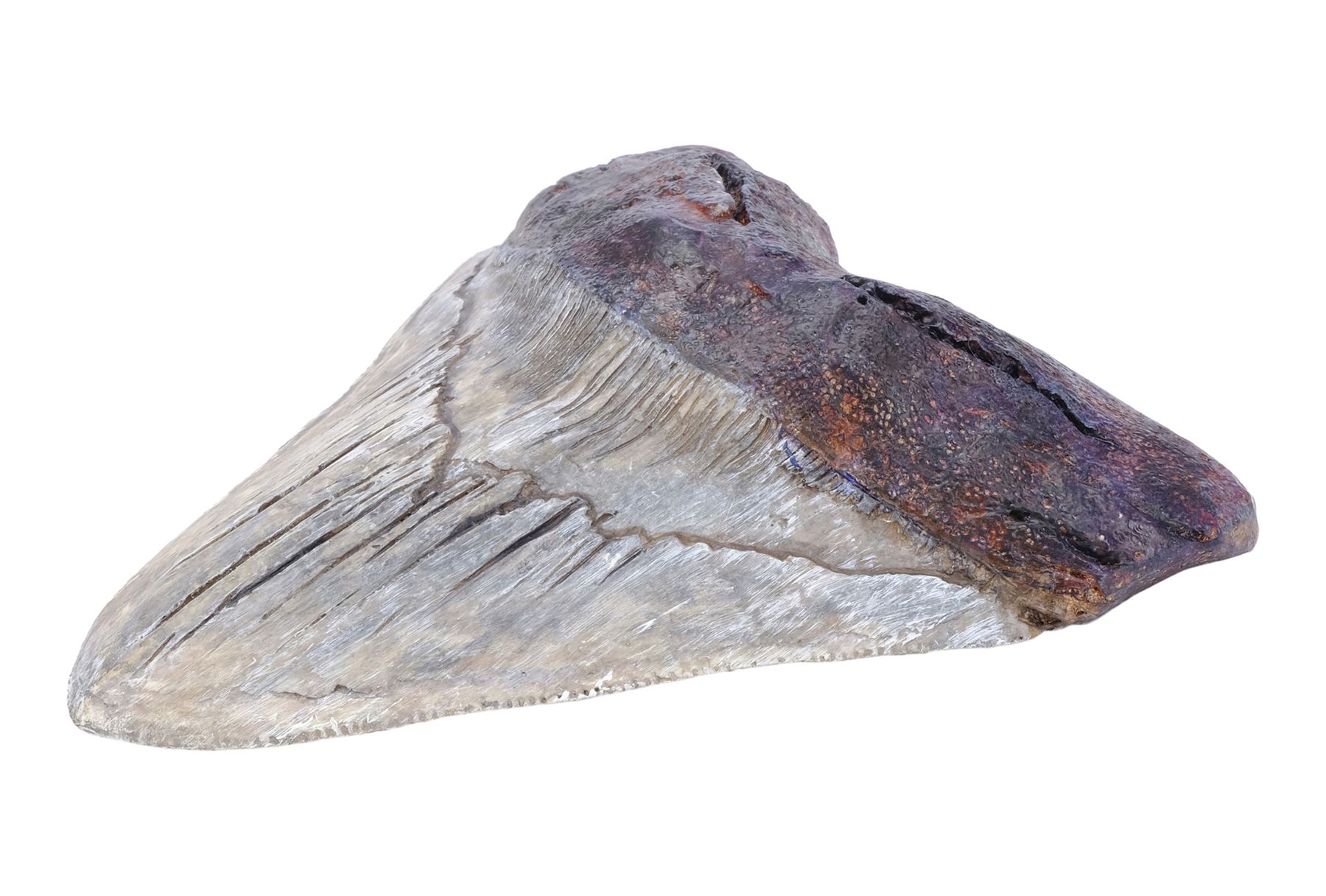 JURASSIC WORLD DOMINION (2022) - Megalodon Tooth - A megalodon tooth from Colin Trevorrow's Jurassic World Dominion. Dr. Alan Grant's (Sam Neill) tent at his dig site contained photos and specimens of fossils, including a picture of megalodon teeth on a board.