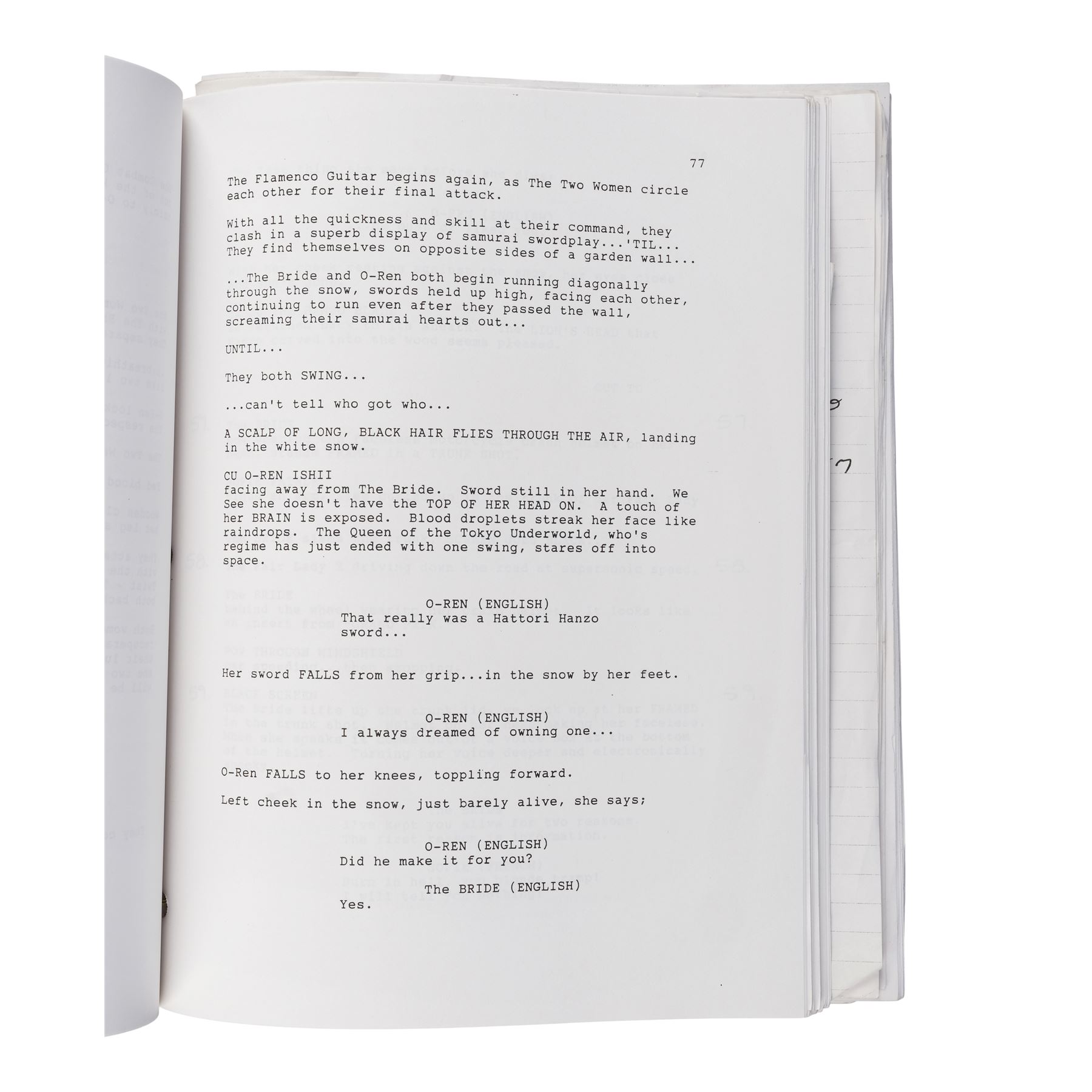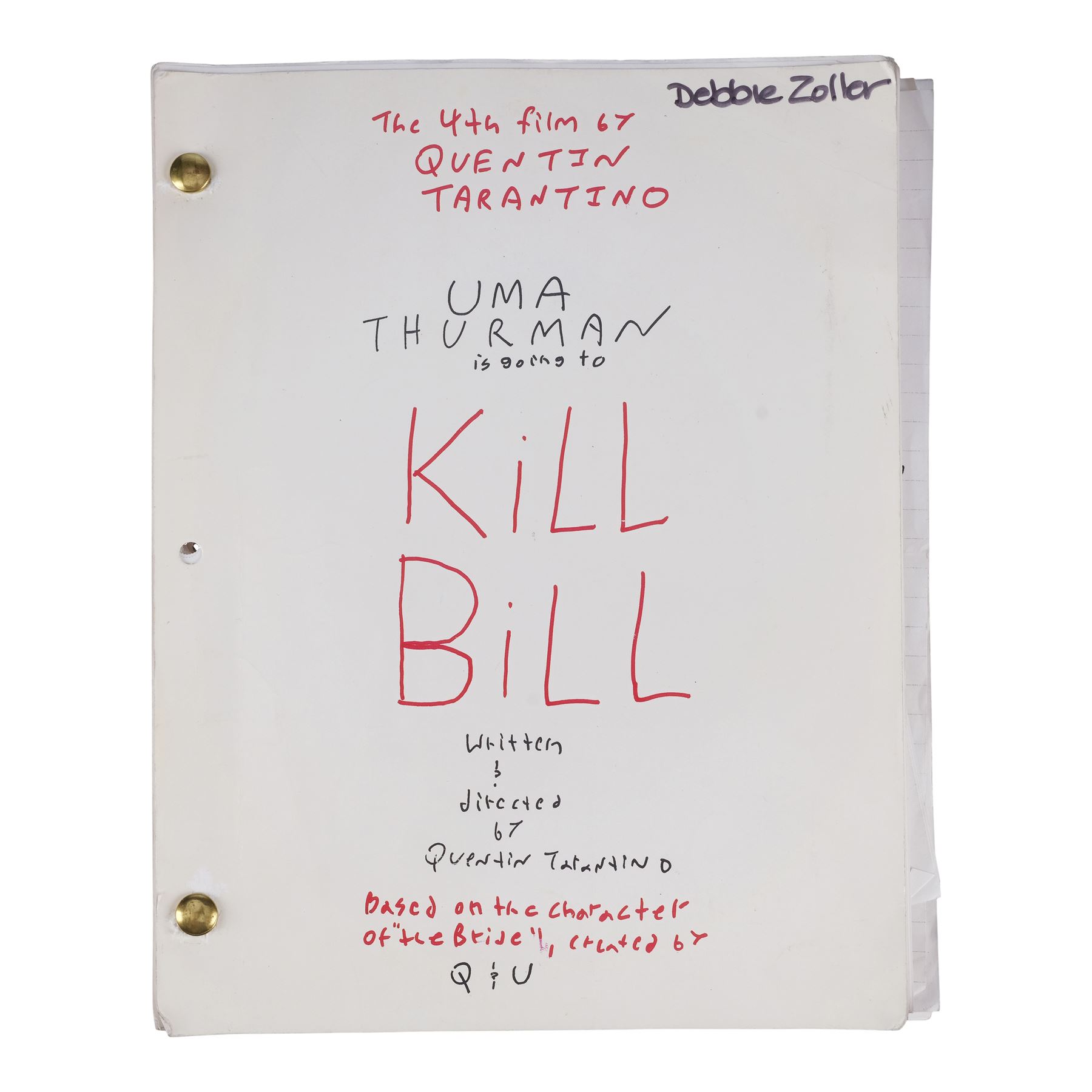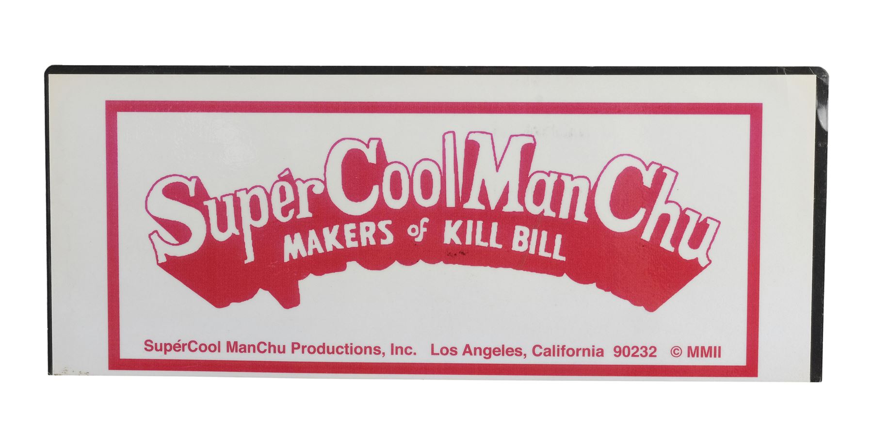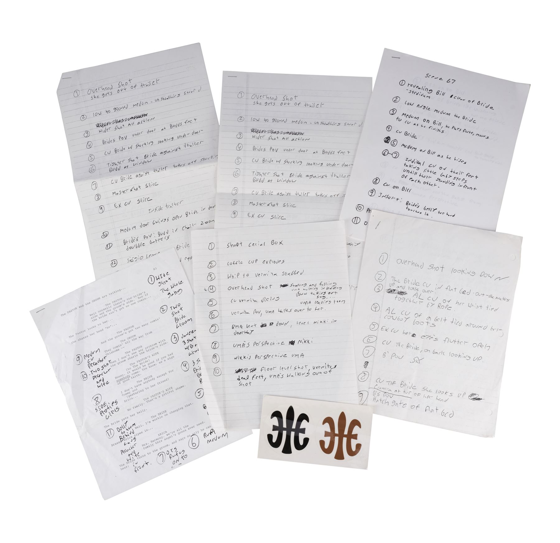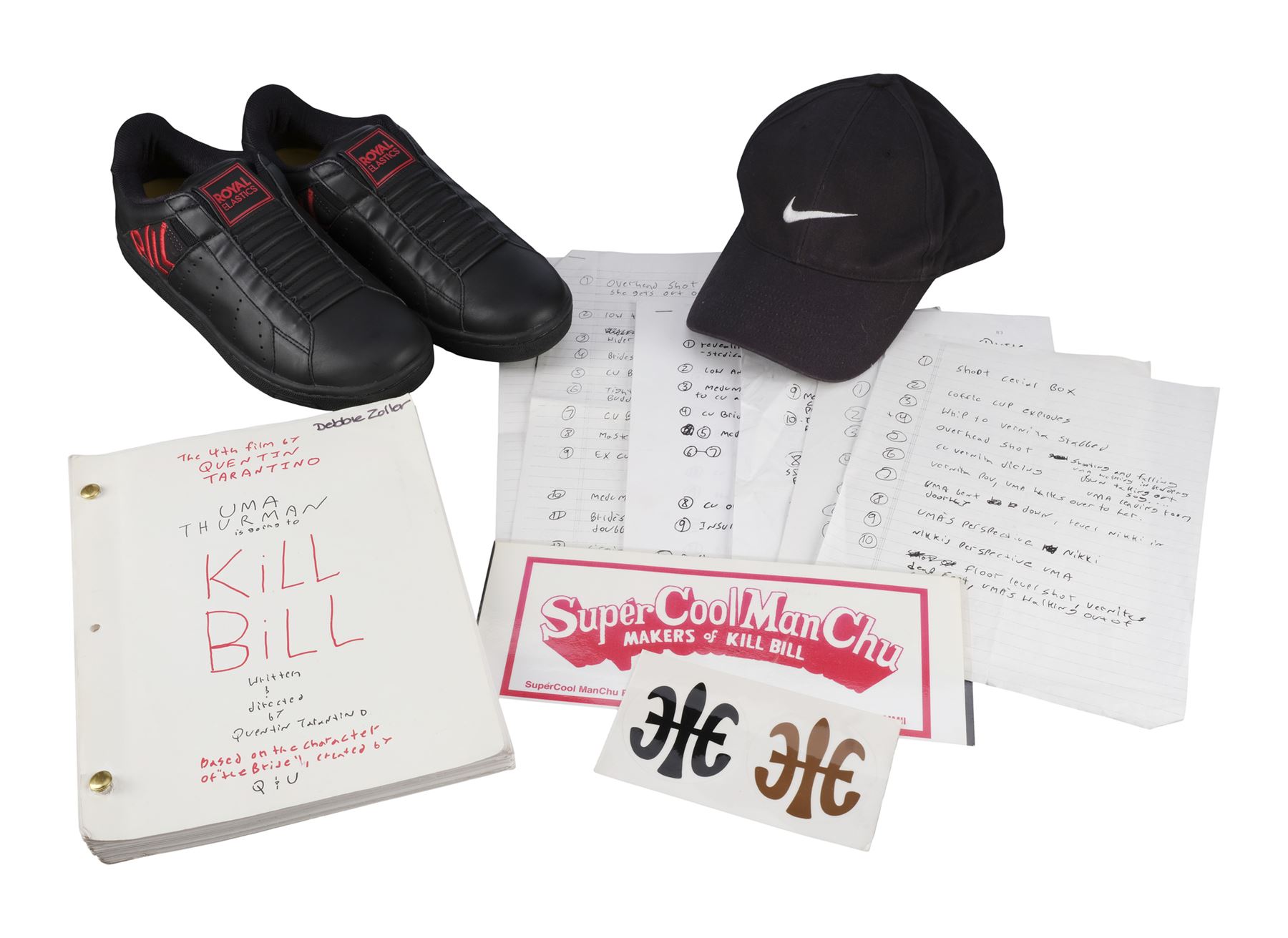 This lot consists of 29 photocopied sheets of shot and scene notes originally handwritten by Tarantino during production; a 198-page script with a unique cover listing Tarantino and Uma Thurman's names and marked "Debbie Zoller" for the film's key makeup artist; a red and white laminated "Super Cool Man Chu" parking placard marked "CAM express #2" on the back; a black cotton Nike hat with "Kill Bill" embroidered on the back along with the production logo; and a pair of black leather and rubber sole Royal Elastic shoes (Size 10 1/2 M) embroidered "Kill Bill" in red in an original box. The script also features printed annotations on pages 25 and 52. This lot exhibits grime on the script, fold creases on the notes, and damage to the shoe box. Dimensions: (largest) 8.5" x 11" x 1" (21.75 cm x 28 cm x 2.75 cm)