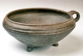 Northern Iran, Iron Age I - II, ca. 1400 - 800 BC. Large, carinated bowl with narrow flat rim is supported by three small feet that turn outward. The junction of the shoulder and the belly of the vessel are marked by three pronounced horizontal ribs of curved form. A single flat lug handle has been applied between the shoulder and rim of the vessel. Brown to grey in places, the interior and exterior have been well burnished to a smooth finish, exhibiting a soft sheen with the bowl subtly patterned with soft brown strokes.