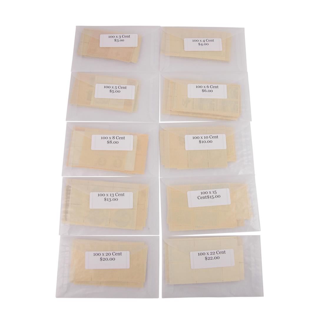 $106 in Face Value GENUINE Mint U. S. Postage Stamps. There are a variety of stamps in this pack and they range from 30-50+ Years Old and are Still Good for Postage should you wish to do so. This pack would be great for starting a collection, adding a little variety to your mail, for art projects, or just because. In the pack you will find 100 of Each Denomination 3, 4, 5, 6, 8, 10, 13, 15, 20 & 22 Cent stamps. Each Package Contains $106 Face Value in: Mint U. S. Stamps in Mostly Blocks of 4 with some Duplication.