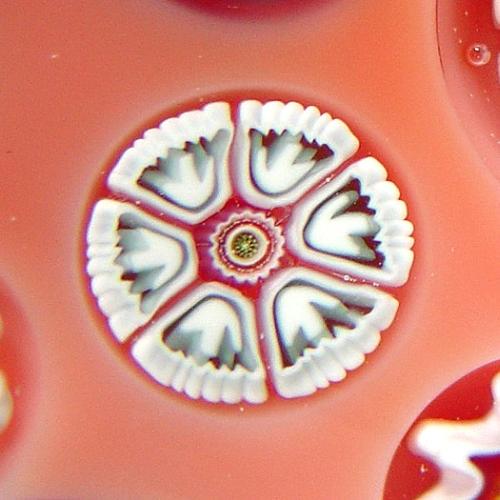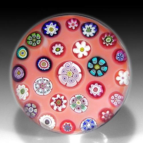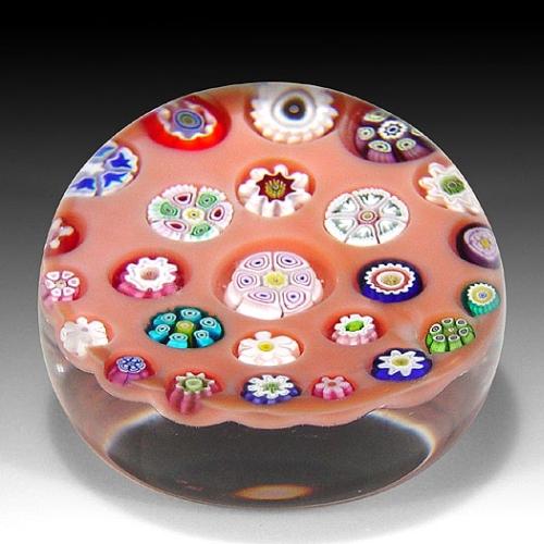 Julie Scrutton Lewis 1998 scattered complex millefiori paperweight, with canes in red, blue, green, purple, pink, turquoise, yellow, and white, on opaque pale peach ground. Signed/dated. Limited edition #2 of 25. Diameter 2 3/8". NO RESERVE