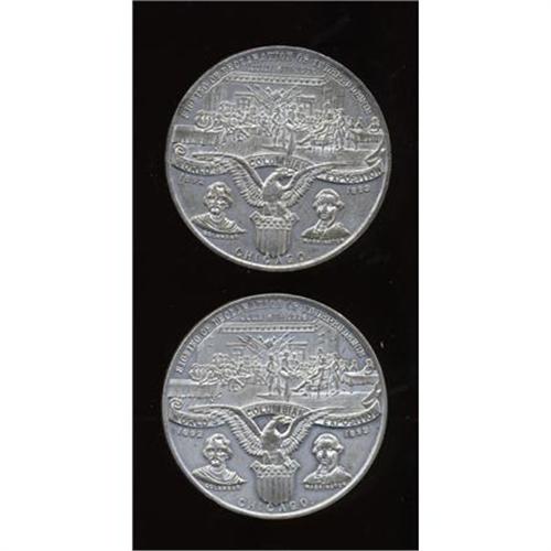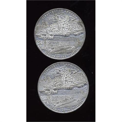 <B>Uncertified Pair of Columbian World's Fair Medals, Eglit-36a.</B></I> Eglit-36a. White metal, 58 mm, 61 gm. Obverse Columbian World's Fair, Columbus, and Washington, below, signing of the Declaration of Independence. Reverse discovery of America scene, below, landing of Pilgrims. Edge: Boldenweck & Co Pat'd Oct 7 1890.<BR><BR><b>Shipping:</b> Coins & Currency (<a target="_blank" href="http://www.heritageauctions.com/common/shipping.php">view shipping information</a>)