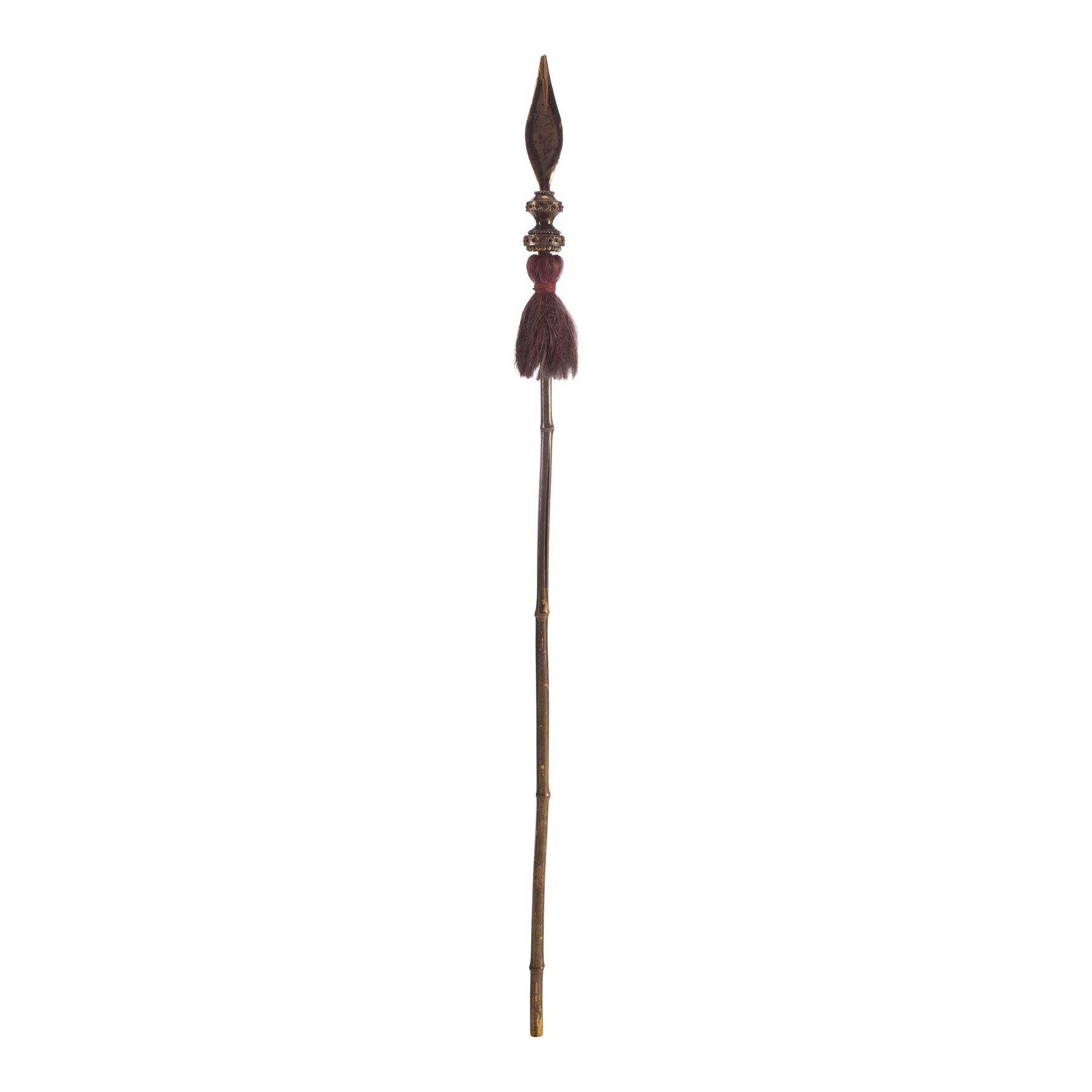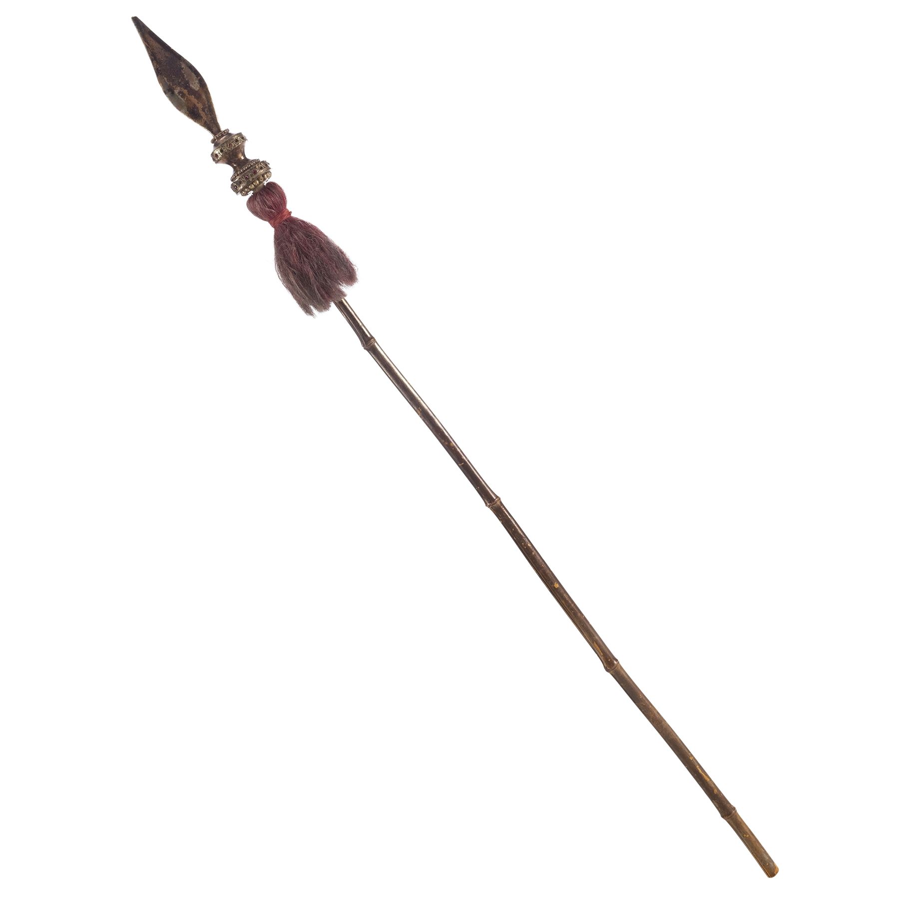 This spear is constructed from bamboo with a gilded wooden tip hand-painted to resemble gold, inset at its decorative base with faux red gemstones, and wrapped with a dyed red synthetic hair tuft. The bamboo is finished with a dark brown lacquer. The spear's tip exhibits splitting, revealing the wood inside, and the brown and gold-color finishes are both flaking from age. Dimensions: 49.5" x 4" x 4" (126 cm x 10.25 cm x 10.25 cm)