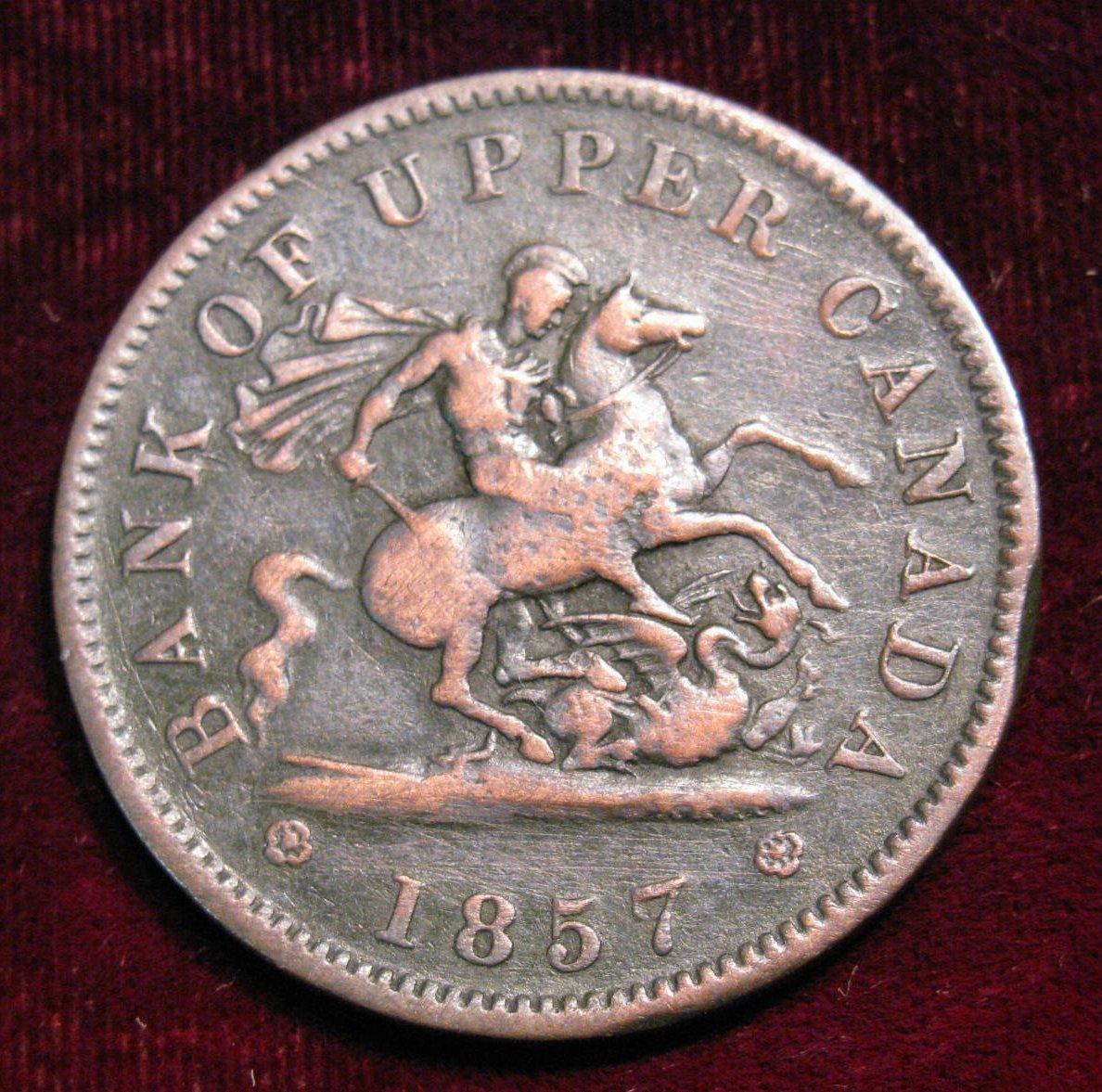 1061. 1857 Canada One-Penny Bank Token. King George Slaying Dragon.