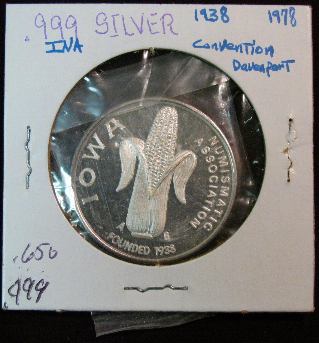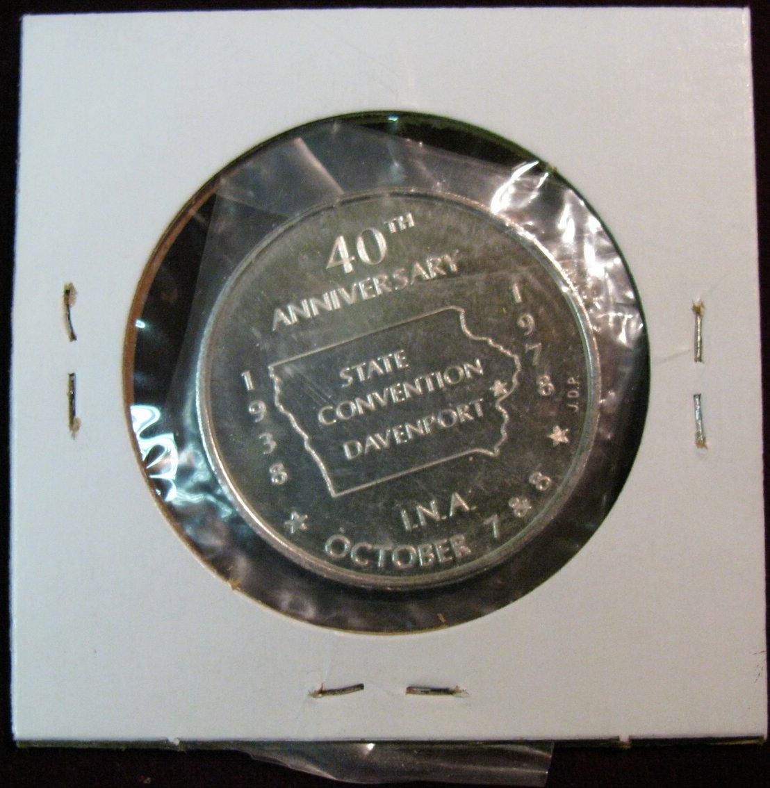 1067. 1938-1978 Iowa Numismatic Association .999 Fine Silver Proof Medal. Weighs .650 oz.