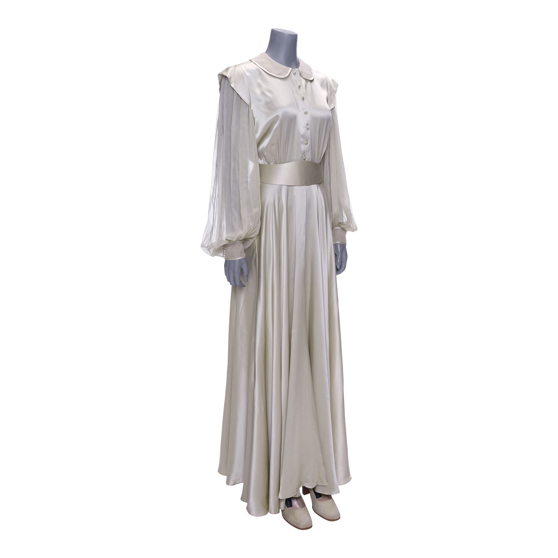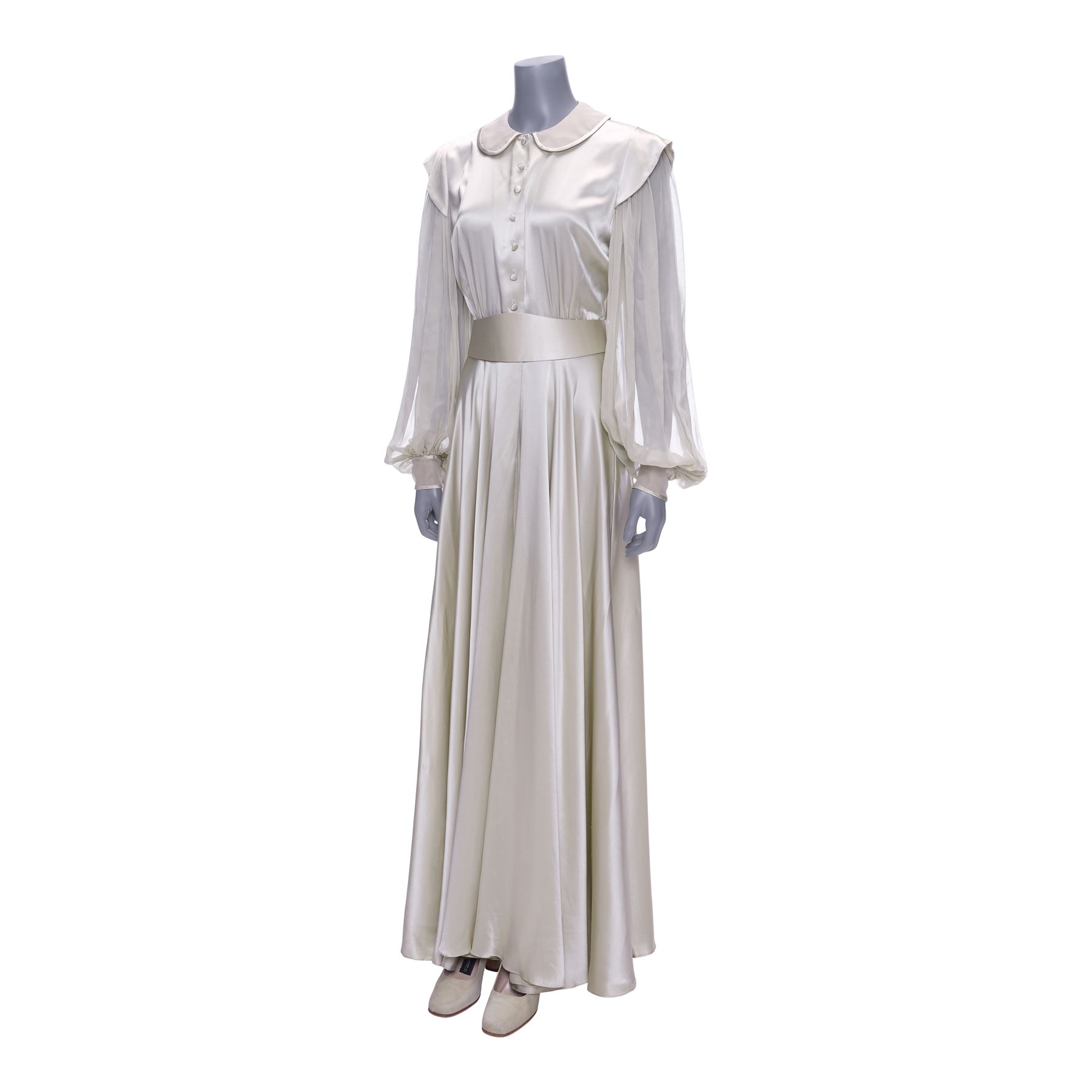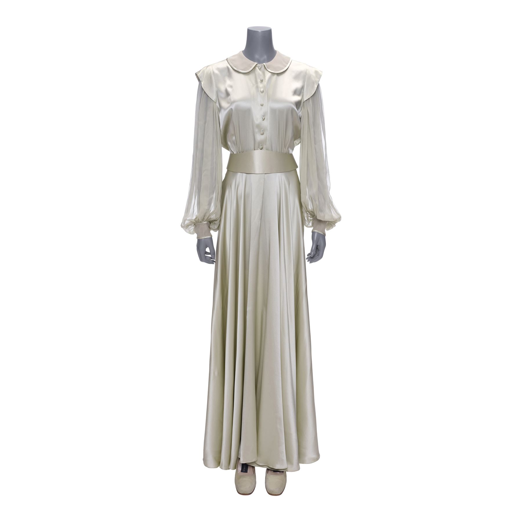 This lot consists of a green satin floor-length gown with long green chiffon sleeves; a white leatherette and green chiffon belt; a pair of green chiffon Andre pumps; and a color-printed reference photograph of the ensemble. The belt exhibits grime markings and the pumps exhibit scuffing from production wear.