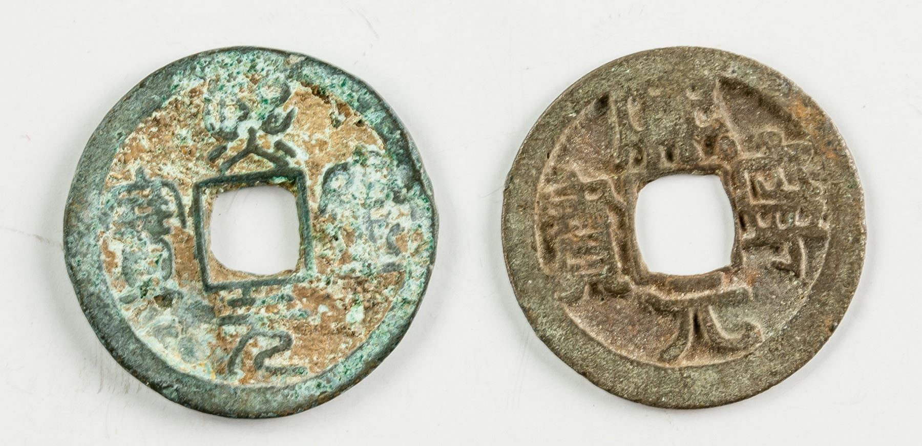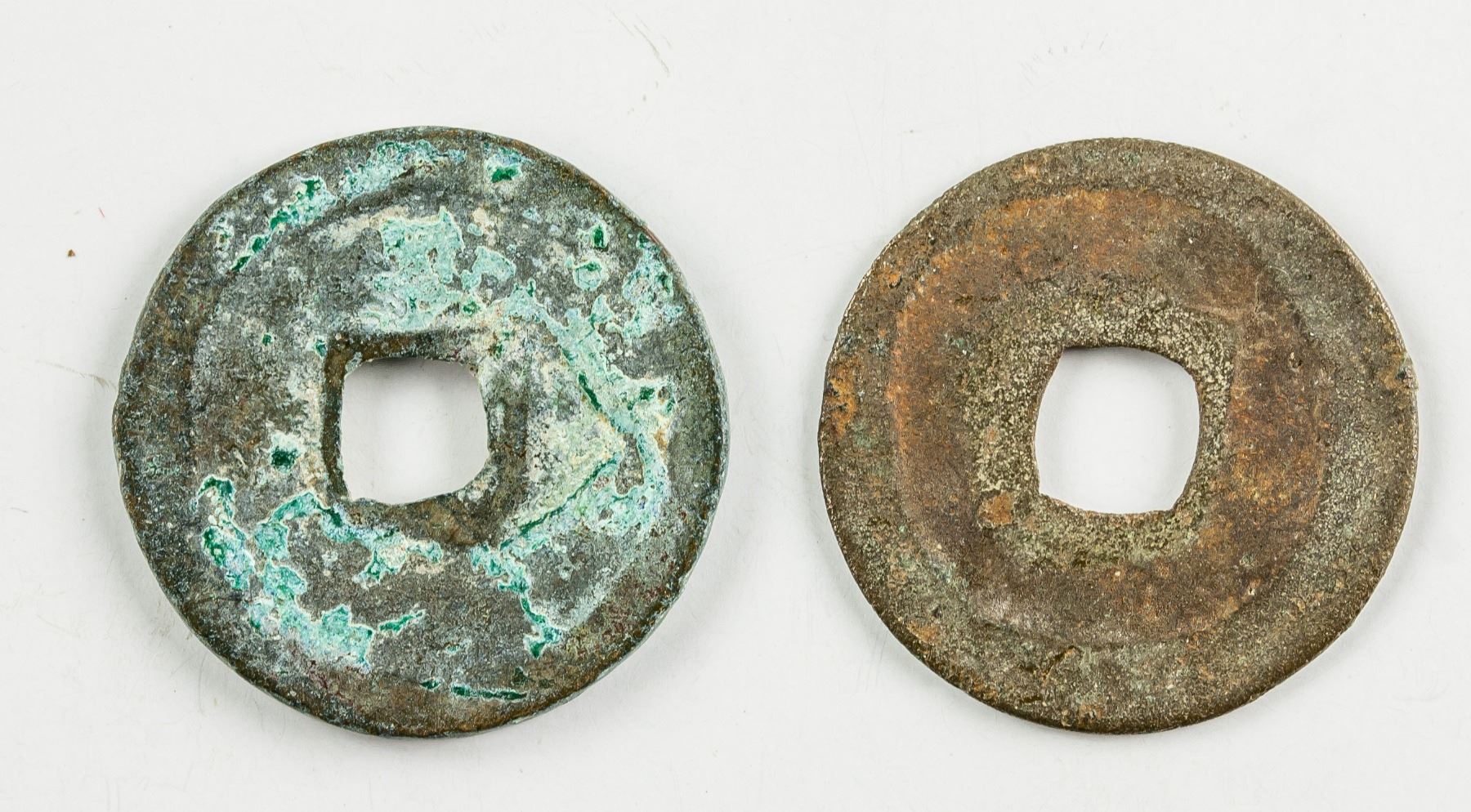 Two (2) 1068-1077 Chinese Northern Song dynasty 1 Cash bronze coins, obverse lettering Xi Ning Yuan Bao in seal script and regular sciprt, D: 23.1-23.7 mm, 6.5 grams total