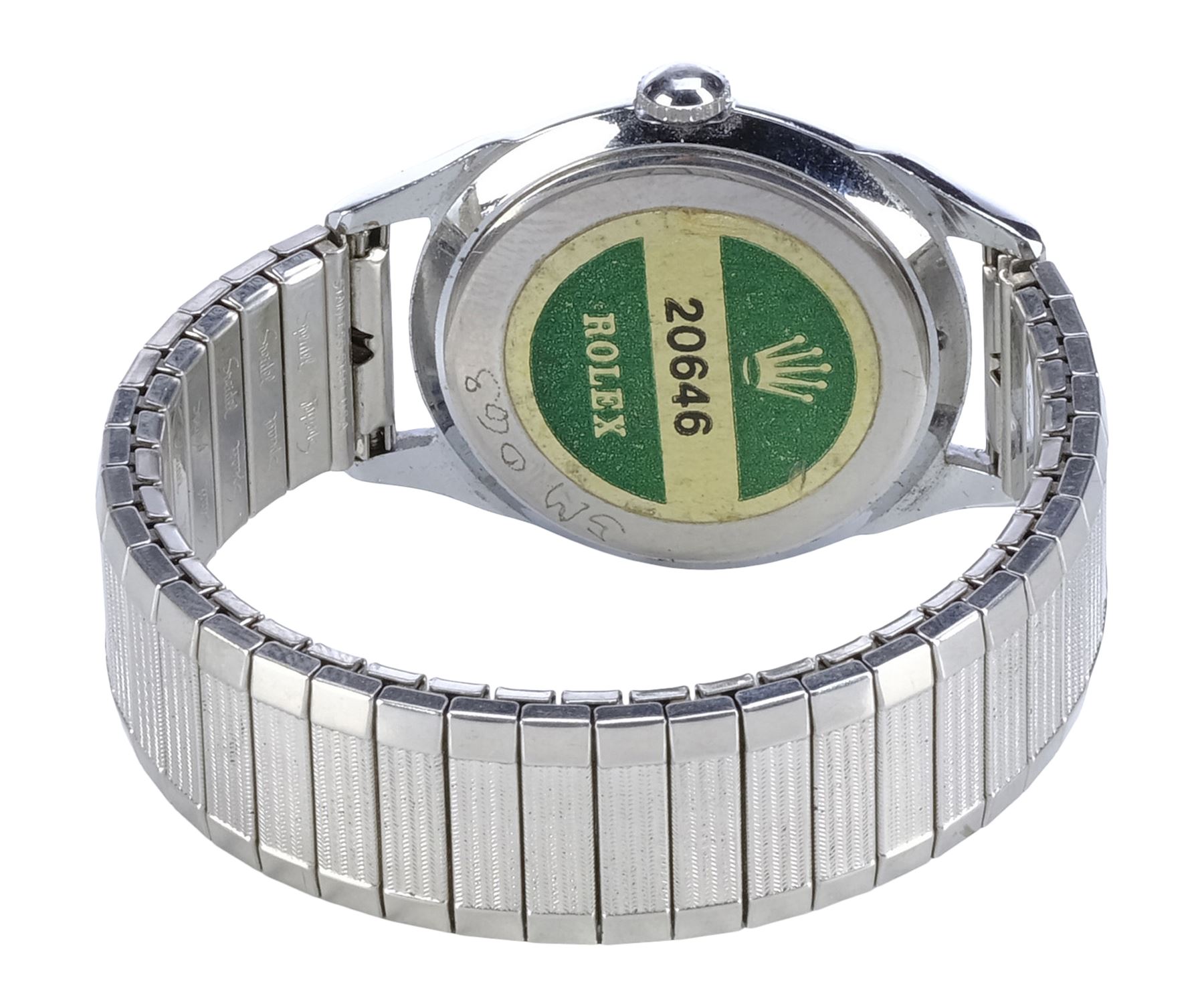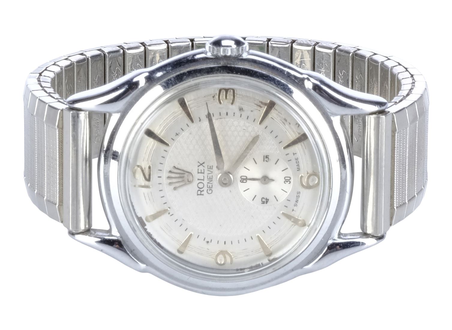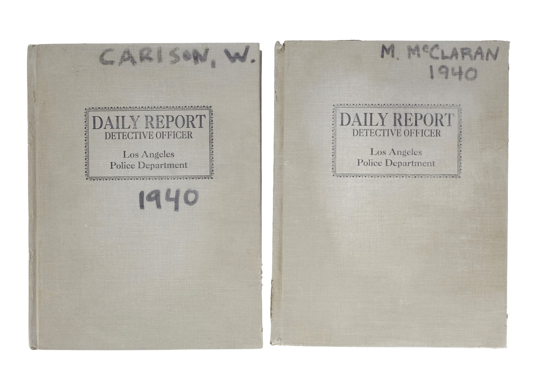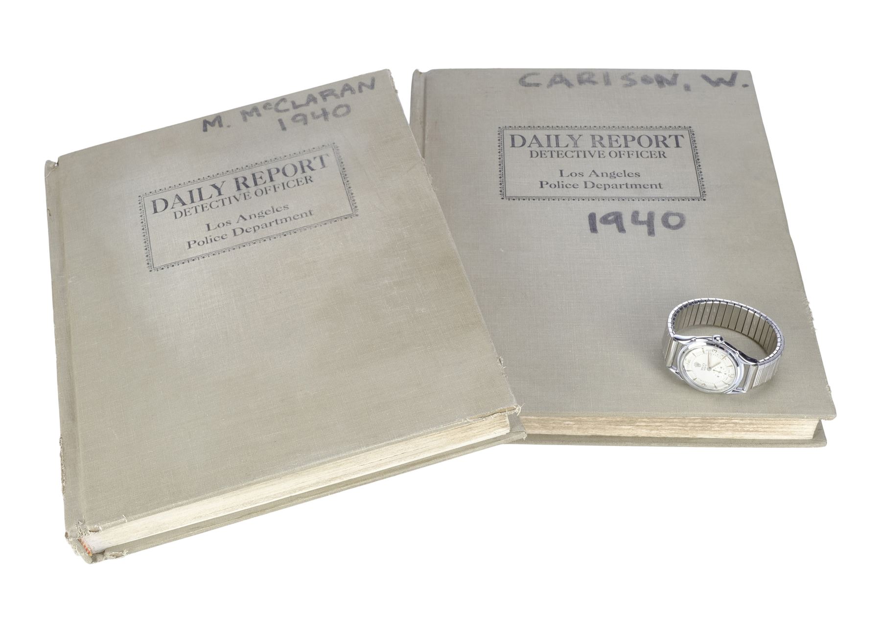 This lot features two report books and one silver-color metal Rolex watch. The books feature "1940," "Carison, W.," and "M. McClaran" hand-written in black ink. This lot exhibits book cover edge and spine fraying, discoloration from age, and mild tarnish on the metal. Dimensions: (largest) 8.5" x 11" x 1" (21.25 cm x 28 cm x 2.5 cm)