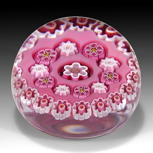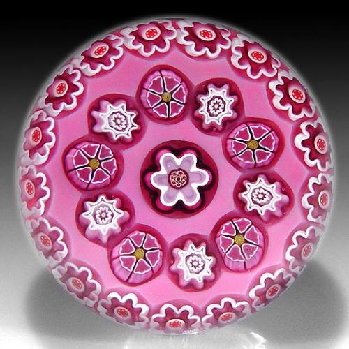 Julie Scrutton Lewis 1999 spaced concentric millefiori paperweight, with a pink edelweiss center cane, encircled by two rings of canes, on pink opal ground. Signed/dated. Limited edition #3 of 10. Diameter 2 1/4". NO RESERVE
