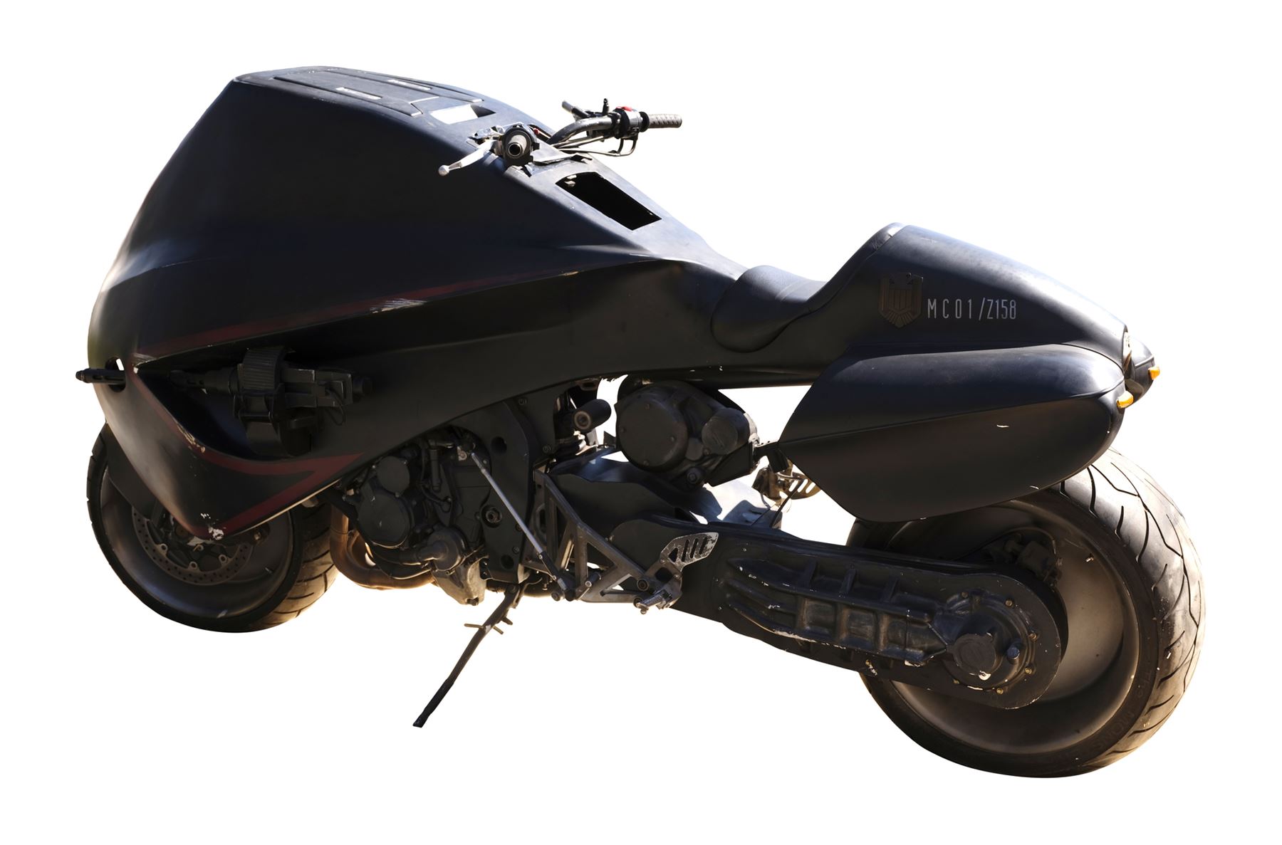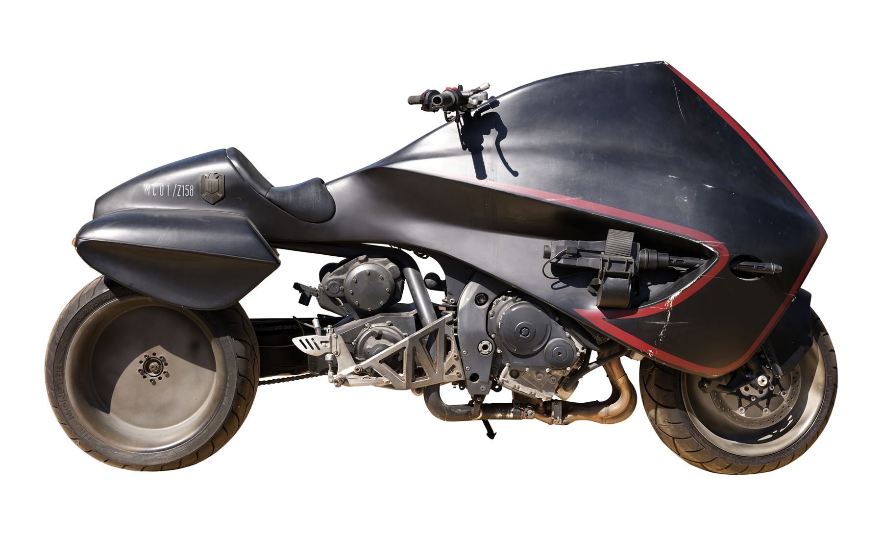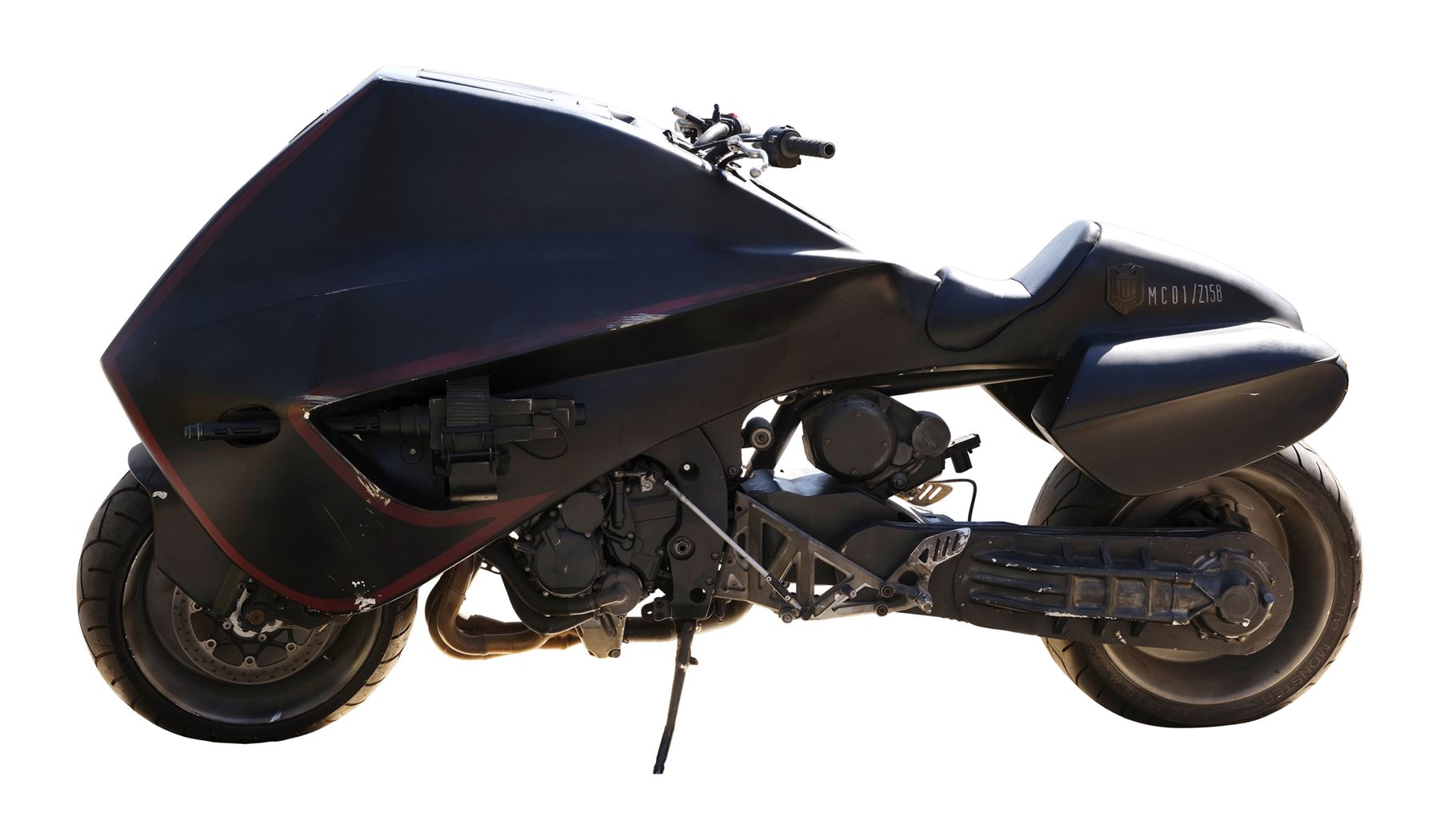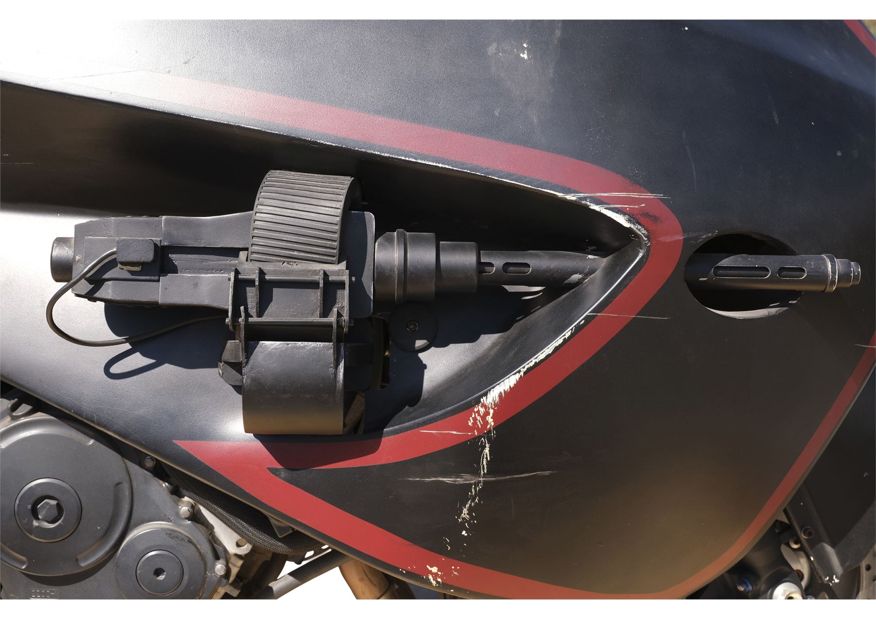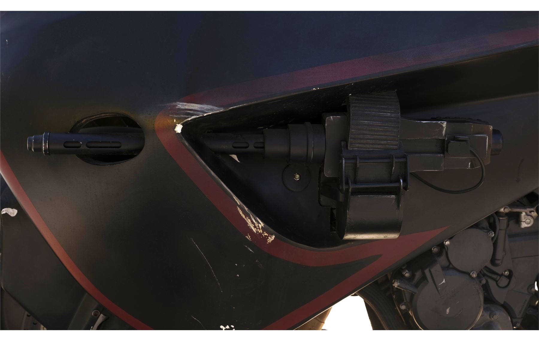 Only four drivable versions of these motorcycles were ever made for the movie, each of which was completely operated by the rider on set. Adapted from a Suzuki GSX 750s bike, this motorcycle has an extended fairing made of blue-painted fiberglass to give the bike its longer and high-tech appearance. The fairing also houses a custom nonfunctional machine gun weapon on either side constructed of rubber, resin and metal with a clear acrylic window at the very front to display LED lights.