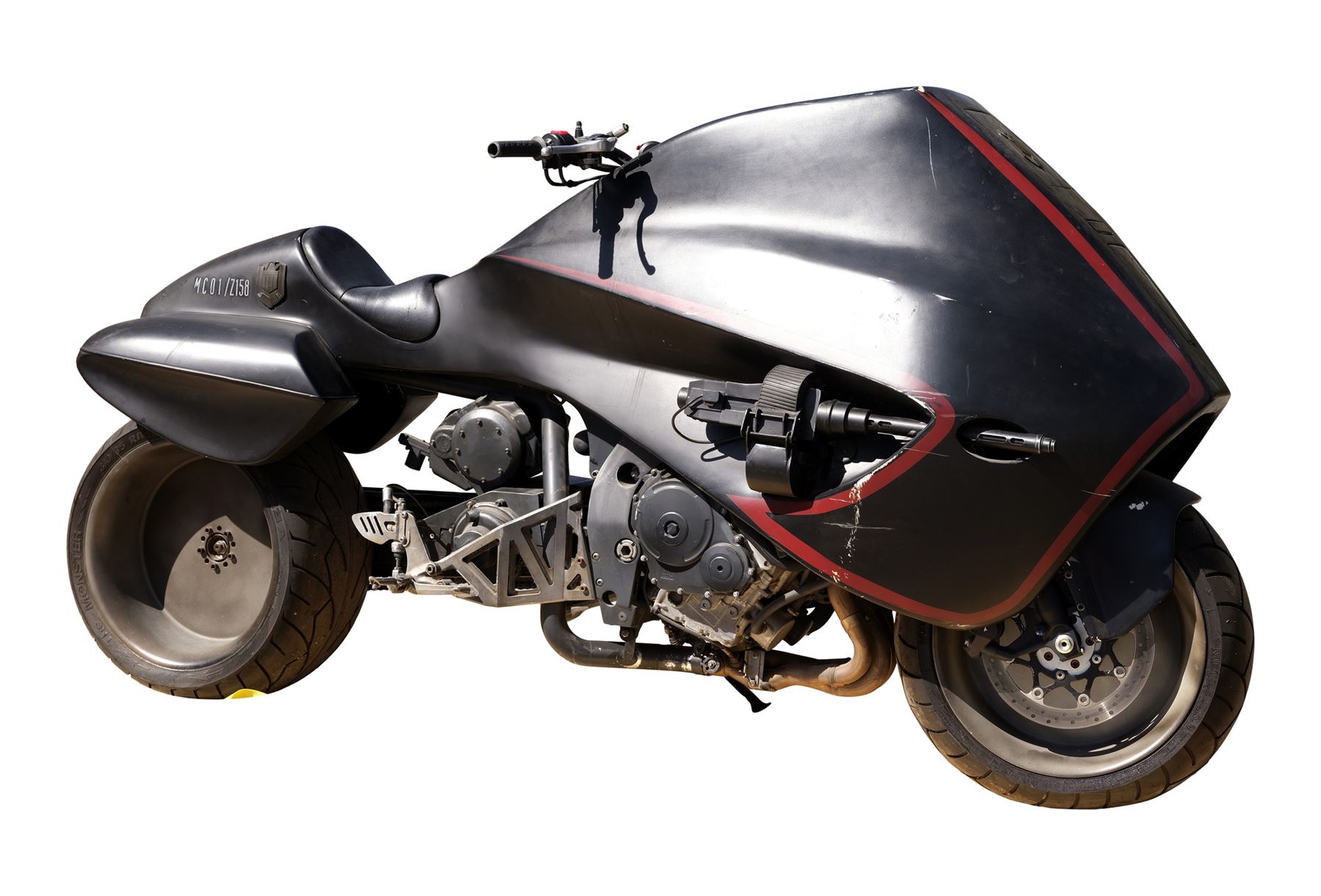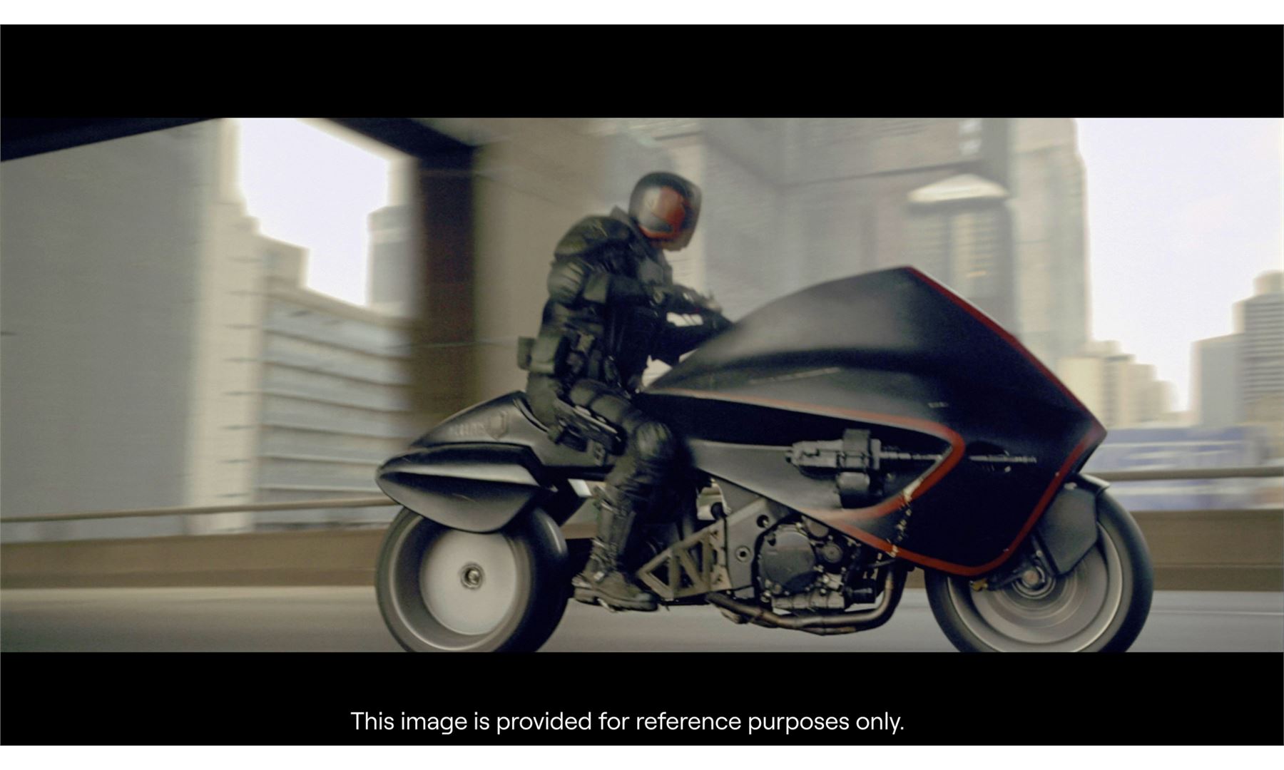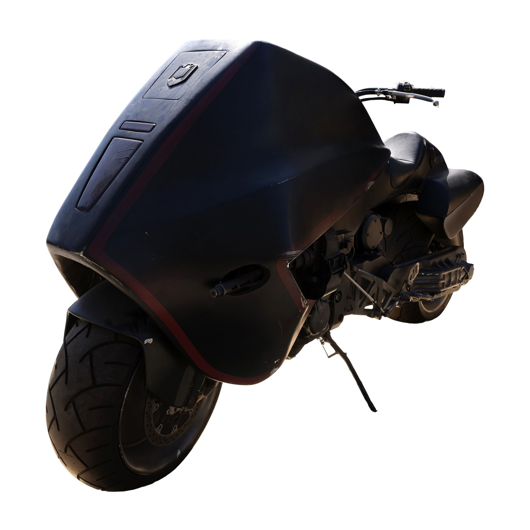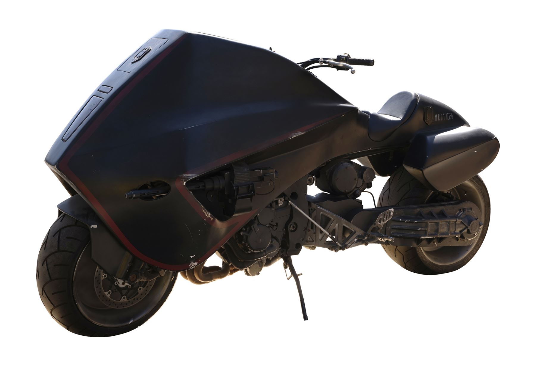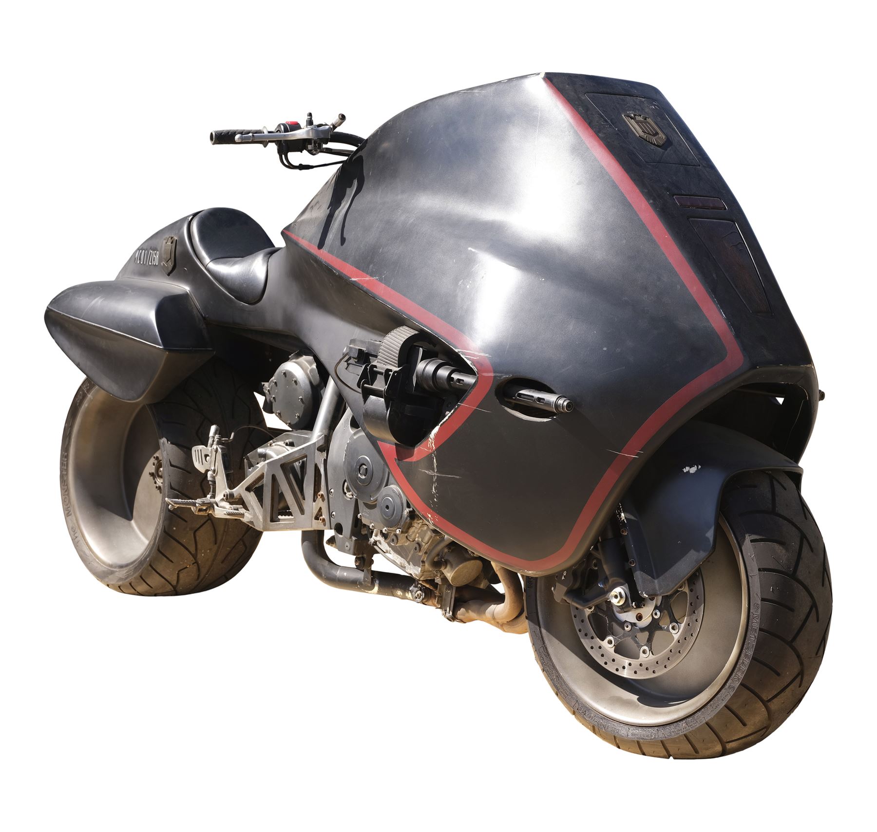 Only four drivable versions of these motorcycles were ever made for the movie, each of which was completely operated by the rider on set. Adapted from a Suzuki GSX 750s bike, this motorcycle has an extended fairing made of blue-painted fiberglass to give the bike its longer and high-tech appearance. The fairing also houses a custom nonfunctional machine gun weapon on either side constructed of rubber, resin and metal with a clear acrylic window at the very front to display LED lights.