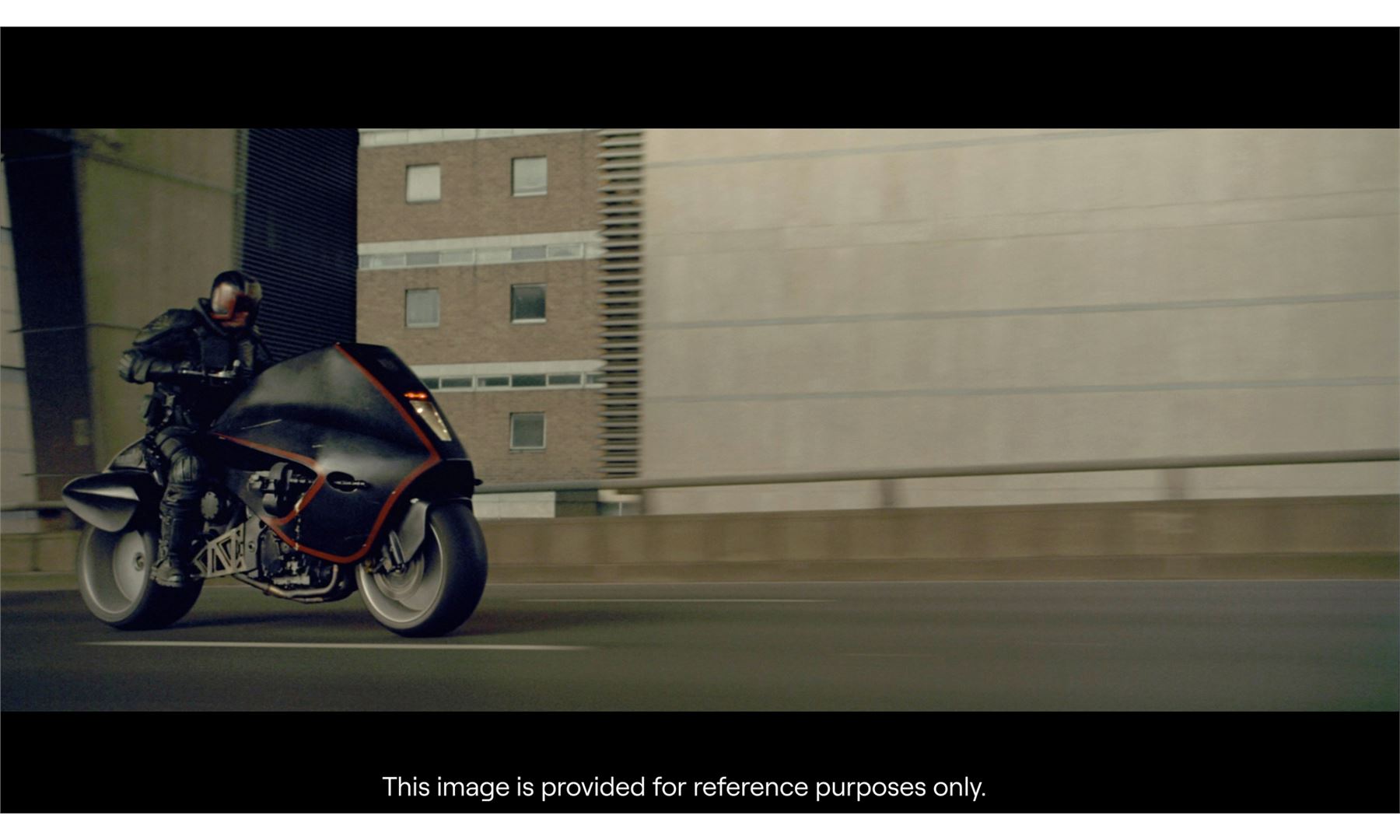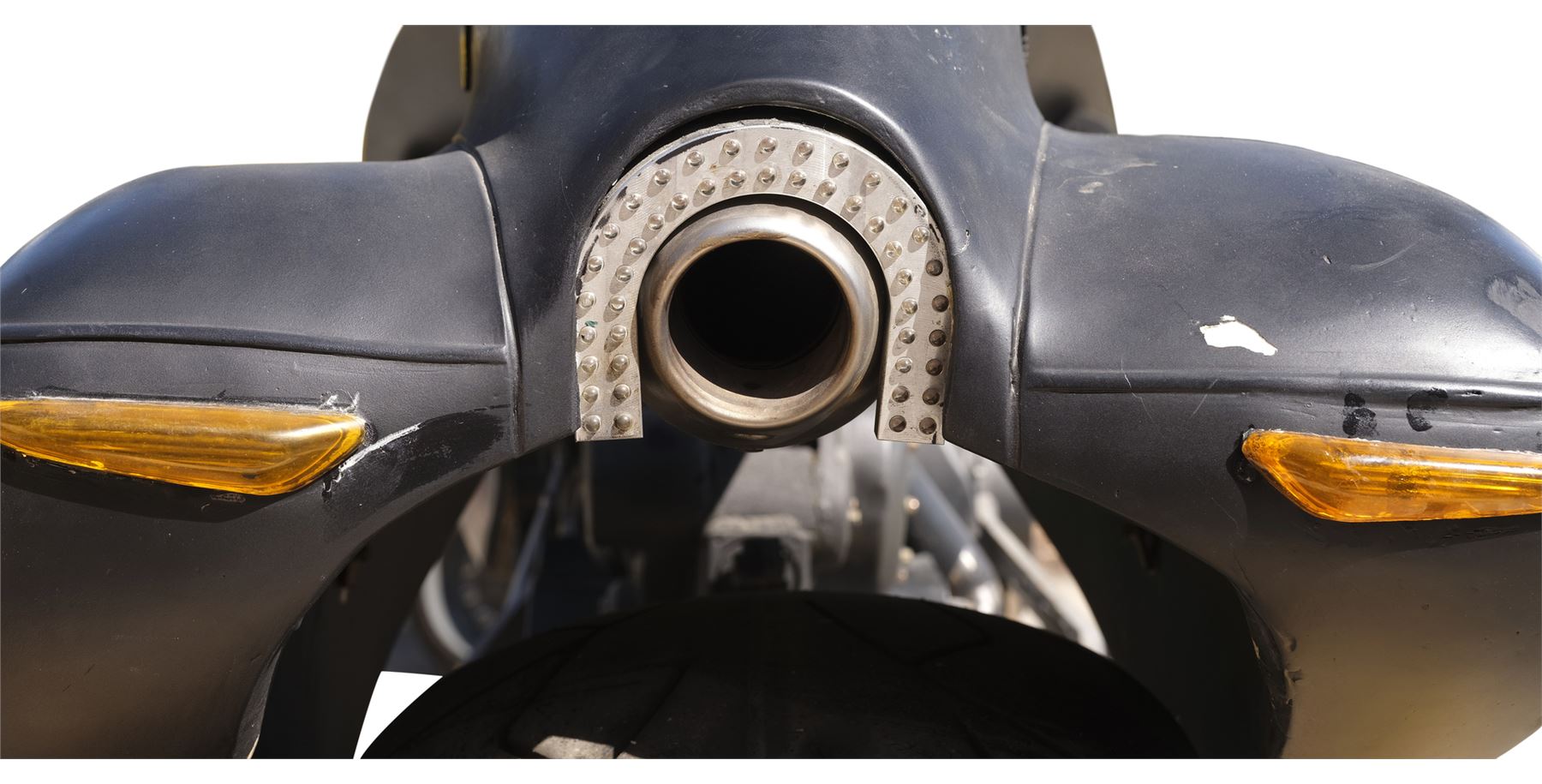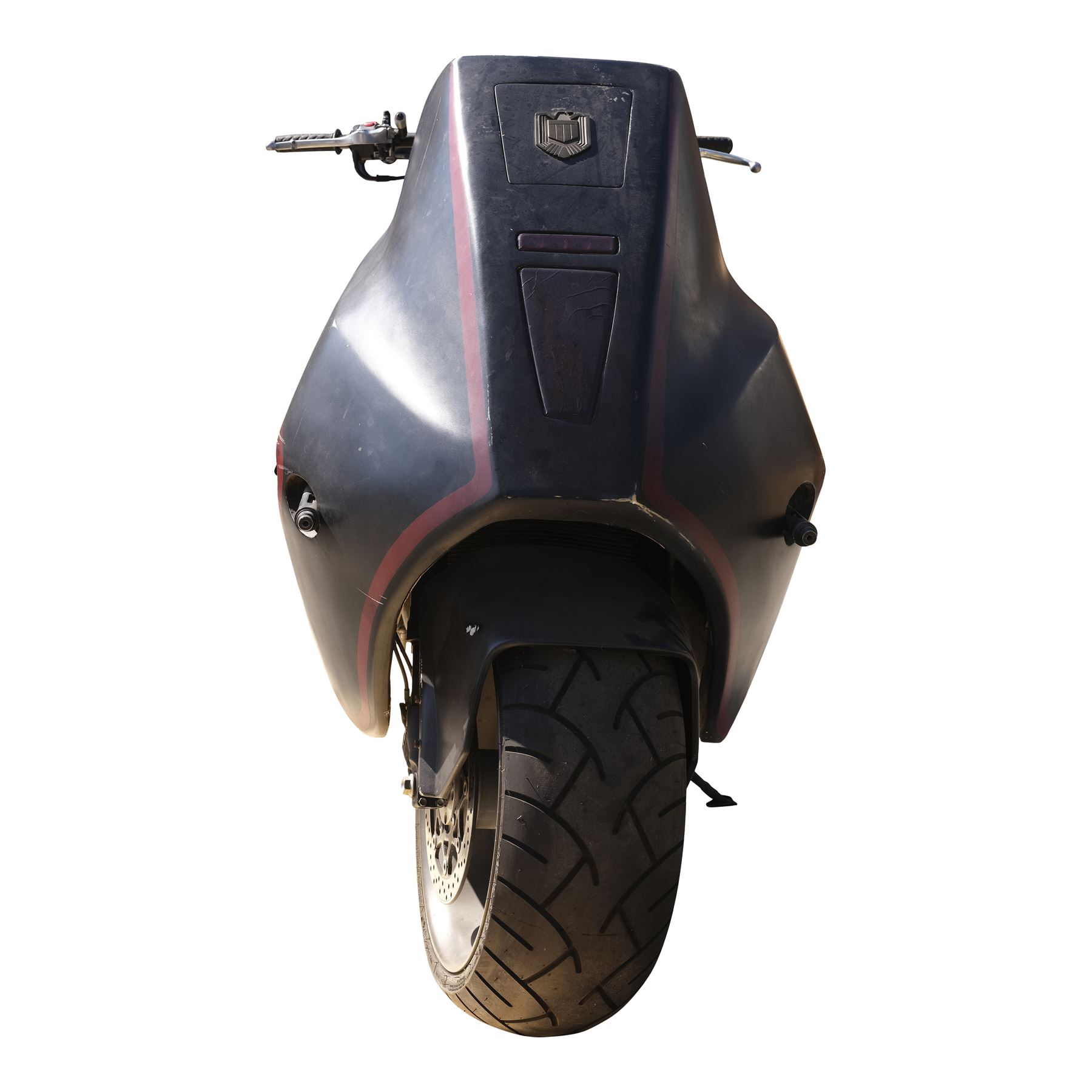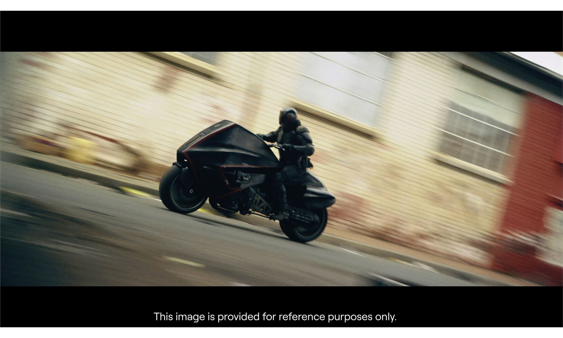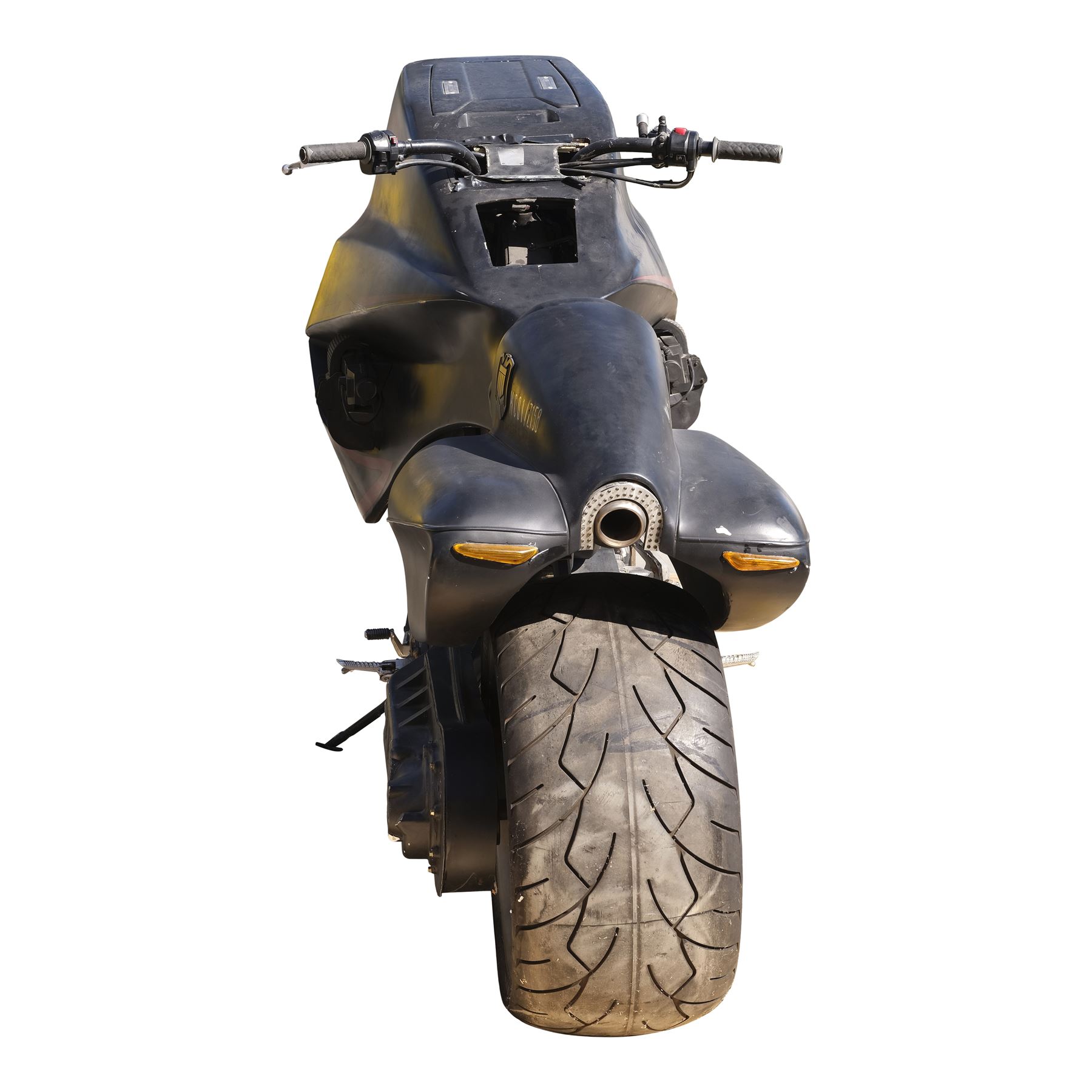 Only four drivable versions of these motorcycles were ever made for the movie, each of which was completely operated by the rider on set. Adapted from a Suzuki GSX 750s bike, this motorcycle has an extended fairing made of blue-painted fiberglass to give the bike its longer and high-tech appearance. The fairing also houses a custom nonfunctional machine gun weapon on either side constructed of rubber, resin and metal with a clear acrylic window at the very front to display LED lights.