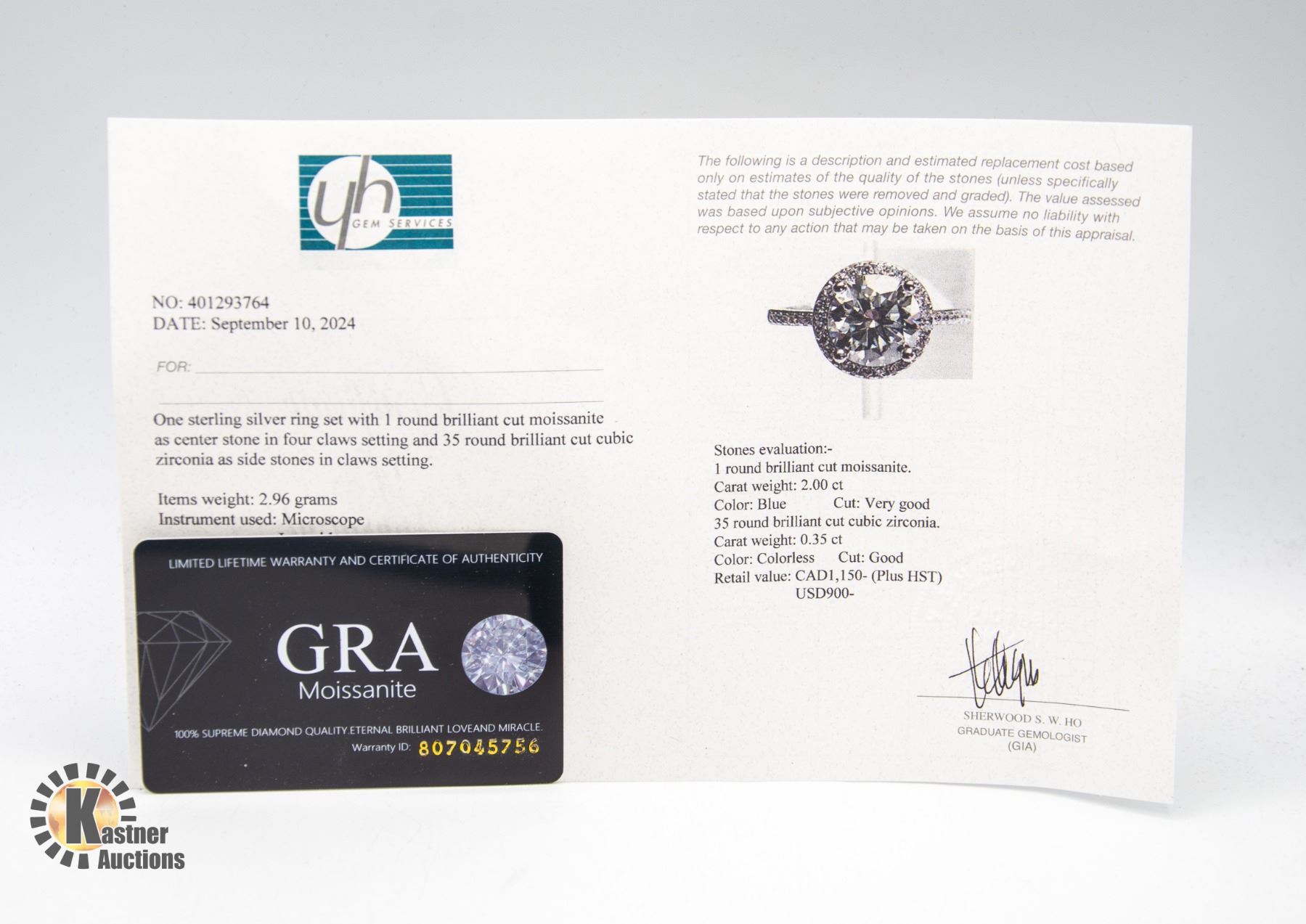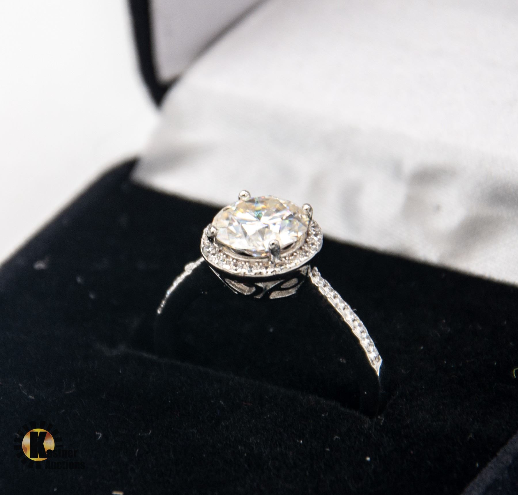 MOISSANITE STONE VVS D COLOR WITH 35 ROUND BRILLIANT CUT CUBIC ZIRCONIA SET IN ROUND HALO AND ALSO SET IN EITHER SHOULDER SET IN 925 SILVER RING SIZE ADJUSTABLE RETAIL VALUE $1,150.00