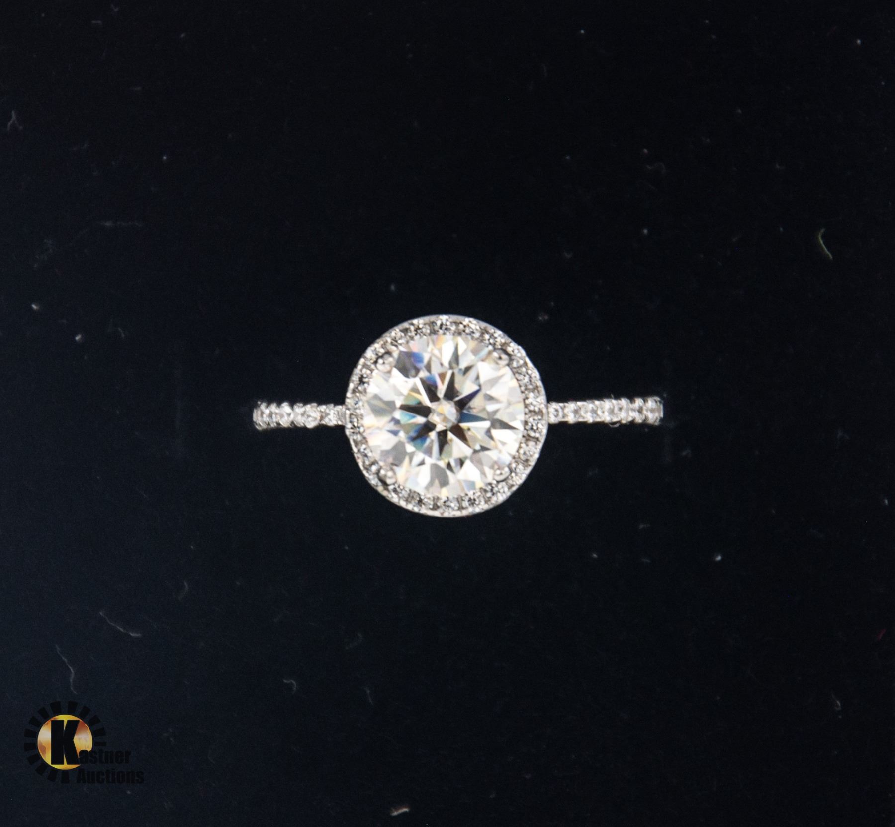 MOISSANITE STONE VVS D COLOR WITH 35 ROUND BRILLIANT CUT CUBIC ZIRCONIA SET IN ROUND HALO AND ALSO SET IN EITHER SHOULDER SET IN 925 SILVER RING SIZE ADJUSTABLE RETAIL VALUE $1,150.00