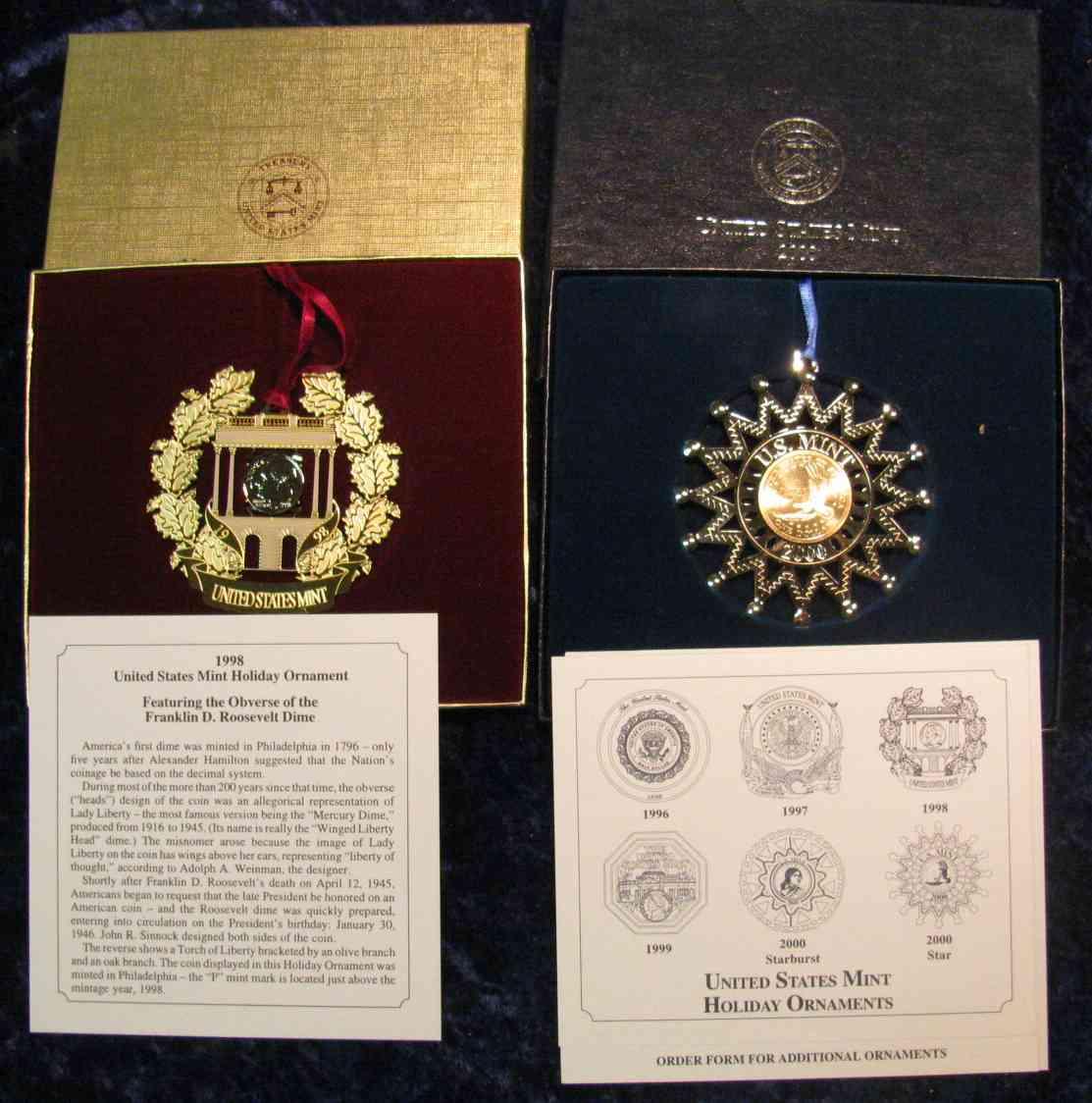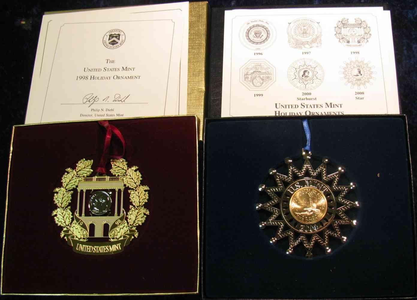 1072. 1998 & 2000 US Mint Holiday Ornaments. Issued at $18.95 Each.
