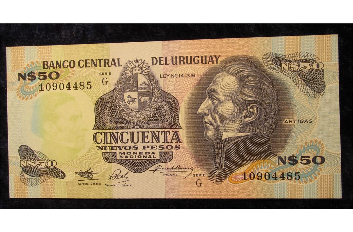 1072. Series 1975 Uruguay 50 Pesos banknote, crisp uncirculated and bright, selling for no less tha
