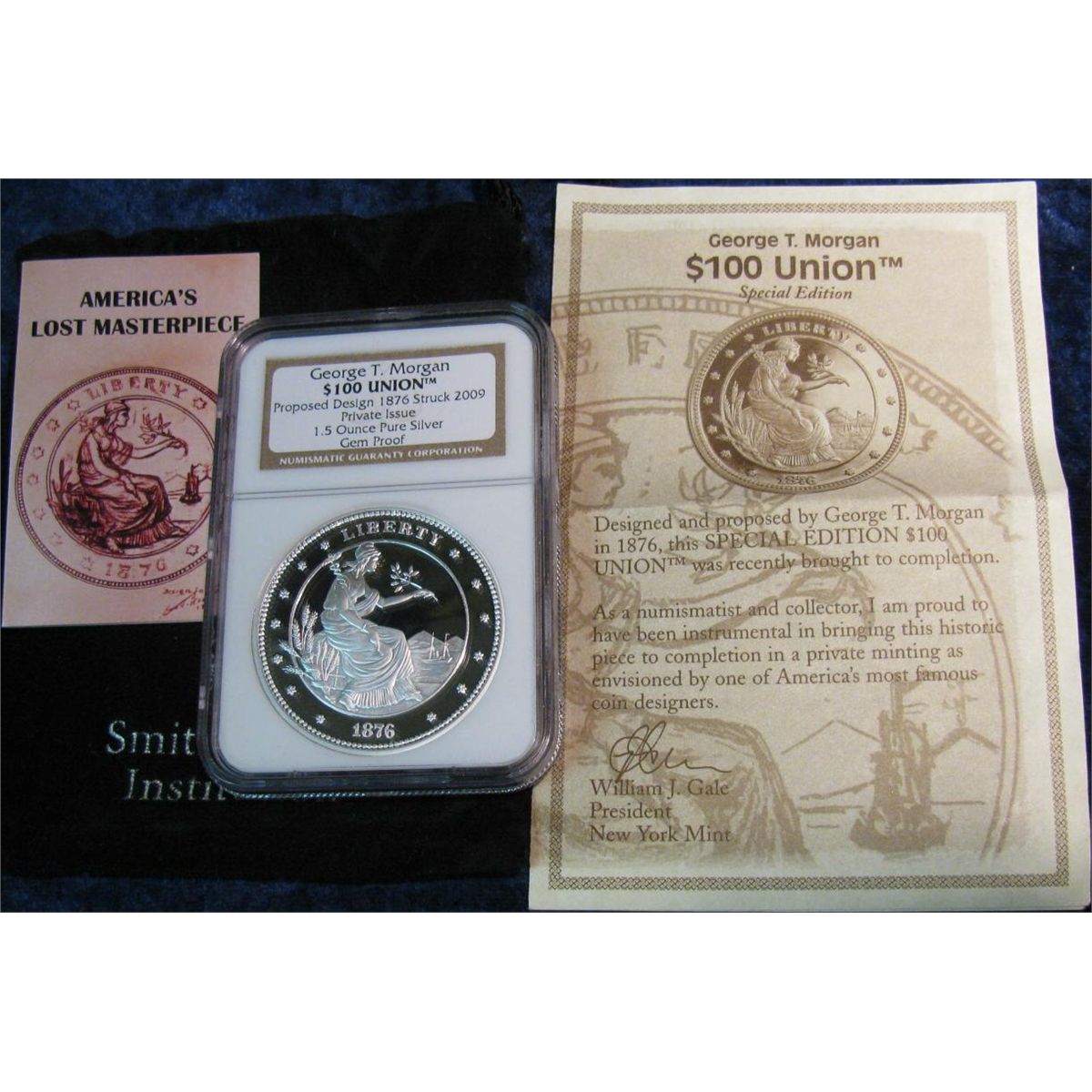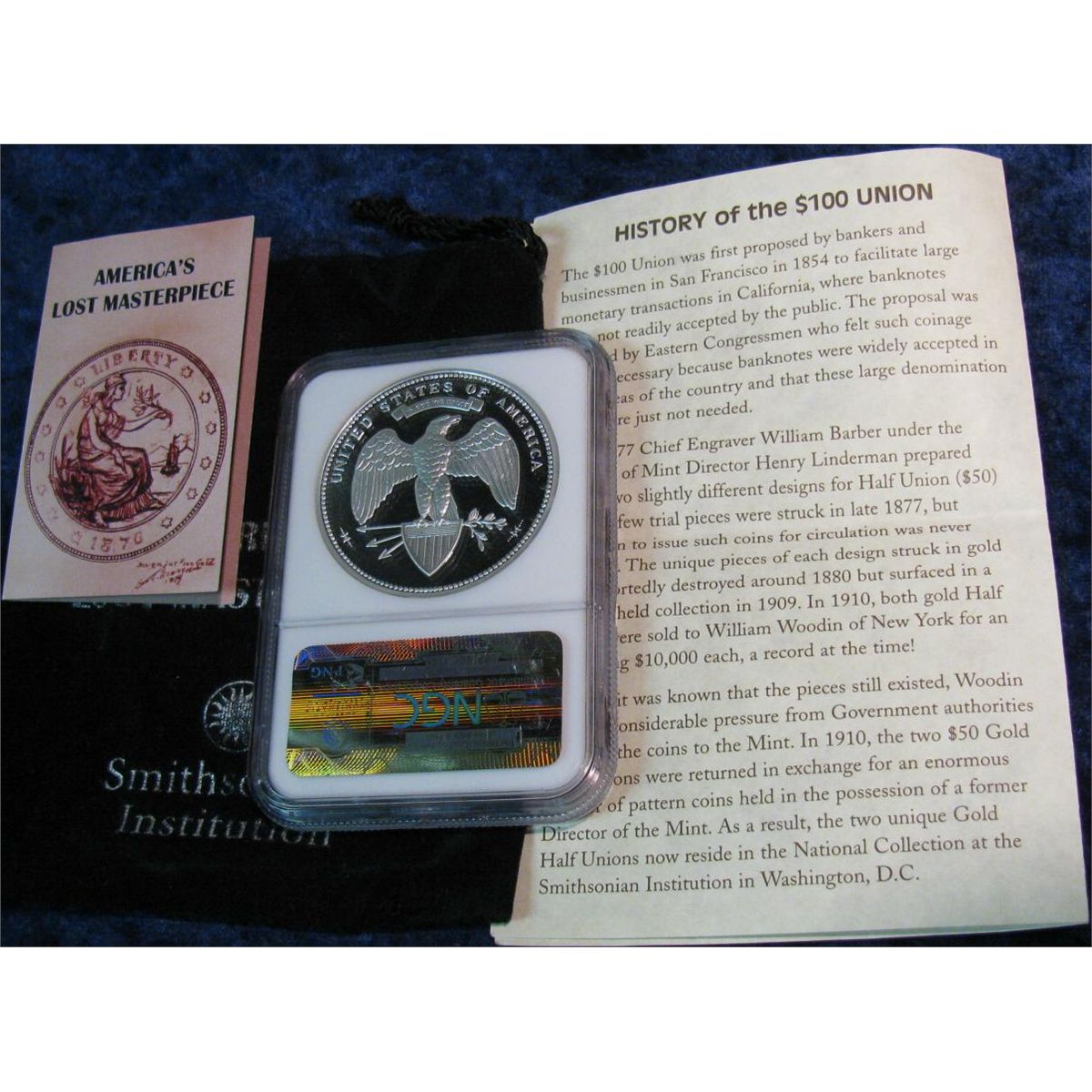 1076. 1876 Copy 1 1/2 Oz .999 $100. Union NGC-Proof Only 2009 Struck, Comes with Pouch and Cert. By the Smithsonian Institution.